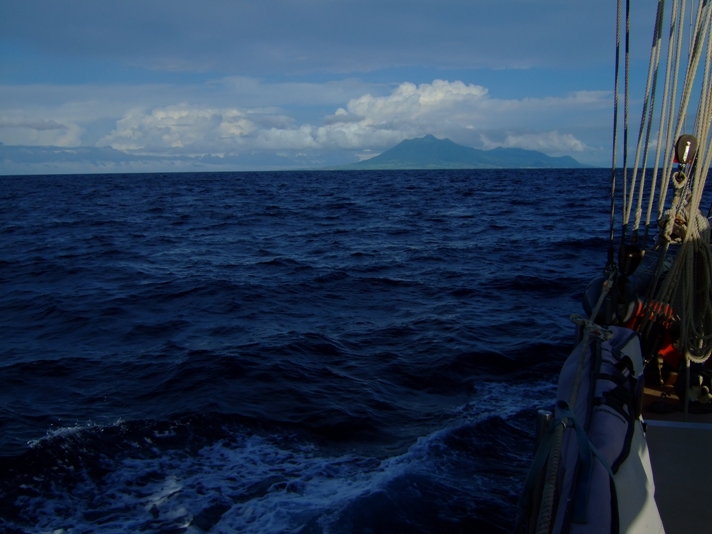 Today was the first day the crew got to experience a full day at sea. We all woke up in shifts as we worked in watch groups composed of three or four shipmates and one or two staff. Everything was done underway today, including mealtime, which was a great success thanks to Joe and Brad. The passage was pretty incredible as we all got to see what a 360-degree horizon looks like from dawn to dusk. We made our destination at 2100 with the dark shape of Nevis looming ahead.