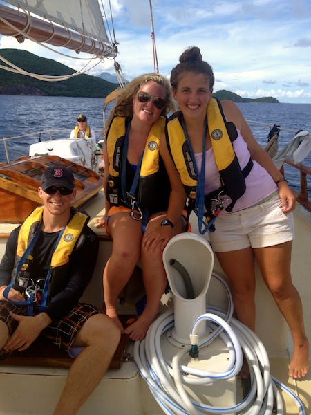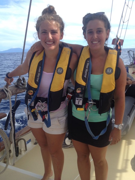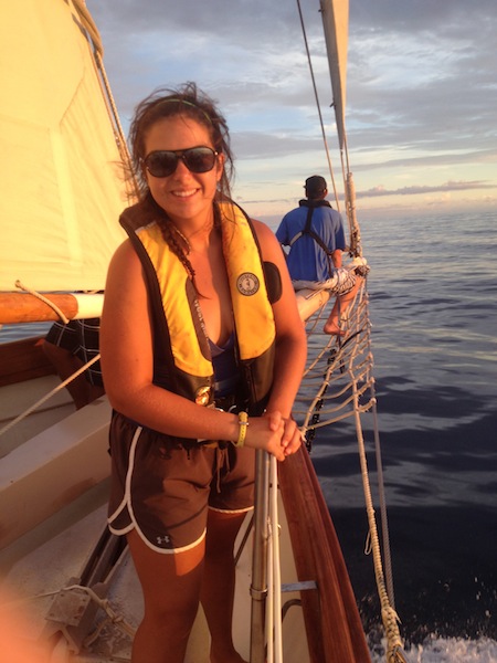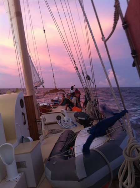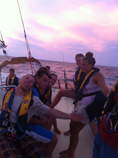 Day two of our passage to Grenada. Last night was chilly enough to wear pants and sweatshirts. Today contained patchy amounts of wind, but as it got later, the wind picked up, and the waves increased. Most people slept during the day between their watch shifts despite the heat in the cabin and the motion of the waves. We ate a great lunch of baguettes, salami, and cheese, which we bought at Les Saintes. We all preemptively took Dramamine or Bonine, seasickness pills, but by lunch, the effect had worn off, and we were surviving solo; no one got sick. Aside from sleeping, the crew was spotted studying Marine Biology and Oceanography in anticipation of a few upcoming quizzes and tests. Later, a fish and chips dinner was set out at the chart house. We watched it carefully during squeeze to make sure the dinner array didn’t slide overboard as the boat pitched back and forth and heeled over.