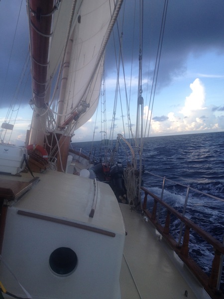 Night watch commenced, and as it got dark, we clipped ourselves onto the jack lines. The darkness made visible the bioluminescence in the water, stirred up by the wake of the boat. The waves pitched the boat back and forth, the largest causing a soft thundering sound that could be heard from any location on the boat. The three hours of watch on deck varied from still calm sailing, sometimes motoring, to the occasional burst of rain and wind that sent us scrambling to sheet out the sails. During the times when the sky was clear, time was marked by the stars shooting across the sky. Real-time was marked by the hourly boat checks, including checking the engine room. As we crawled through the hatch, the heat hit us like a wave, and the roaring sound of the engine drowned out the waves. Some people love checking the engine room; others do not as much, but it’s necessary to make sure everything is running smoothly. After the full check was completed, the bilges were inspected, the galley and salon 40/40’d, and the heads on a ‘dry bowl’ so as not to cause the boat to flood. It was time to return on deck. Then, the final haul up the companionway and into the fresh air to rejoin the team in the near silence of the ocean at night. The best way to describe it is timeless.