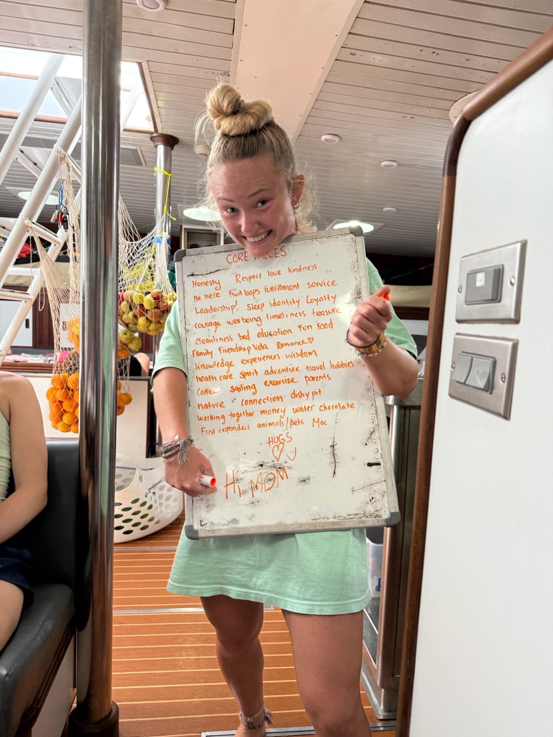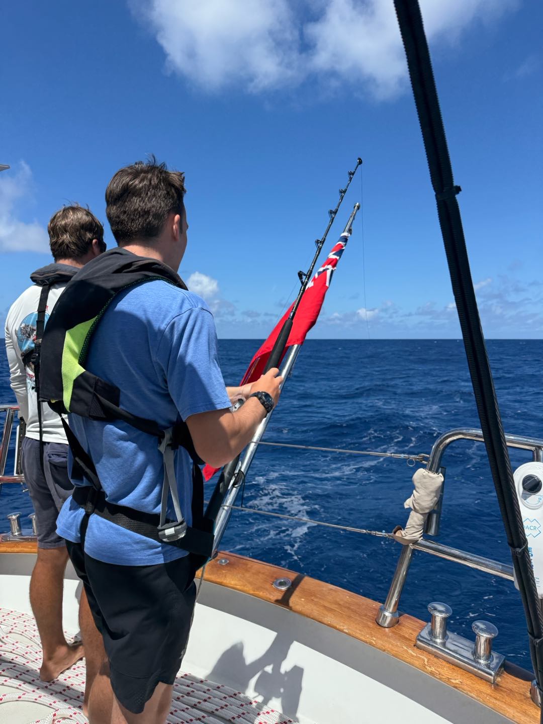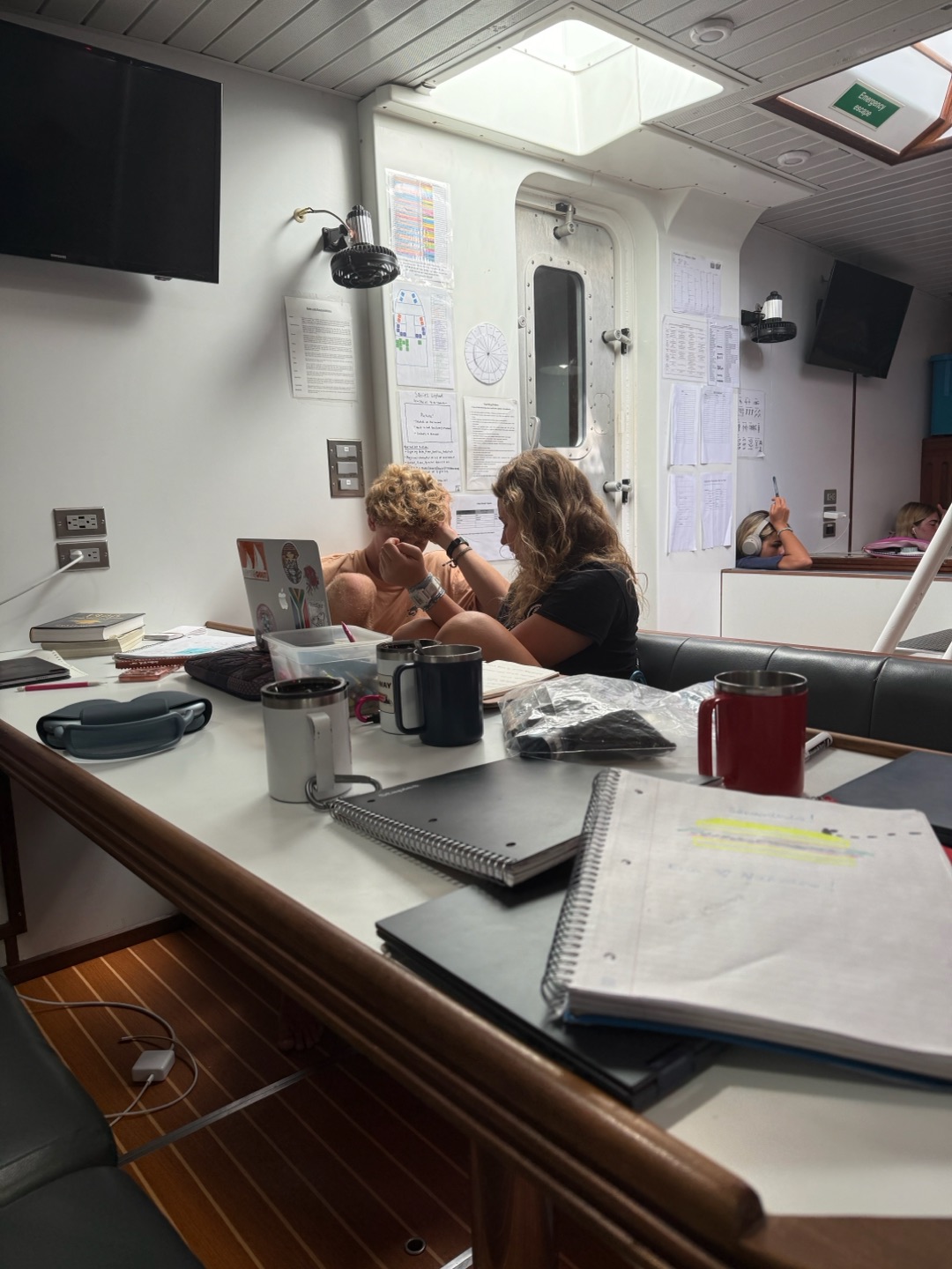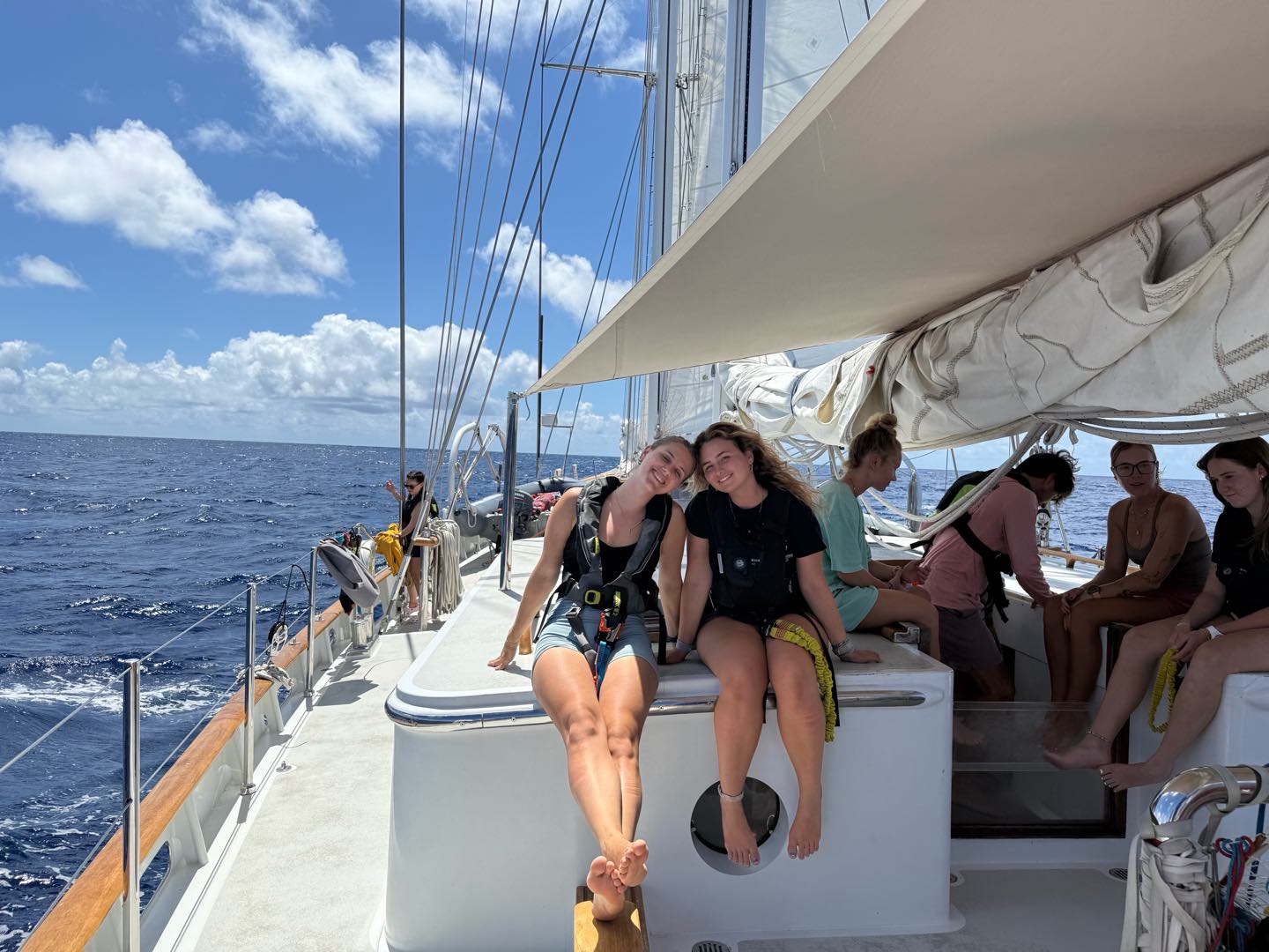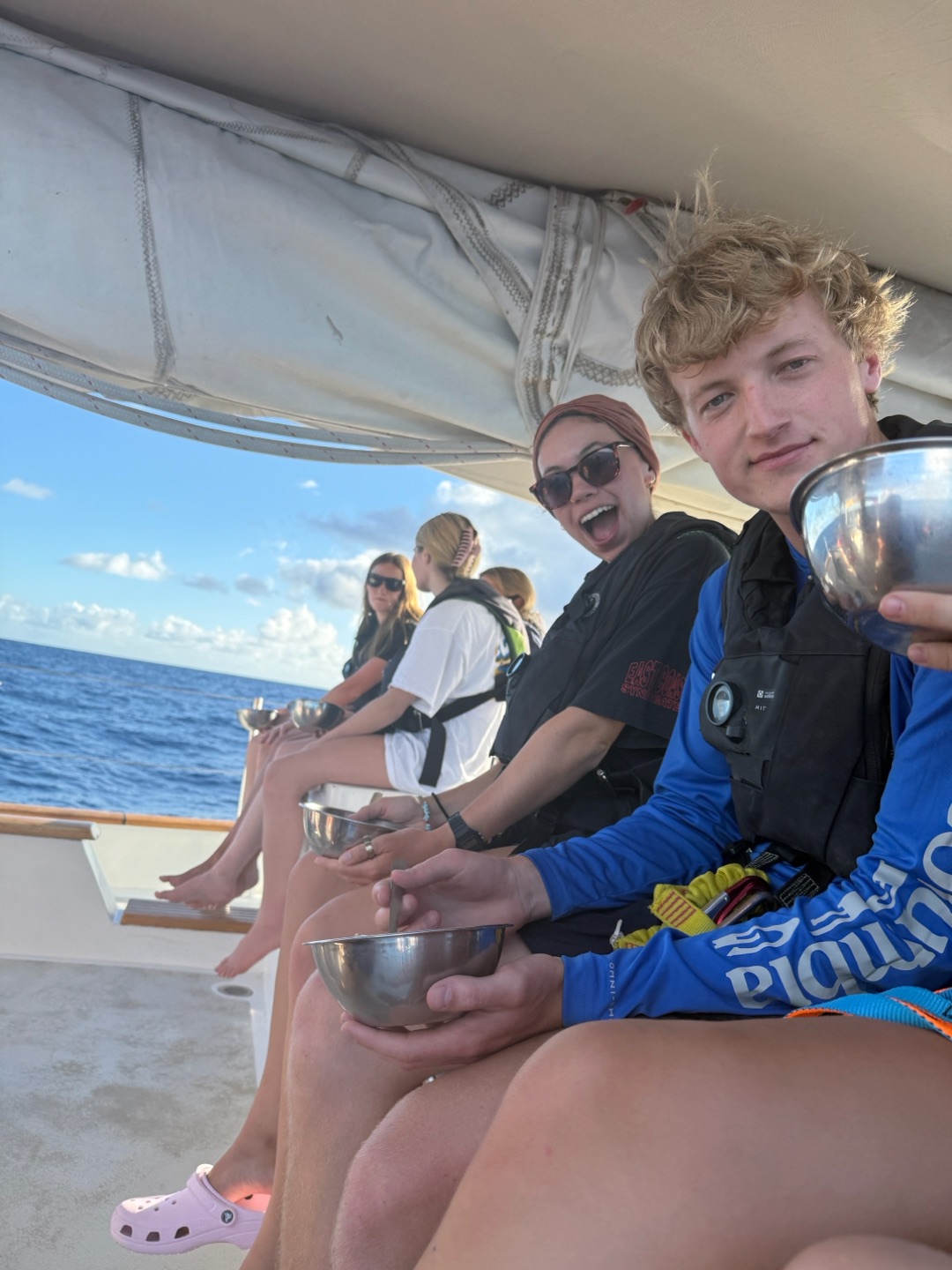 Dayyyy, 6ish I think, the passage starts out with watch team three (Emma, Perry, Alexa, Reed, and me) on 12-4 watch. It was great, we covered lots of important things like paw patrol and Portugal. The stars were also really pretty before the moon came up, and you couldnt see them anymore. Shoutout watch team two( Zoe, Kyler, Vittoria, Erin, and Hannah) for fixing our heads(bathrooms) while we were asleep. Apparently, it was quite the ordeal, lots of salt water everywhere. Fast forward to lunch time, Grant and Perry made a really great buffalo chicken bake and potatoes with cauliflower. Then we set back our watches by an hour cause we crossed a time zone. Before class, watch team three went out and flaked the jib really nicely. The jib is one of the sails above the net at the bow of Vela and flaking is folding it up as you take it down. Then we had Plate Tectonics taught by Perry and Leadership by Emma, which were both great lessons, only interrupted once by a fish, which we lost cause the fishing hooks were bad. We all spent the afternoon studying for our first test, which is tomorrow. Its the ICC, which will also be our first certificate for International Crew Competency. We needed a bag of Fruit Loops to keep us going, but overall it was pretty successful. Dinner was lasagna, beautifully prepared by our chefs. My squeeze question of the day was what would you pick out of Books, Music, Movies, or Shows, and we got a majority vote for music, I would say. Watch team three is ending the day the same way as we started, with a watch from 8-12, its gonna be great! Hoping all is well back home:) love lots Nashota