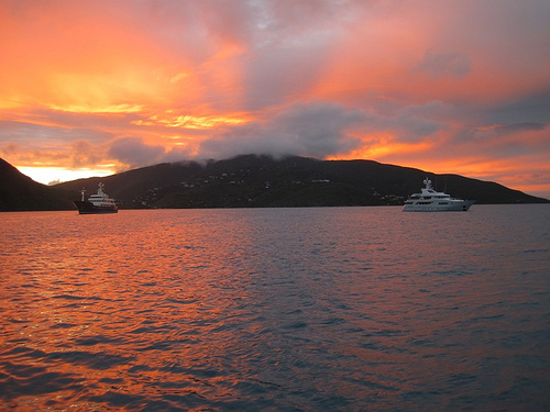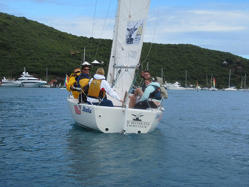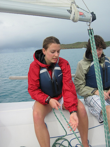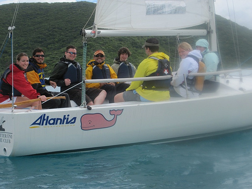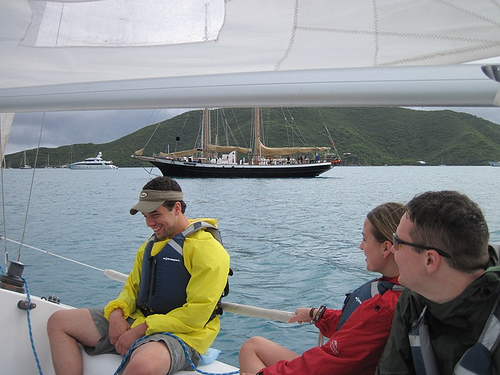 Today, we woke up to another day of rain, to our dismay, but we were persistent in being active and getting off the boat. We started the day well with yummy French toast and morning scuba dives for all the shipmates, which also happened to be my first for this trip. The certified divers went first for their checkout dive, and then the non-certified divers went for open water certification dives. In my dive, we saw lots of conch and some small spurts of coral at a depth of around 15ft. Once everyone dove, we had sandwiches for lunch in the salon and then had a sailing class about the different points of sail to prepare for our sailing activity. We then suited up in our rain gear and piled into a 24ft sailboat moored nearby, rented from the Bitter End Yacht Club. We sailed for a couple of hours around the bay in the rain. Each took turns handling the mainsail, jib, and tiller. While enjoying a leisurely sail, we debated over whether people were being towed by a boat on a banana or hotdog. Near the middle, it stopped raining and cleared up a bit. We then showered and hung out till dinner, which was on the grill. We had hotdogs, burgers, and baked beans in the cockpit since it was a “grill day,” which was great since we were able to eat outside and enjoy a beautiful pink sunset. After cleanup, we had an intro to our sailing class. Despite the rain, everyone had a great time.