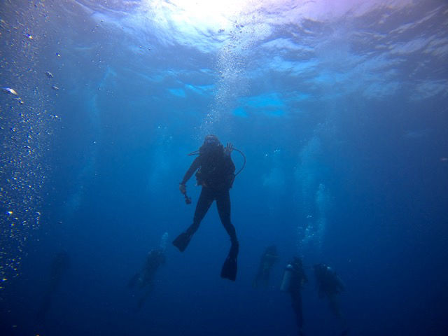 After our respective mornings had wrapped up, we all reconvened in the cockpit with our honorary crew mates from Sam’s for a divine lunch of Panda Express, delivered to the boat not by GrubHub but by our trusty galley gang. The orange chicken and noodles were truly otherworldly. Romeo, Ethan, Sierra, Dray, Perry, Jack, Emma, Kirstyn, Larkin, Smash, Ben, and I then set out for an afternoon dive by a sandbar near that very same Oolong channel. The reef was teeming with life, from small cleaner wrasses who gave us manicures and cleaned out Perry’s ears (grody) to huge schools of fish swimming overhead (sorry, Ben, I did not have my ID book with me and could not tell what species they were) to sharks and unicorn fish and barracudas and sea cucumbers galore. My trusty dive buddy Smash spotted a wee little Hawksbill turtle as we made our safety stop on our ascent, which I only found out was her sighting after excitedly tapping her fins and signaling that there was a turtle down below. Thank you for spotting our little pal, Smash!