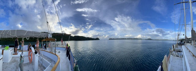 I thought that I couldn’t possibly fall more in love with Palau after our eventful dives, but the boat ride back from that dive site proved me very, very wrong. This place genuinely looks like it is on a different planet. It is the most beautiful place I have ever been. We took the scenic route home, weaving in between lushly vegetated rock islands in the Bluest Water Of All Time. The sun lit up the sides of the islands as a squall rolled in behind us, truly something out of a Baroque painting. Usually quite the talkative bunch, our dive group sat in silent reverence for the majority of the 30-minute ride back, only tearing our eyes from the horizon to look at one another and mouth something along the lines of “Oh my god, this is the most beautiful thing I’ve ever seen” or “how is this a real place that we get to experience together right now?” We arrived back to Vela speechless from the majesty of nature, some of us tearing up wee as we formed a tank train to get our gear back on board. We climbed back on deck to find our friends basking in the sun, soaking it up between the sporadic showers of Palau’s typhoon season. We scarfed down yet another fantastic meal of lemony pasta with Brussels sprouts and lentils, thanks to the lovely chef team. Those who were not lucky enough to do EFR this morning are sitting in an air-conditioned saloon as we speak to enjoy my New Favorite Movie Ever so that we can all come together tomorrow to take the exam. After they finish with their cinematic experience, it is sadly the day to say goodbye to our beloved Philmore, Romeo’s pet raccoon (mohawk). I hope that he has plenty of room to roam around on a nice farm upstate with friends galore and plenty of pets. We shall miss you, Philmore, forever in our hearts.