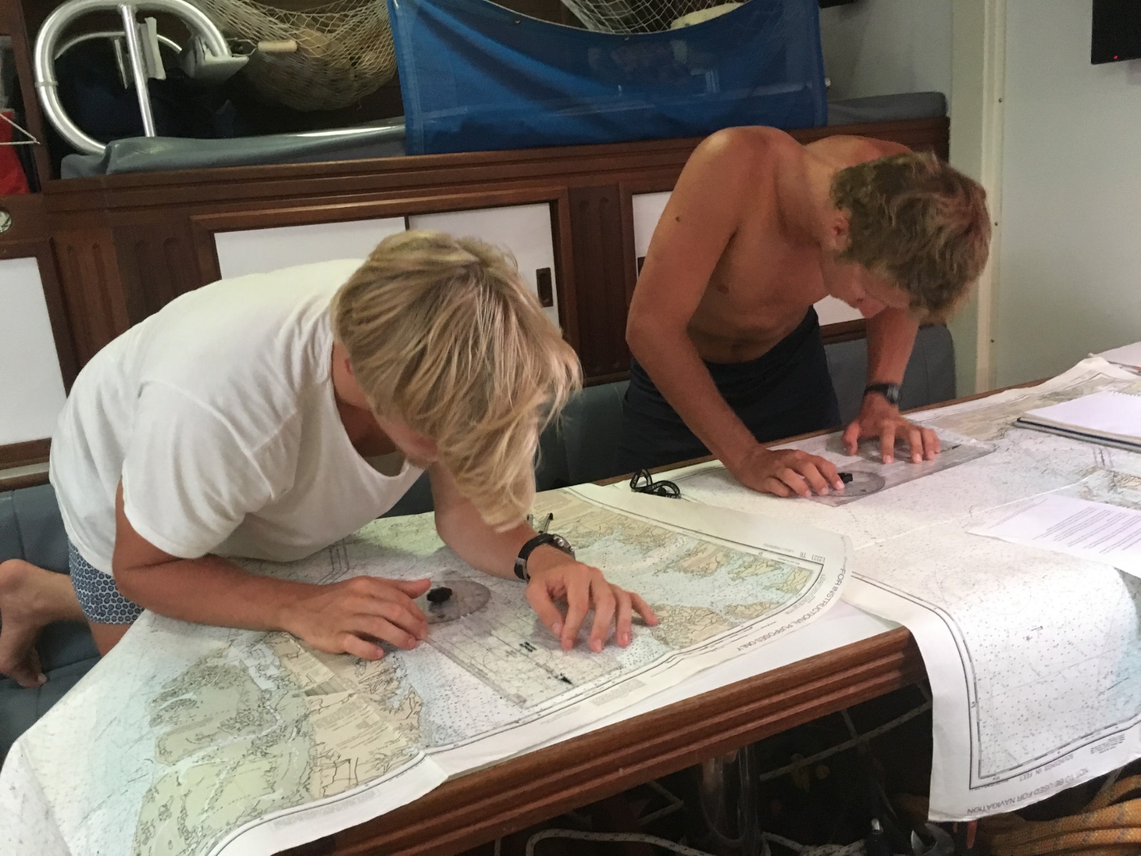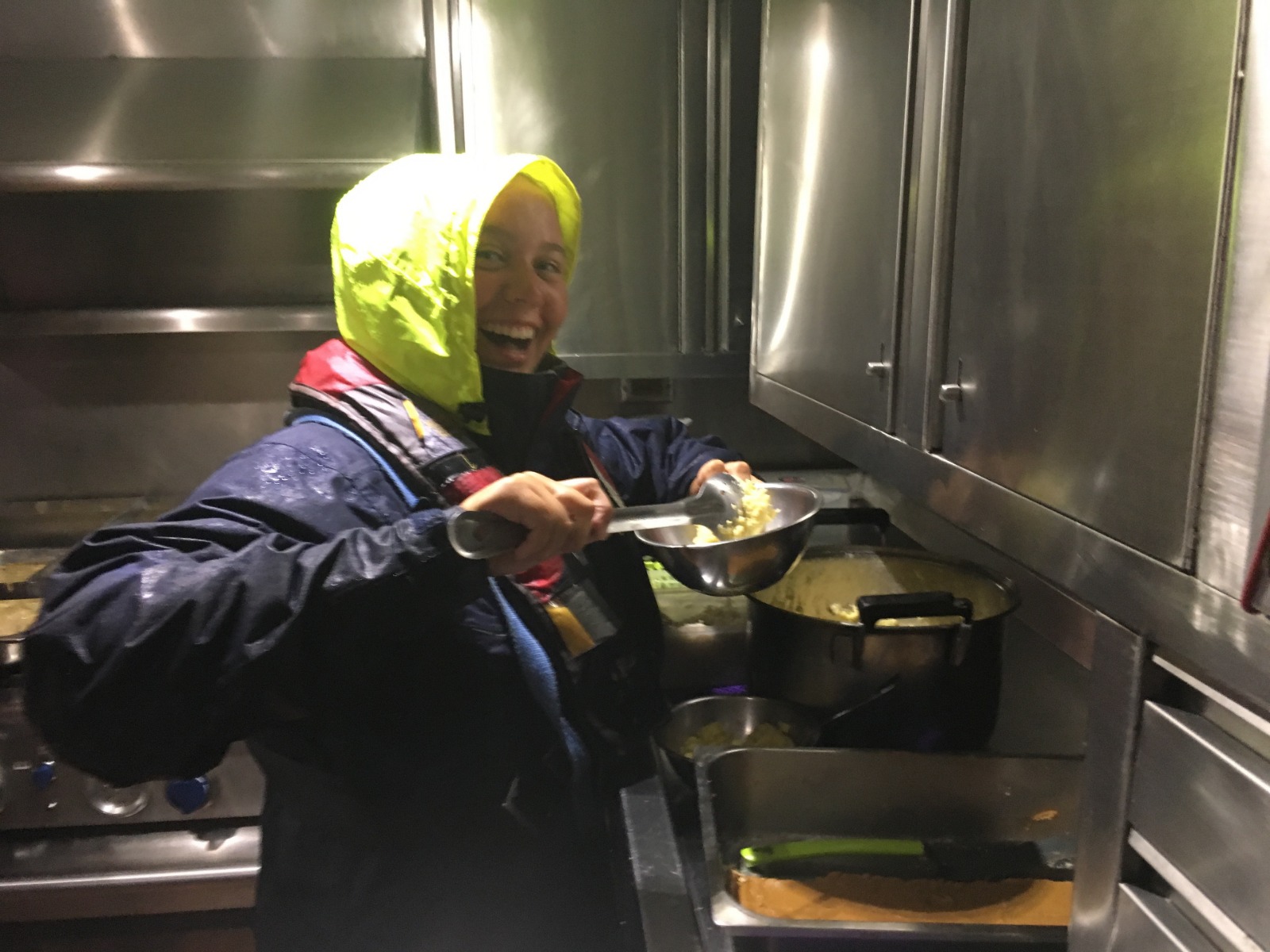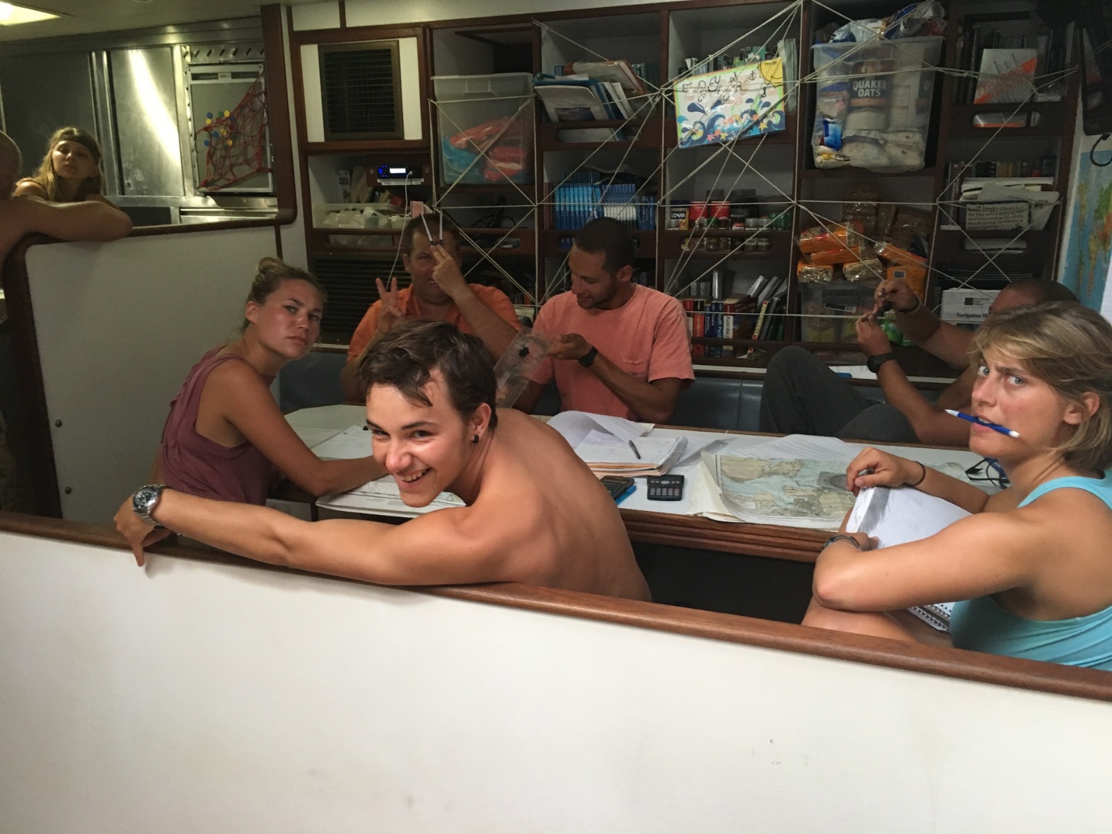 It was another hot and rainy day here on Argo. Watch team three, on their 12-4 am watch, made some delicious pie to celebrate probably one of the most important days of the year, Pi Day. Along with the delicious desserts for the day, James, the head chef, took on some challenging meals, which included black bean burgers with freshly made rolls for lunch and steak potpie for dinner. Today’s classes were Marine Biology and Navigation in PEN. Today was the last day of navigation before the test, so we put all of our knowledge to use to complete some last practice problems. Just as watch team two began their watch at 6 pm, it started to rain, and I had the pleasure of helming when the rain was coming down hard, which was really exciting. Today was the first day we ate down below because of the rain. We also had a squeeze down below, which consisted of all things pi. The questions were what is your favorite dessert and your favorite number in pi. And we ended the squeeze by saying 3.14159265358979 altogether.