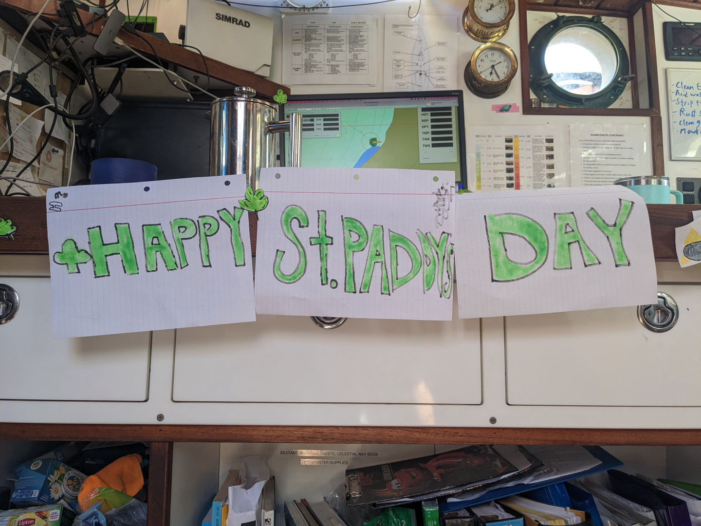 First and foremost, Happy St. Patty’s Day!!!! I, of course, wouldn’t have even known it was St. Pattie’s day today if some lovely shipmates hadn’t pranced into my cabin last night to ask if they could make some special holiday treats (obvi, I said yes). And then, this morning, I awoke to a beautifully decorated chart house! We had been visited by some artistic leprechauns – our decorations were complete with a very realistic leprechaun caricature of each of the staff. While I was excited to be holding a mallet in mine, I will say I was a touch confused – turns out it was a Secchi disk! Duh. Makes way more sense.