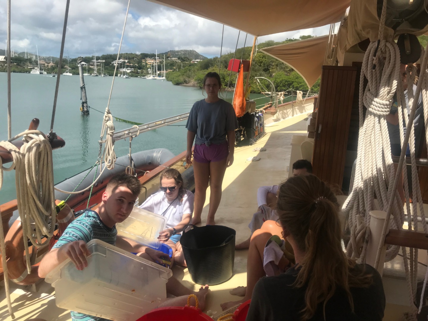 After returning from the hike, the students were all smiles on the way to Nelson’s Dockyard, where they had some shore time. The dockyard is full of historical buildings that have been repurposed into cafes, restaurants, and even a sail loft. While some students wandered around and imagined what it would have been like to be a part of a naval shipyard in the 1700s, others sped off to rummage for snacks at the local grocery store or get in touch with their friends and families.