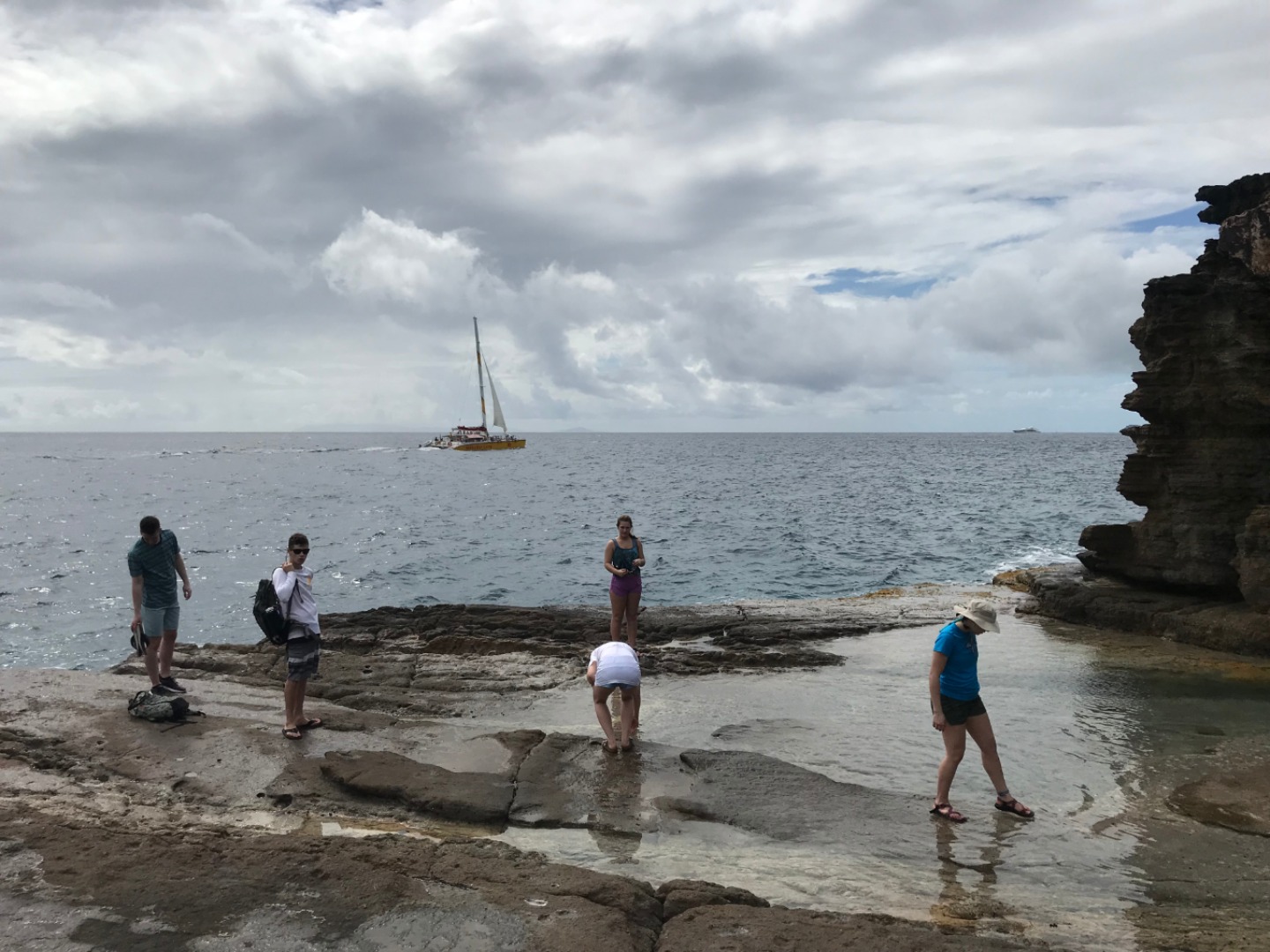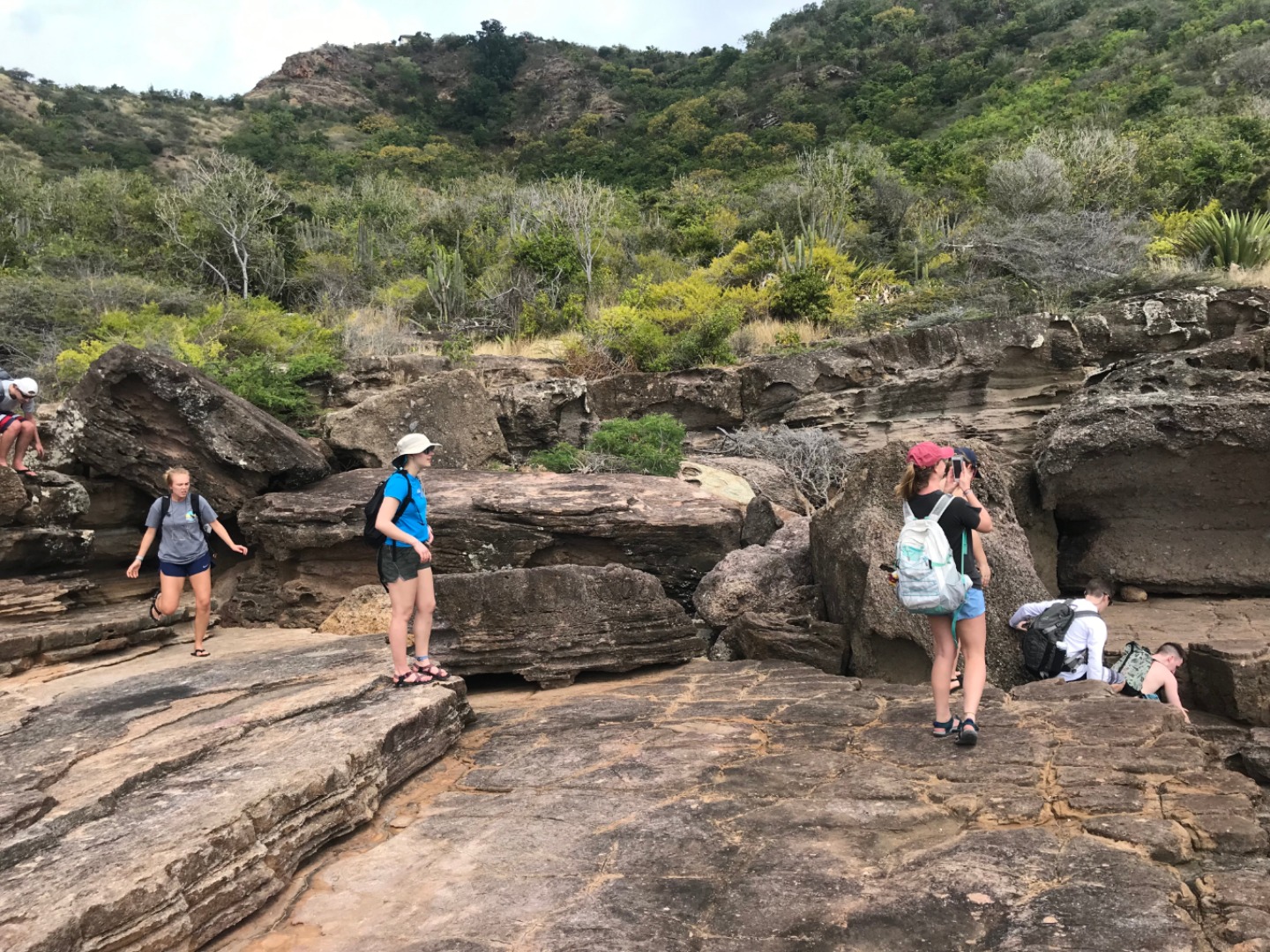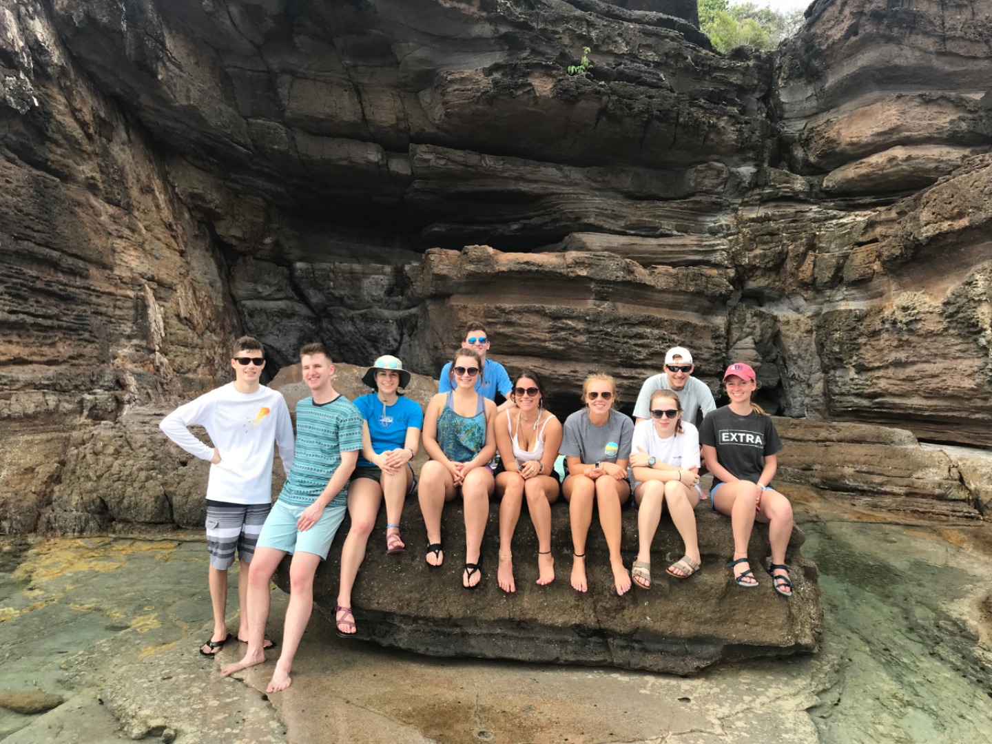After we had our fill of rotisserie chicken & hummus pita pockets, the students joined our two marine scientists, Alex and Steve, on a short hike to the tidepools above a rock formation called Pillars of Hercules. The Pillars got their name because of the vertical striations carved into the windward rock face from wave action over time. They’re a great place to start thinking about wave action, intertidal zones, and reef communities … plus, it’s a great excuse to go for a swim!