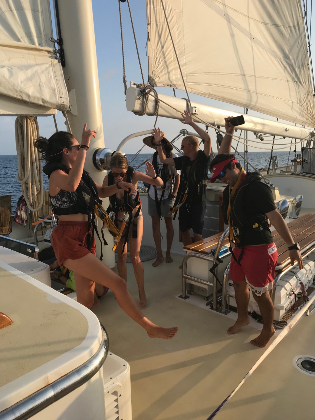Pictured: One of the boobies perched way up in Argo’s rigging; gorgeous sky and sea this afternoon; London, Alexis, Jack, Sam, and Ivan having a Watch Team One dance party at the end of our watch right before dinner.