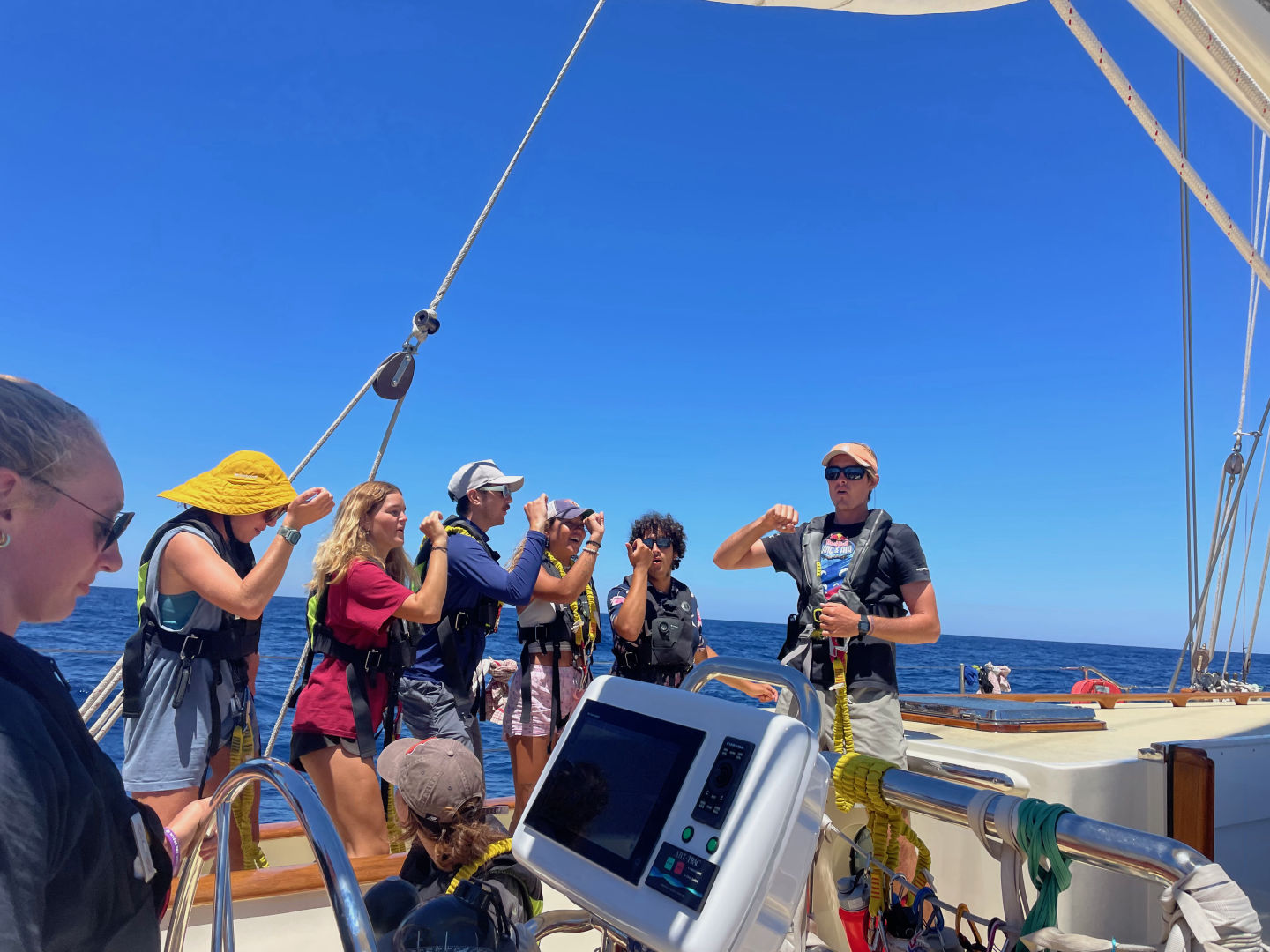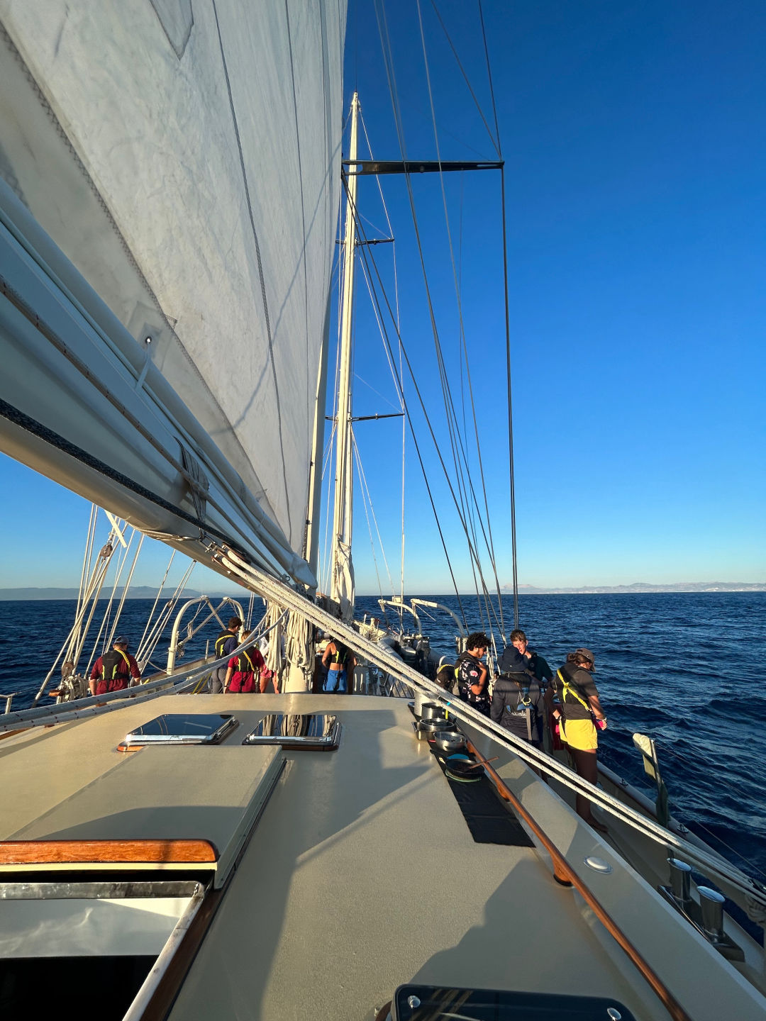 Lunch was followed by an awesome presentation introducing us all to Gibraltar and its history. After this, we decided to test our luck and try to sail through the straights of Gibraltar. We sheeted out the sails and turned the engine off to cruise along at a leisurely 4 knots. Once we were sailing, PSCT crew (Maya, Drew, Sammy, Charles, Lilly, Will, and Myself) moved into class with Calum in the cockpit, learning all about tide tables and calculations while being visited by a Moroccan fishing vessel that came alongside us – this felt super strange as we are still adjusting to no longer being in the open ocean.