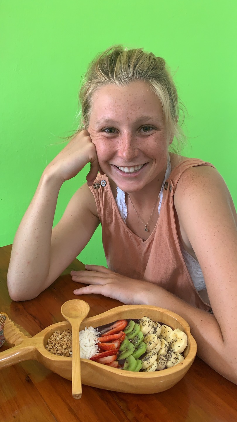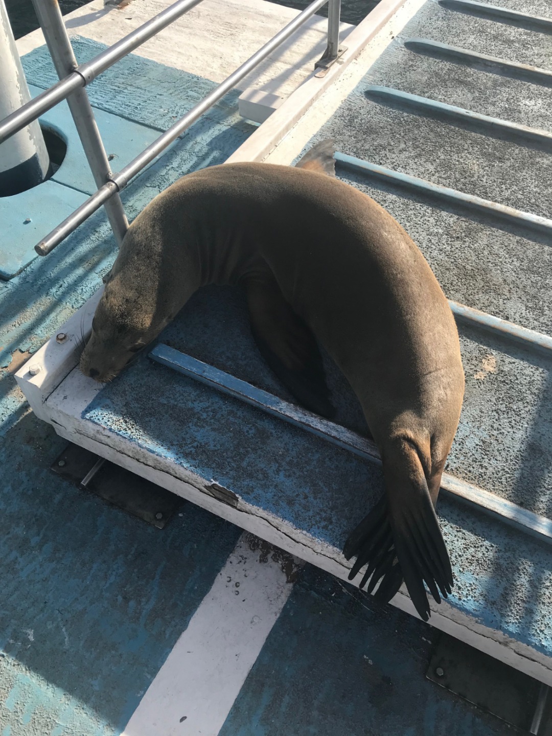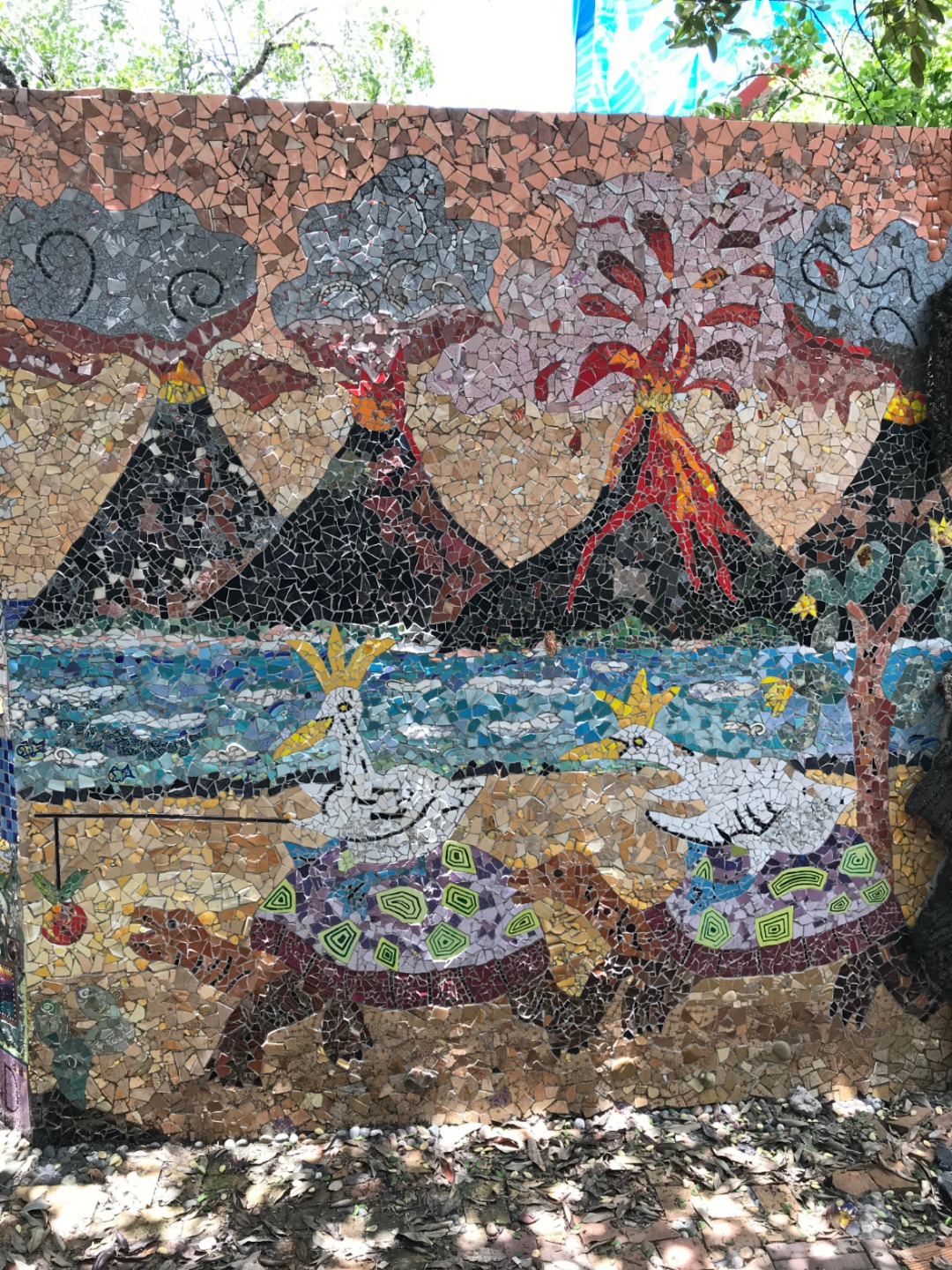 Pictured: A school of small golden rays at the dock, a sleepy sea lion at the dock, Eliza enjoying an acai bowl yesterday; ceramic artwork around town; gorgeous sunset over Santa Cruz.