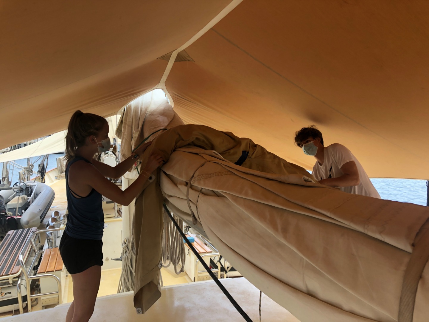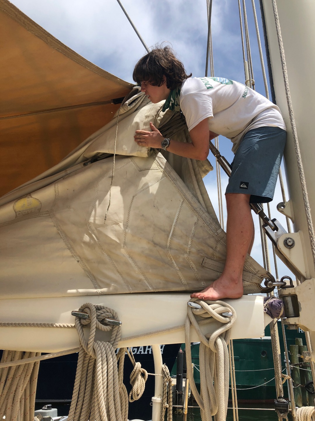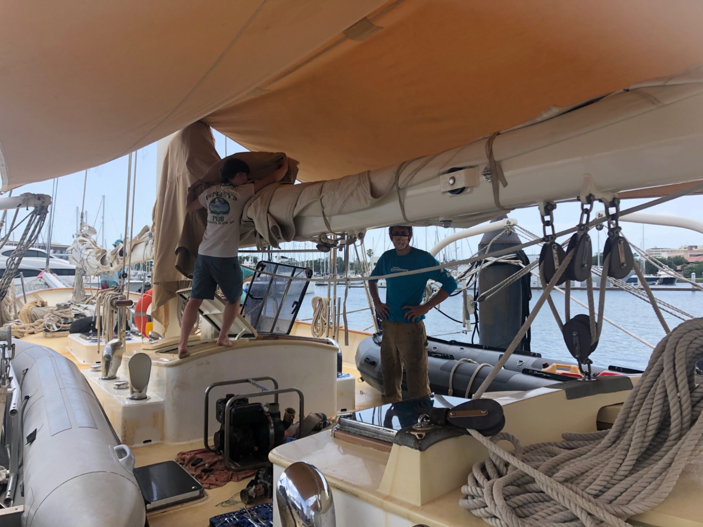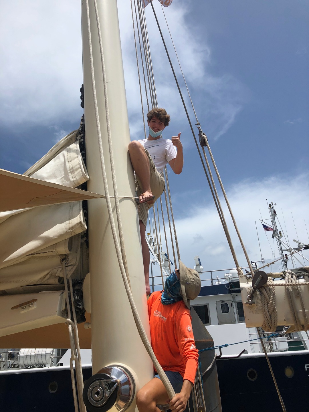 This morning Chase made everyone some very nice scrambled eggs and toast. After everyone was finished eating and cleaning up we were surprised by a fire drill. At this point, we were assigned our watch groups for the rest of the trip. Each watch team is made up of four students and two staff, every watch team will have four hours on watch and eight hours off watch. With each watch, the team comes great responsibility. Each watch team has a different thing they are in charge of in a state of emergency. My watch team was in charge of flipping some valves so the fire hose worked. We were also in charge of gathering all medical supplies and everything we would need to survive in a life raft. After that, we started preparing for our passage to the Dry Tortugas. Everyone was assigned to new groups and areas of the boat where we took care of different things in order to get the boat ready for departure. After all of that, we had some scrumptious pork for dinner and talked about all of our best seasickness stories.