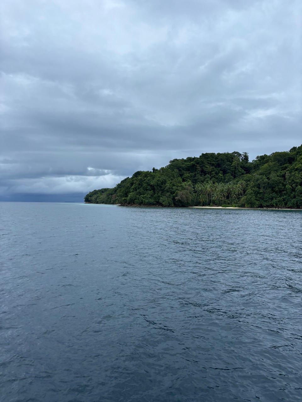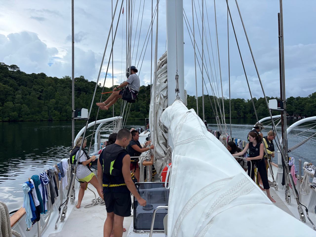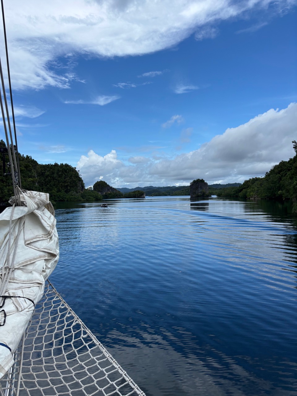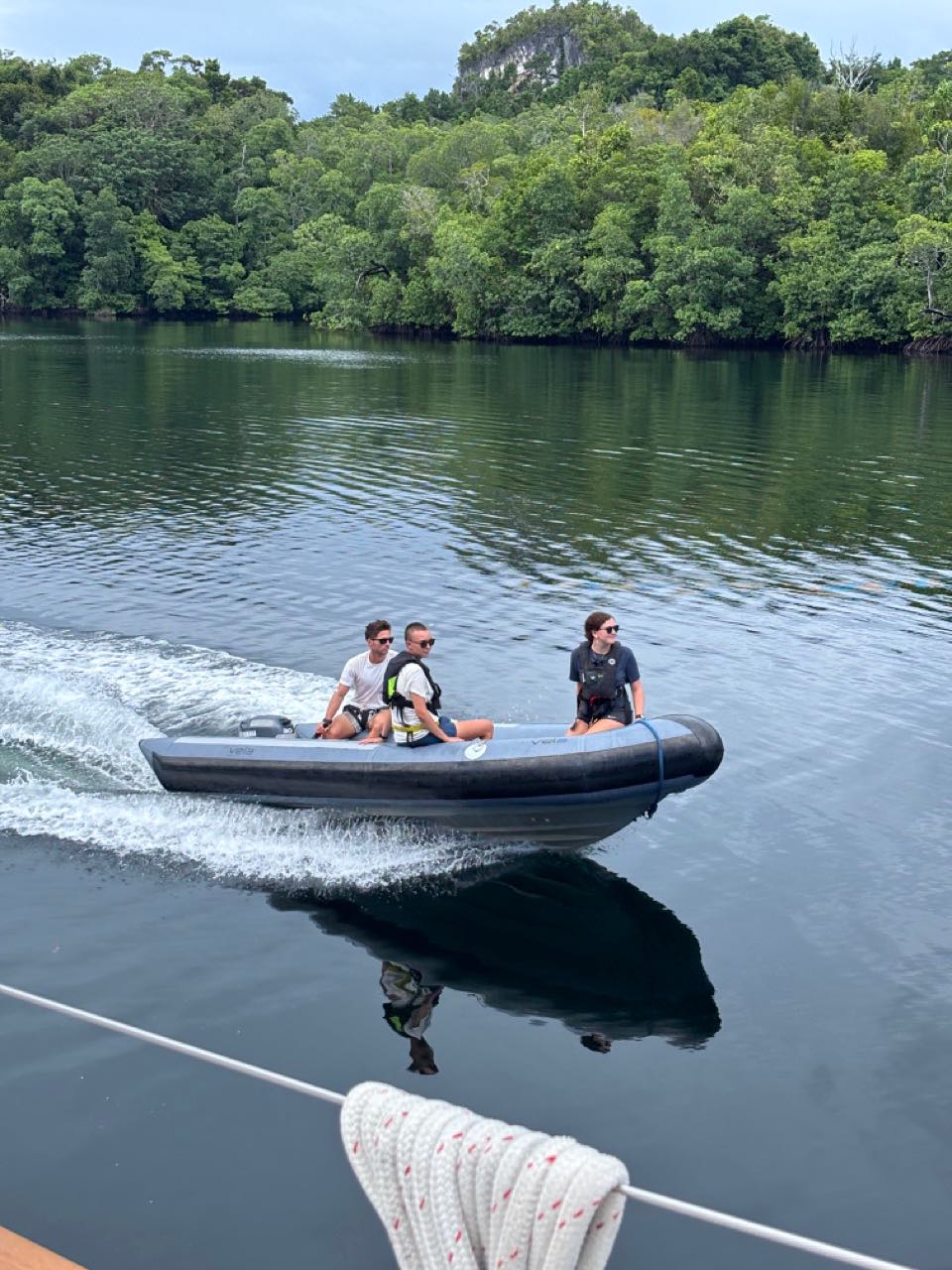 Today was a workaholic’s dream, the day started off as any other – a quiet sunrise in a secluded bay, the birds were out and chirping, and the water was calm, yet everyone decided to sleep. As skipper for the day it was my job to interrupt this, the wake-ups started with a pole prod to give everyone a chance to come too and get up, if this didn’t work for the very sleepy individuals the crashing pots and pans that followed 20 minutes later definitely did. After a breakfast of overnight oats, we broke into groups to prepare the boat for our passage. While some removed the sail covers, others braved into the laz at the stern. Those individuals’ sacrifices will be remembered. Anda and Kat were selected to provision and left after breakfast on a speed boat to collect supplies before passage. Once the boat was prepped most of the day had flown by, thanks to everyones work we were able to walk on shore for a a bit enjoying our last time on land for the next five days, while some enjoyed the view of the black tip reef sharks from the dock watching them wade though a sea of fish parting a path through them like snow plows others enjoyed the beach soaking up the water and sun. Arden, Joshua and I went on a little hike up a mound to a view point to experience the breath taking views of Raja Ampat, from there we saw the black tips from above the reefs and island that surround our anchorage as well as the storms rolling on in the distance which will serve as subtle foreshadowing for the conditions to come. Once everything had wrapped up on shore we got ready to leave and stared motoring to the arches which guarded our anchorage, from then on it was motoring though storms and sun the weather was tempermental and remains so as of writing this blog. as for now we sign of on day 22 /day 62.