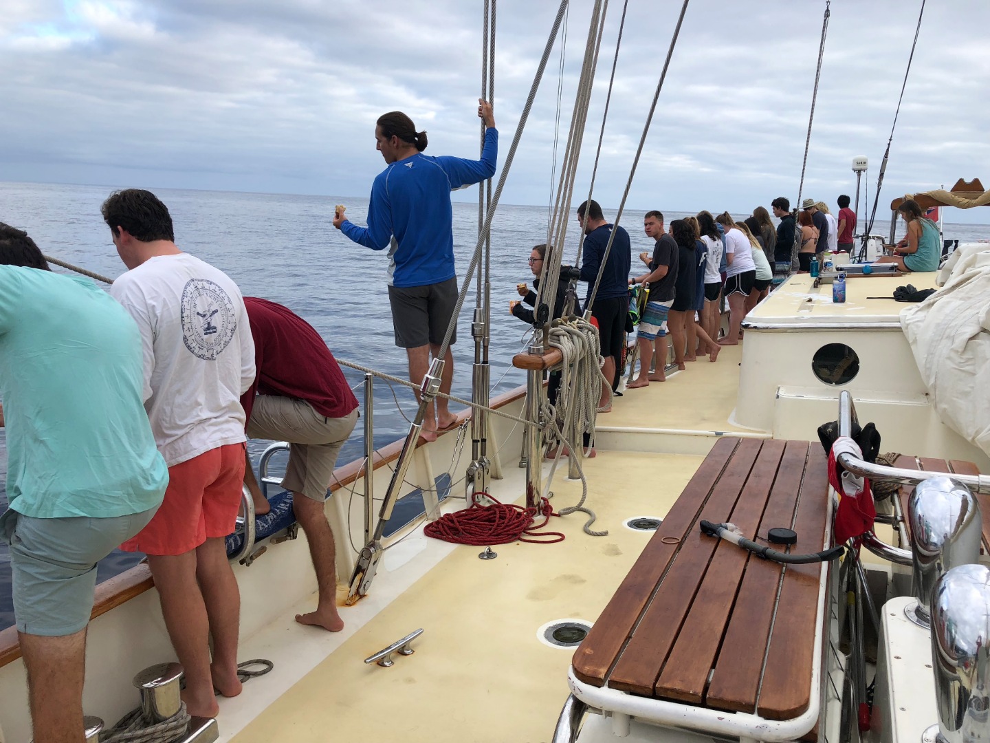 Following two action-packed days of snorkeling with whale sharks and scuba diving, Day 3 in St. Helena was time for us to begin preparing for our next passage. In the morning, we enjoyed the time ashore. Students shopped for souvenirs and snacks, explored the island, hiked Dianas peak, climbed Jacobs ladder, and enjoyed Wi-Fi access. We ate lunch aboard Argo and then began passage prep. The sails were uncovered, cabins tidied, belongings secured, drying lines cleared, dive gear stored, and systems checked. Provisions were loaded onto the boat, organized, and stored. Once passage prep was complete, we spent time under the sun, relaxing and swimming in the ocean. After watching another beautiful sunset, indulging in Argos finest cuisine, and taking the ICC certification exam, another exciting day aboard Argo was complete!