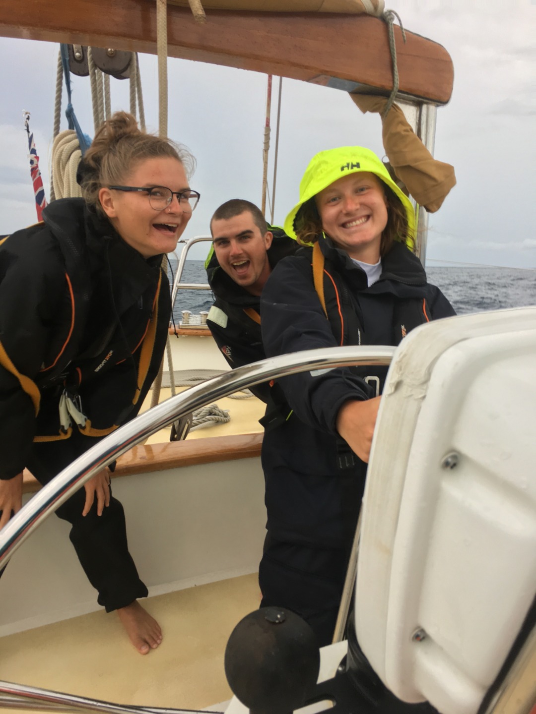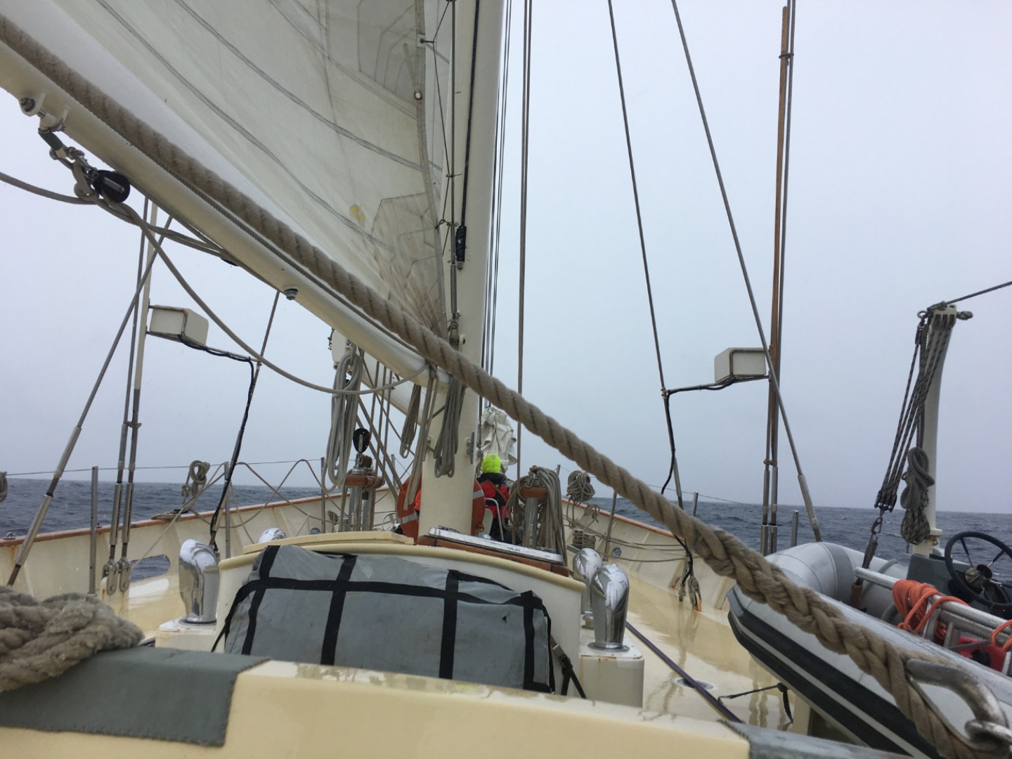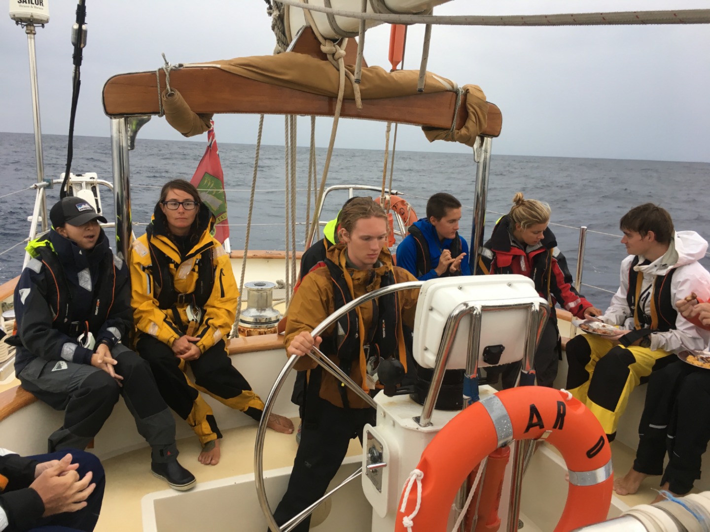 The itsy bitsy spider may have made it onto Argo, but today’s rain washed him out to sea, as is consistent with passage life. The day ‘began’ at noon, although most everybody was either on watch, working on meals in the galley, hanging out, or studying (not too much, mom – I promise!). The rain had been a fickle companion since yesterday evening, with some watches being mostly dry and others getting completely soaked. Fortunately, we had a dry lunch of falafel, made by our fabulous chef team of Alexa, David B., and Jack. (It should be noted that, despite both evidence to the contrary and popular belief, Jack did not eat that squid but has consumed a minuscule flying fish found on deck).