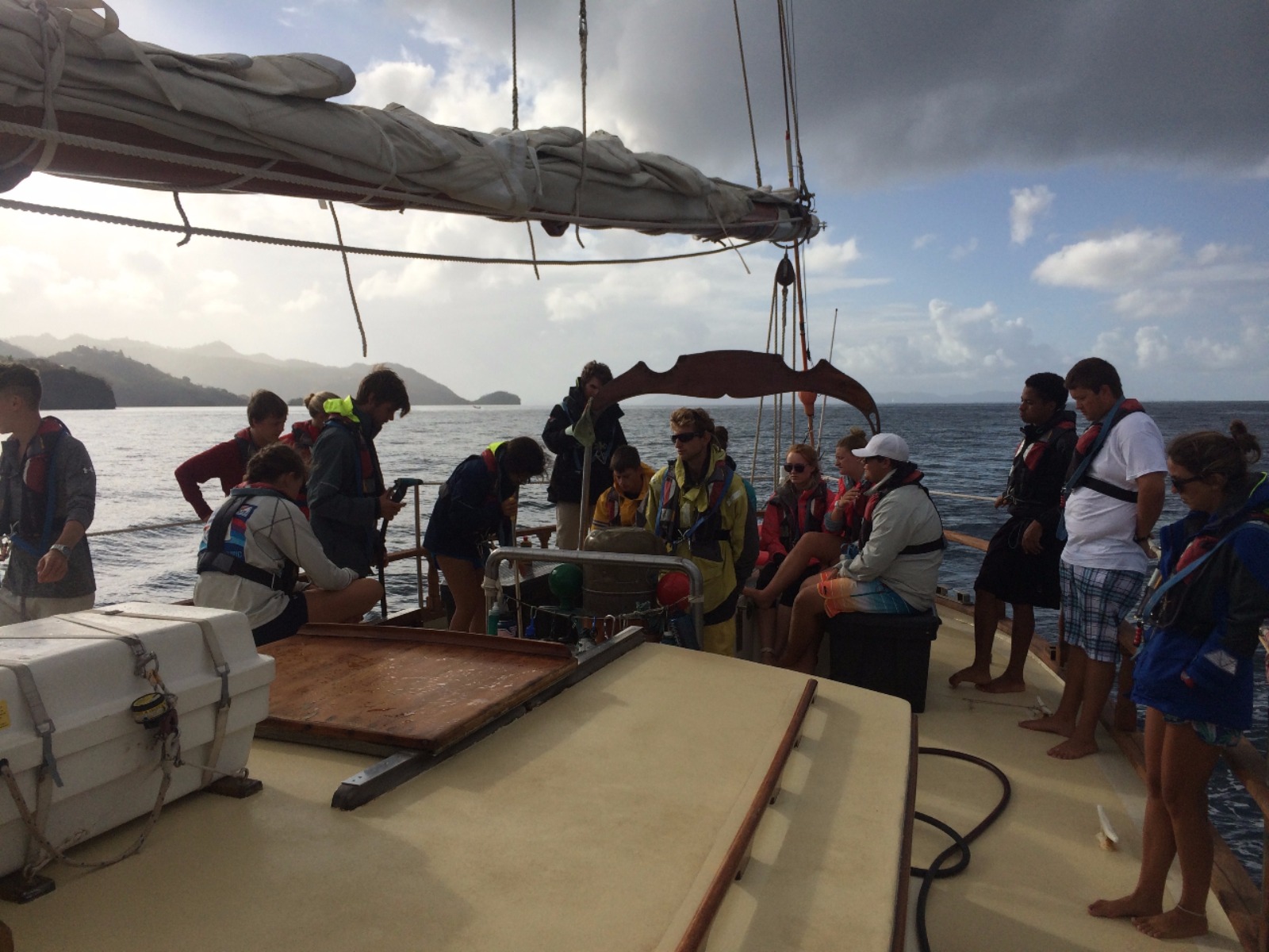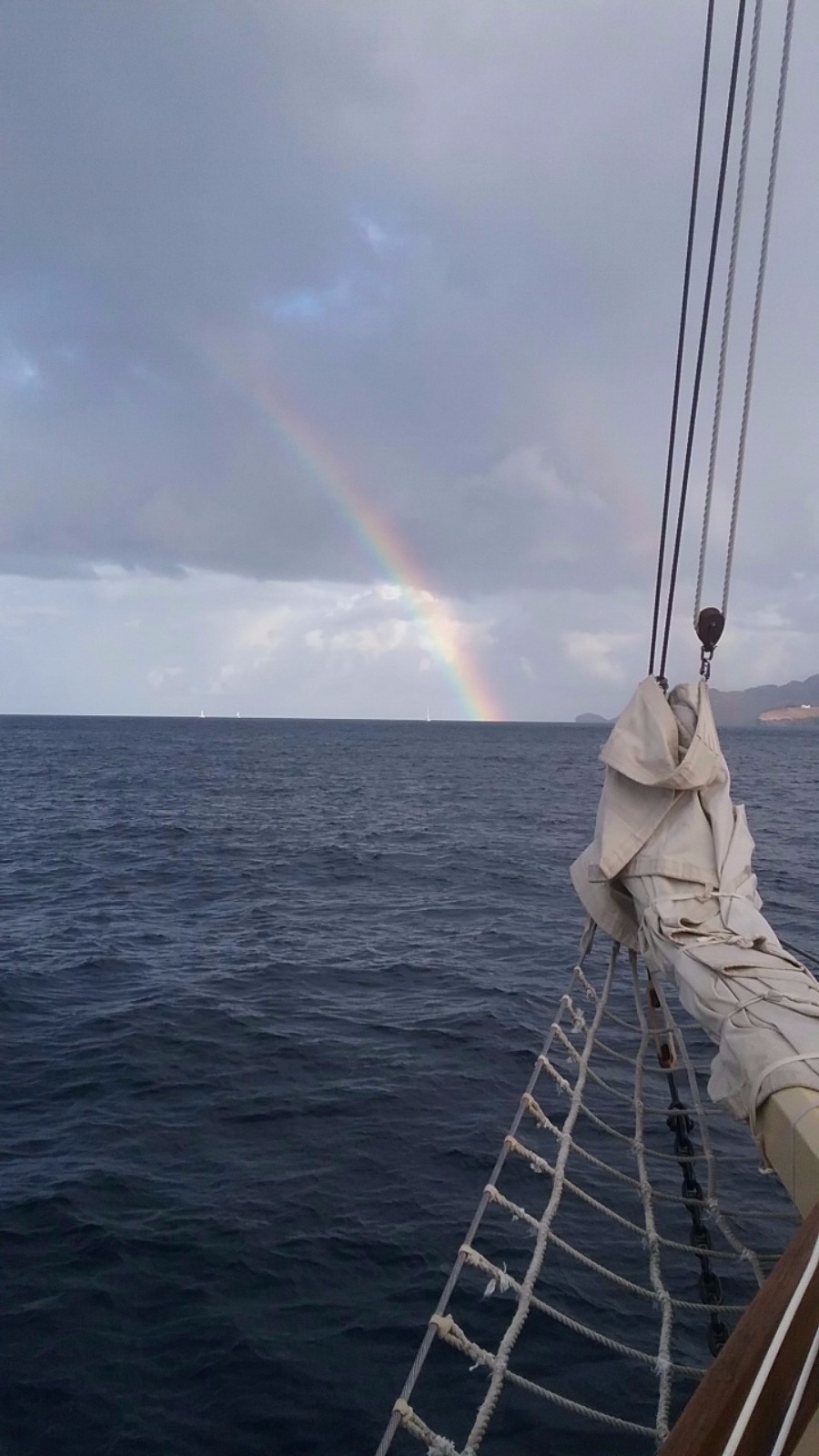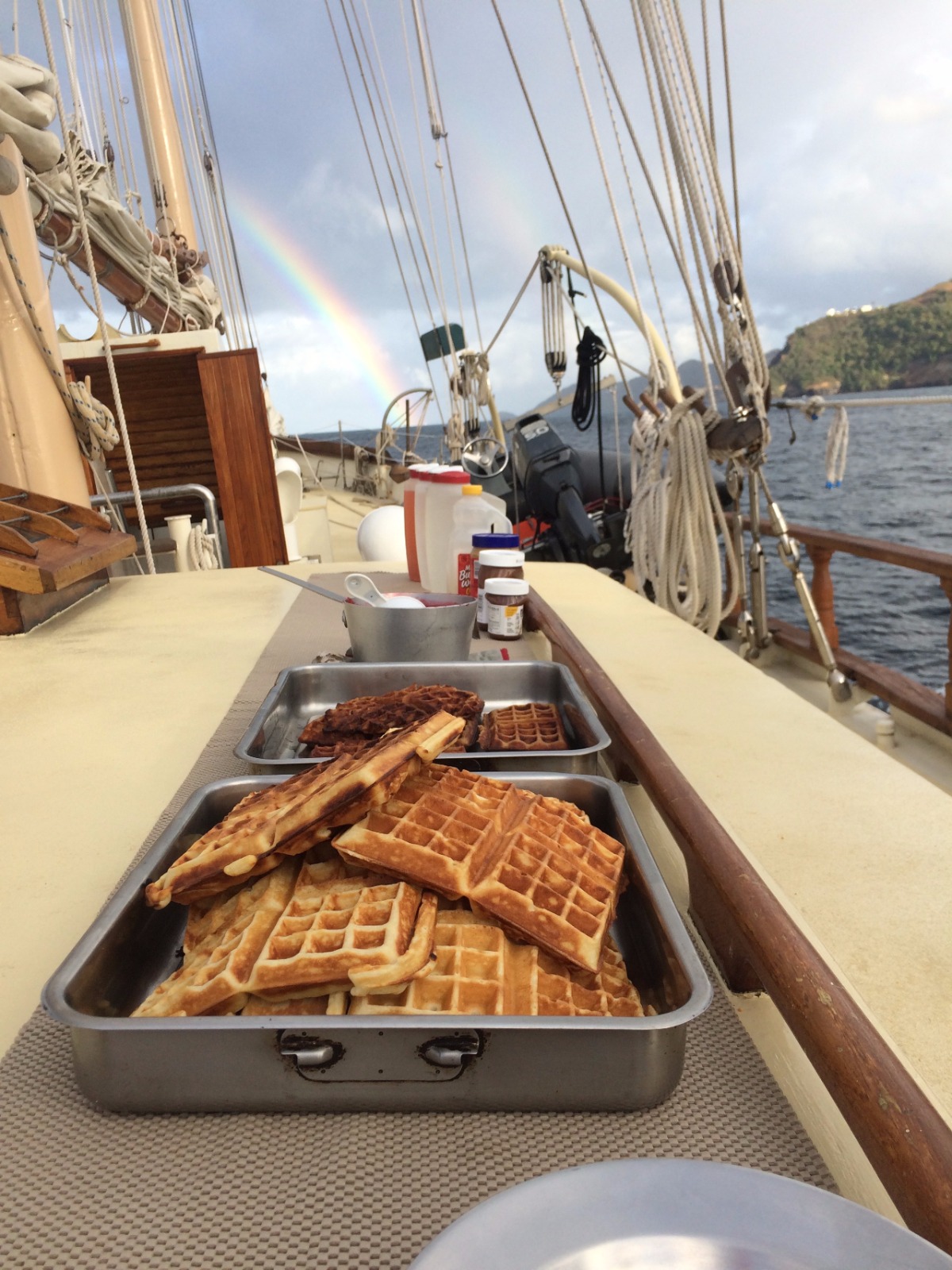Today was full of rainbows. We had an early wake-up this morning because some of us decided to go hike up a nearby rock to a historic outpost in St. Vincent. After hiking, we had delicious waffles with Nutella and strawberries for breakfast. During breakfast, a double rainbow appeared over St. Vincent. What could be more perfect than rainbows and waffles? After breakfast, we finished doing passage prep for a short passage to St. Lucia and set off. On the way to St. Lucia, we saw several rainbows. We split into watch teams for the passage, and some of us even got in a nap today! The view coming into St. Vincent was gorgeous. We moored right next to one of the pitons, which are two tall ancient volcanoes. Before dinner, we got the chance to do some boat appreciation and clean all the salt and grime off the deck of Ocean Star. After yummy pad Thai for dinner, we had our student leadership class. It was an awesome day! Tomorrow we will go explore St. Lucia’s botanical gardens, hot springs, and another volcano.