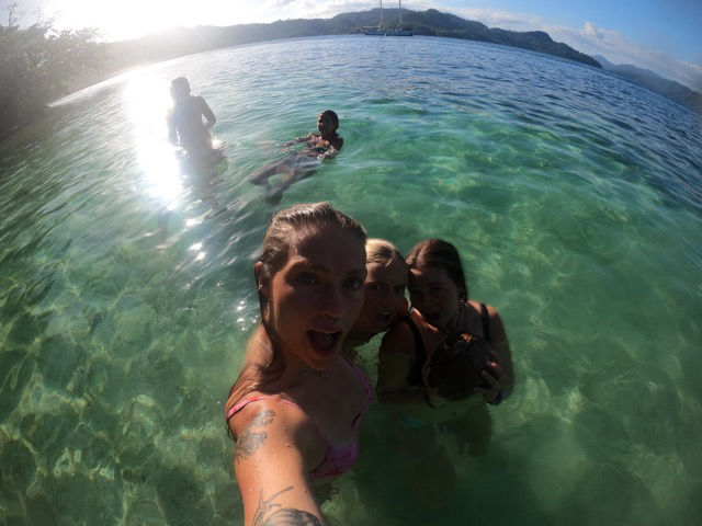 Back on the boat, everyone broke into a bit of study time before our oceanography quiz with Heather. This was definitely one of the harder units, but we all got through it! Afterward, a handful of people decided to go snorkeling at the beach that we are anchored by. Since it’s super close, most of us swam there, with Kee riding beside us in the dinghy to protect us from currents and other boats passing through. This itty bitty beach was just beautiful – the edge was laced with coral, the water was super clear, and the soon-to-be-setting sun was dousing everything in just the right amount of golden light. A lush green forest absorbed the entirety of the area except for the tiny patch of sand that we were on. People took pictures, found stray coconuts, explored, and played mermaids. The small things we do like this are some of my favorites about the trip.