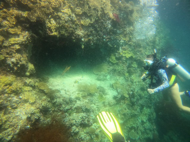 The two groups then flip-flopped – the people who hadn’t dove yet went out to the dive site, and the people who already dove stayed behind to take the VHF course. Me, Babs, Lexi, Justin, Perry, Ethan, Sierra, and Dray went to the same dive site the others went to. My research group and I got a ton of our data collected for the research project we’re doing, which felt good. We spent the first half of the dive collecting data and then got to enjoy the second half freely! There was a TON of really cool coral (including some that looked LSU-colored…?) and marine life at this location. There was even a small cave at the very end that we got to peer into, which was neat. One of the pictures below is Sierra taking a look inside this cave.