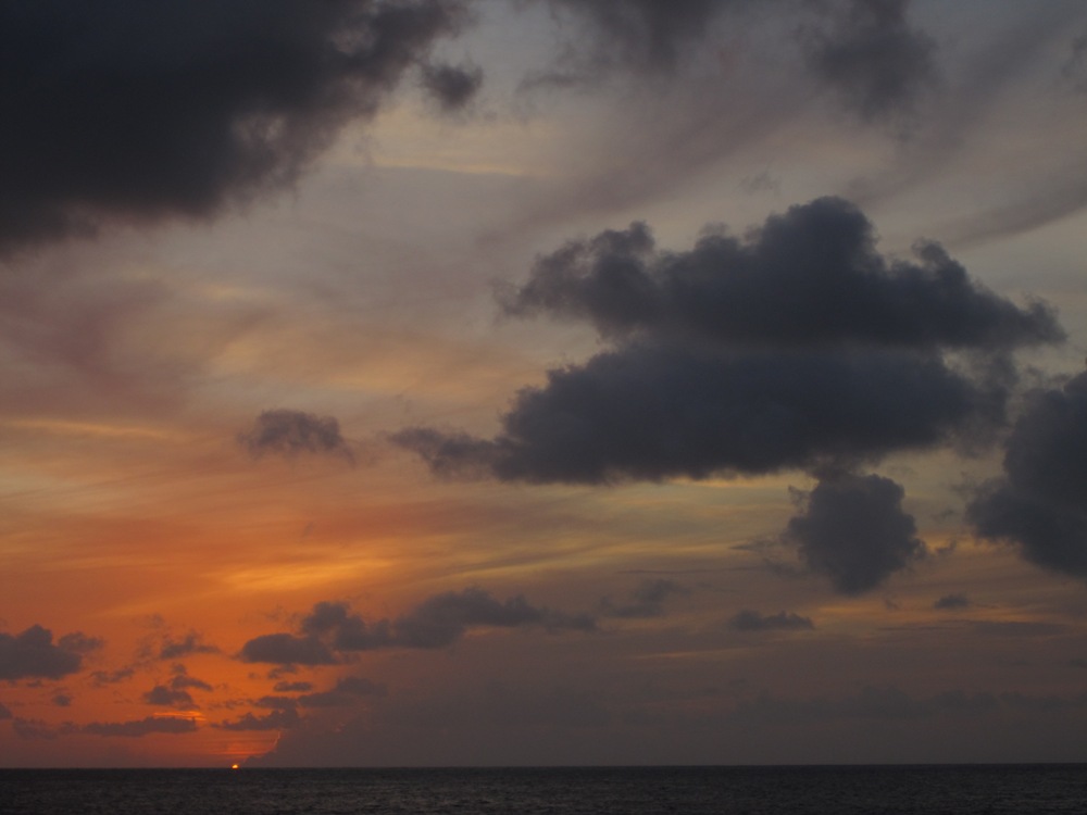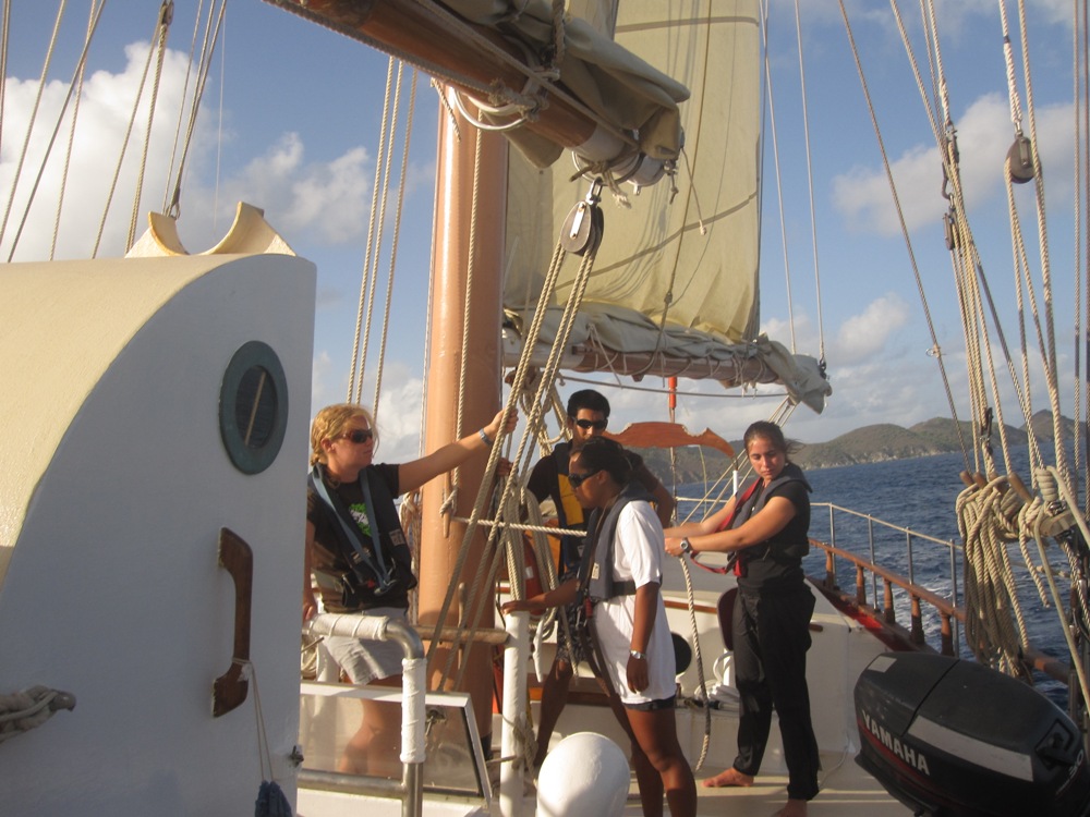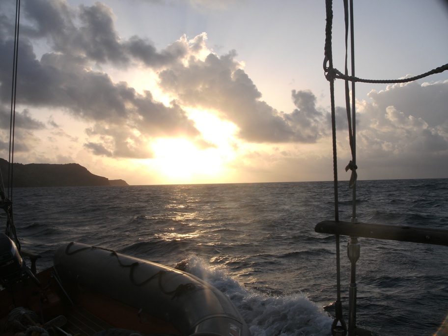 This morning was unusual in that, while we still woke up at 7 AM and ate breakfast at 7:30, we didn’t really start our day until ten thanks to the Statia customs officials who apparently work on what we call island time. Over the course of our time here on Ocean Star, a few of us have read many books. As they’ve finished, they’ve passed them off to other crewmembers. Now, the majority of the Ocean Star crew will be found on deck or down below with a book in hand if there is even a moment of downtime, and having all morning to read was really quite pleasant. However, once Kevin got back, it was time to get ship-shaped and ready to go with all the books stowed safely below. And so we made our way quickly on a broad reach to Saba in only three and a half hours of clear skies and rolling swells. As we got closer and closer, we saw the giant cliffs and mountains that tomorrow’s hike would entail. And let me tell you, it looks rather intimidating, even after the 14-mile Boiling Lake Hike. When we arrived, Kevin realized that someone was tied up to the mooring ball Ocean Star uses.