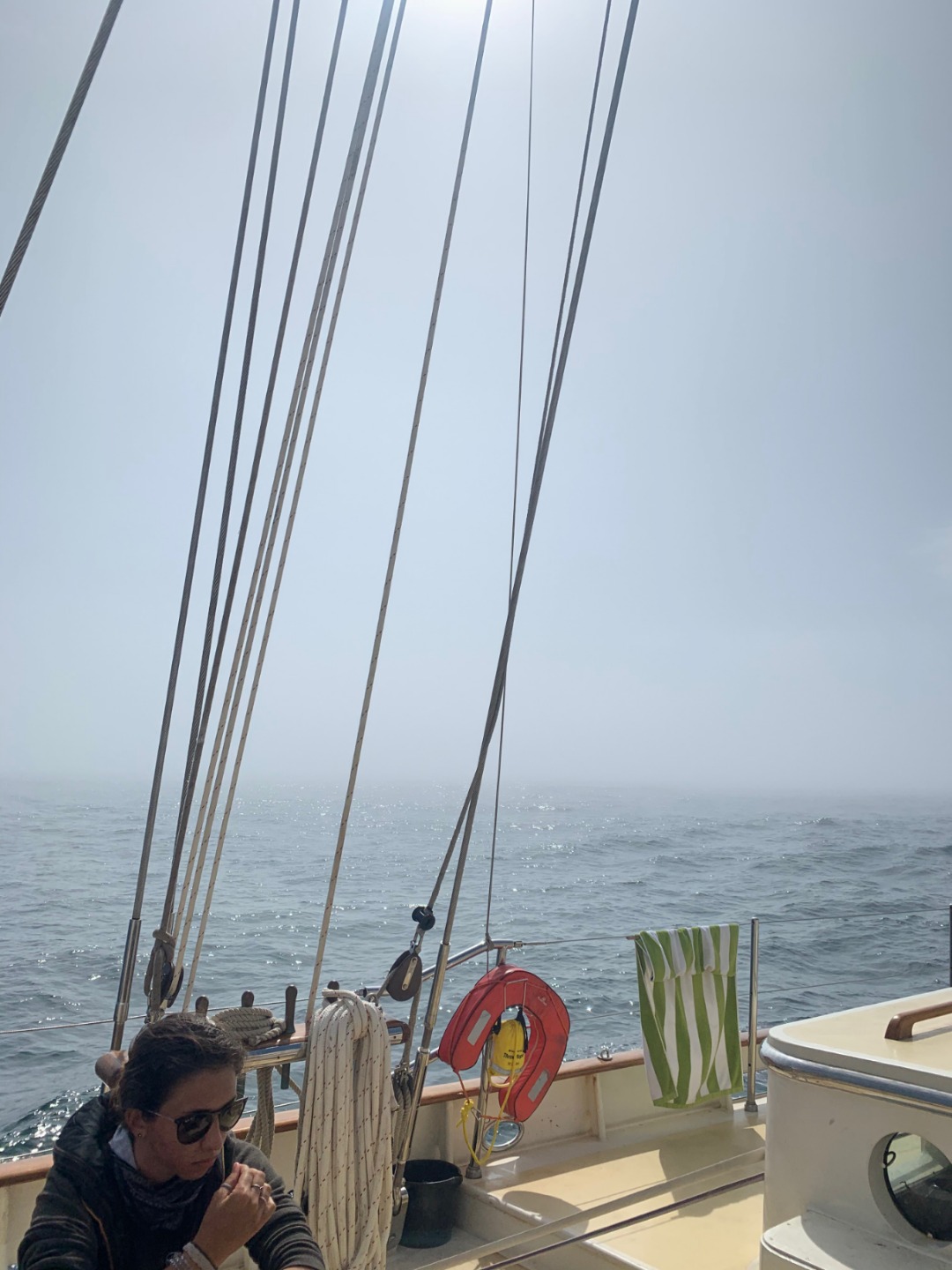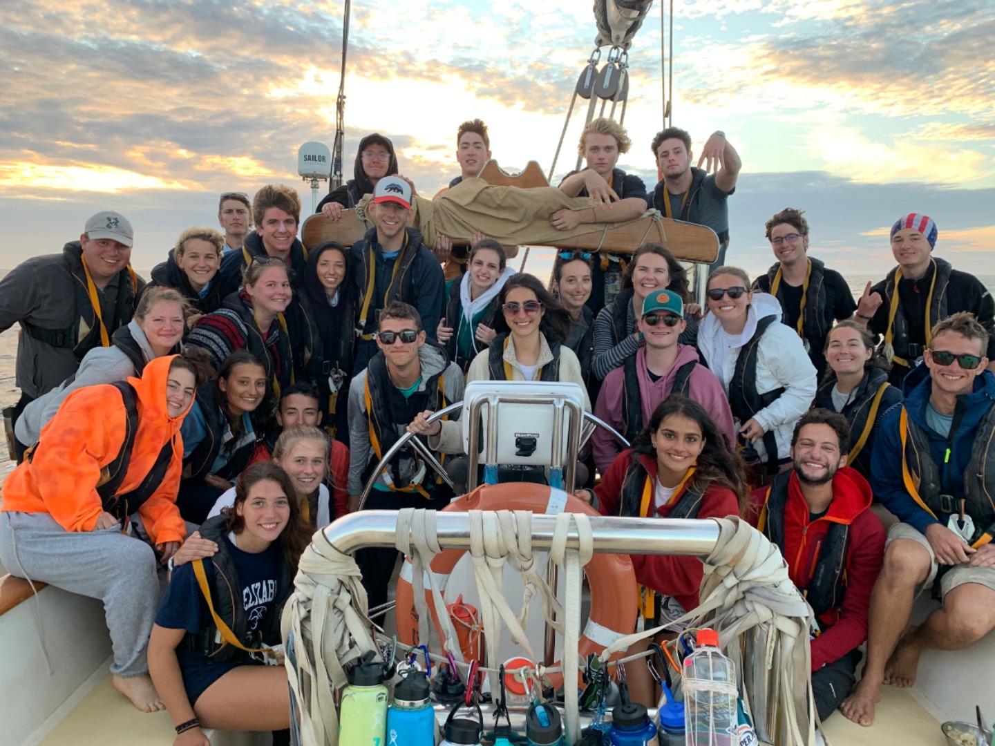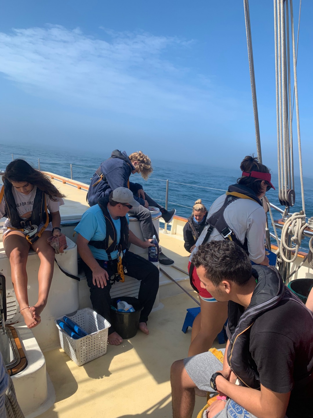 Well, today’s the first full day of the passage. I’ll keep this short but sweet for everyone at home, just dying to know what it’s like for us. For starters, Today was a crazy day for all of us. I got to say. There was a thick fog this morning till about three o’clock and very strong waves. Everyone is trying so hard not to fall over on the deck, but so far, nobody has fallen overboard yet. Watch teams crushed it today. Everyone is getting a taste of what it’s like to be on the water. I feel like everyone threw up today at least once, but hey, what are you gonna do. However, everyone is very excited despite the seasickness and lack of sleep. Finally, we were all able to hold each other’s hands during squeeze tonight for the first time. I got to say it was really weird at first, but in the end, it was pretty magical. Then after that, all of us took a picture on our first full day of passage which I’m sure you’ll treasure forever.