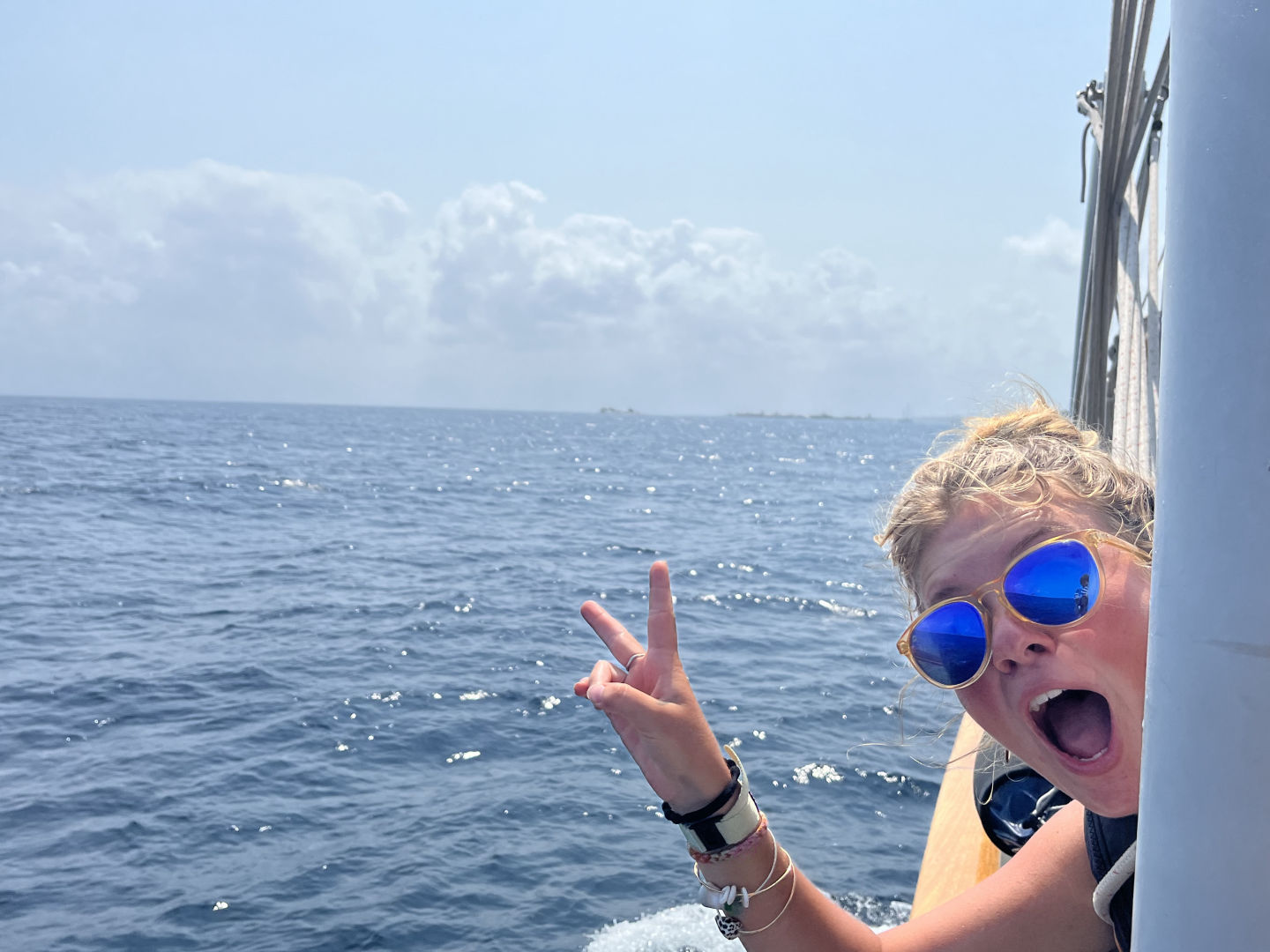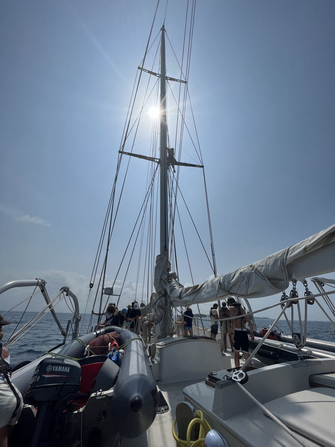 Today started at midnight for watch team 1. If we weren’t already awake from being thrown around our bunks by the waves, we were woken up by Gabby telling us to put on our foul weather gear and head straight to the cockpit. Normally, we congregate in the middle of the ship, so being told to go straight to the cockpit was a forewarning that the night would be intense. This was our first experience with waves this large, and some were excited while others were nervous. Being the watch team leader, I was given the briefing from Elise (watch team 3 leader for the day). She informed me that we should prepare to “get soaked” and “just enjoy the ride.” Watch team 1 take over and had some great conversations while surfing the 16-17 feet (5 meters) waves. Lately, the watch team 1 conversation has had a lot to do with the weird boat dreams we’ve been having, the ideal way to sleep in our bunks, and which watch schedule is our favorite (although it sounds unappealing at first, the 12-4 am seems to be the favorite). I’ve been told that watch team 3 has been doing a lot of riddles, and team 2 has been slowly working through a “36 Questions to Fall in Love” conversation starter list. After four hours of chatting, watching, and getting sprayed by the occasional large wave hit just right, we got to hop back in our bunks and enjoy sleep until 1130. I don’t think anything feels better than getting back in your bed after a late-night watch, except for maybe enjoying the first sip of a cold drink again when we’re on land. After wake-ups at 1130, we came up on deck and enjoyed Chef Morana’s cinnamon roll brunch. After another challenging cleanup while underway (as I’m writing this, a big pot just slid from midships all the way aft to the chart house window I’m looking out of), we had a marine biology lecture, followed by a study hall period that a lot of people used as an opportunity to work on navigation homework. Dinner was pad Thai, and my squeeze question was, “what’s something you like about the person sitting to your right?” When not on watch or in class, people have been sleeping, working on assignments, finding an opportunity to shower, or chatting with people from other watch teams (despite being within 112 feet of each other at all times, this is hard to do when you are all up at different hours). The past 36 hours have been extremely rolly, making normal, everyday tasks difficult. I think people are starting to look forward to being anchored by the end of tomorrow (hopefully).