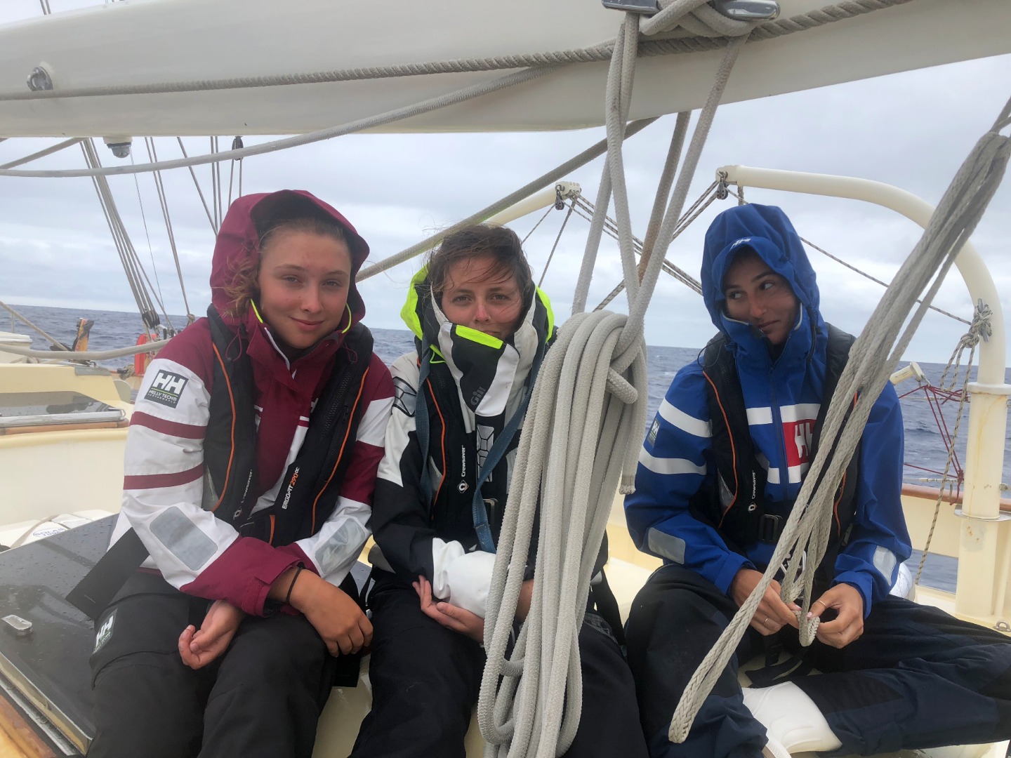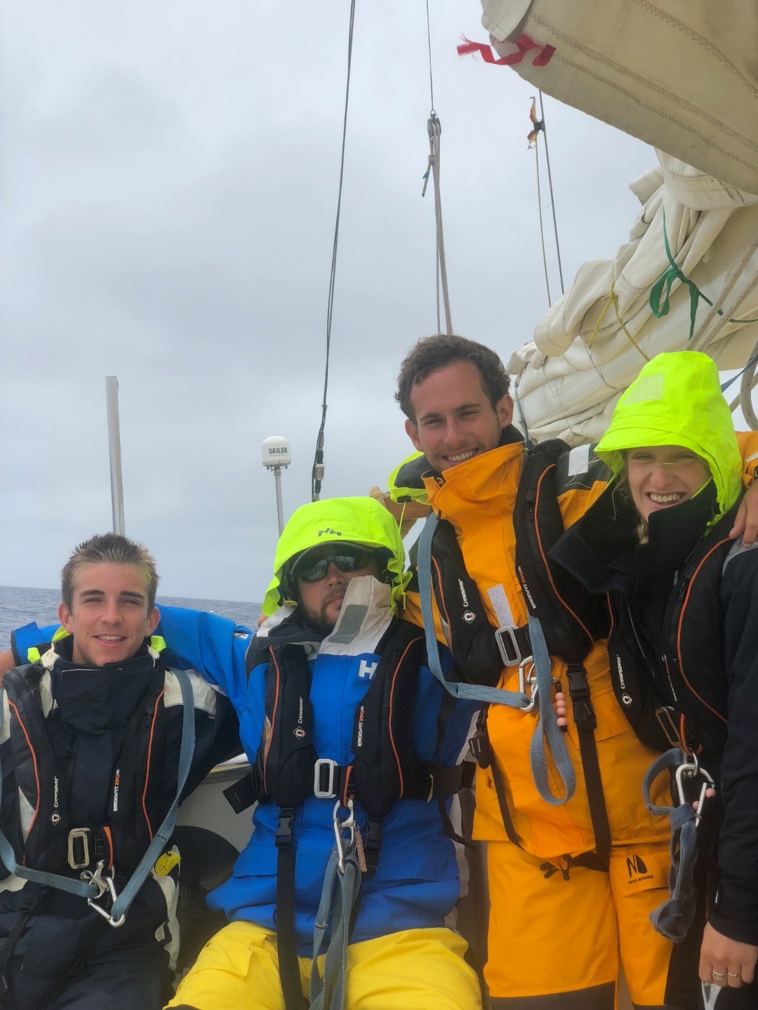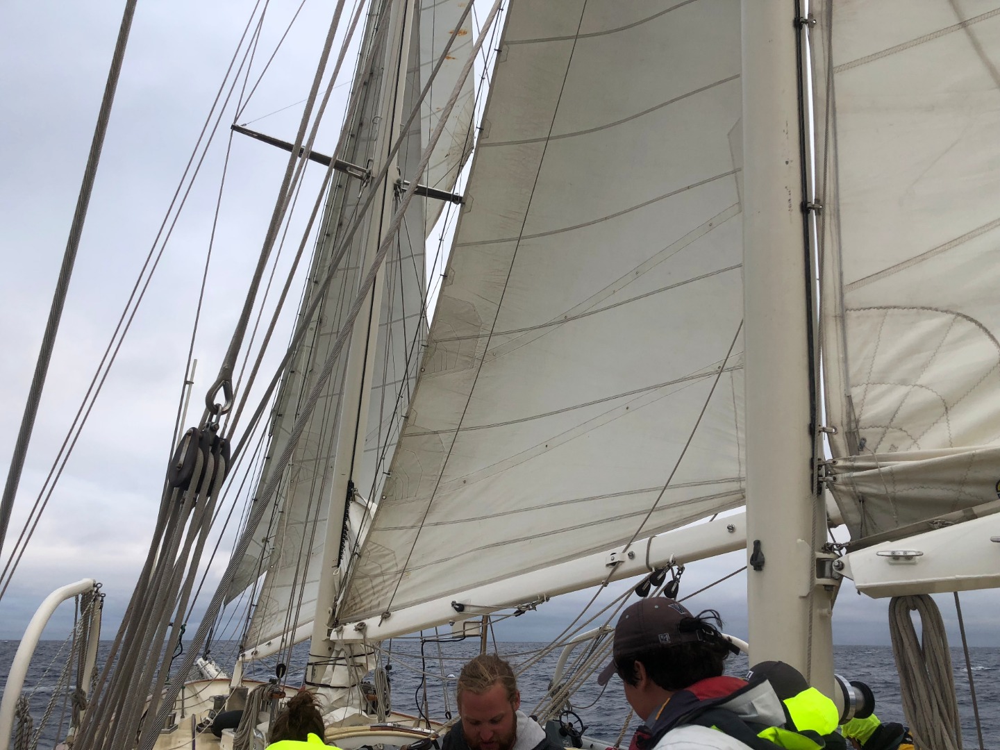 Being wet and cold was not the only fun aspect of this new weather system; wind speeds also picked up significantly. Because of this, we were able to raise most sails and turn the engine off, allowing us to finally turn on our sailing navigation lights (red over green). Together we were able to efficiently and quickly raise all sails while the chefs prepared our next meal.