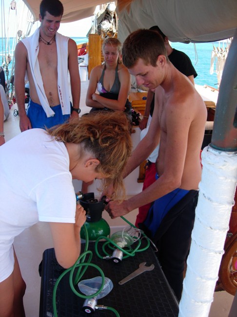 Today started off very relaxed. After breakfast, some people went on a research dive while others stayed on the boat. A few of the crew members tried windsurfing, and a few studied. In the afternoon, we began our Rescue Diver course. We finished up the day with Boomer teaching us first aid and Joe being strapped to the backboard, haha!