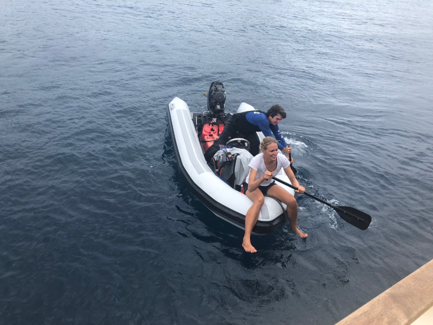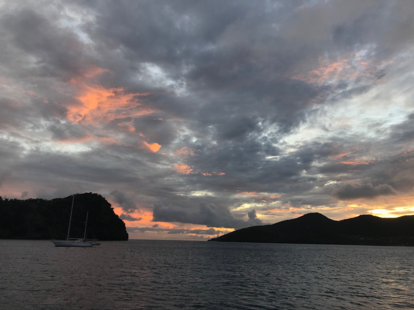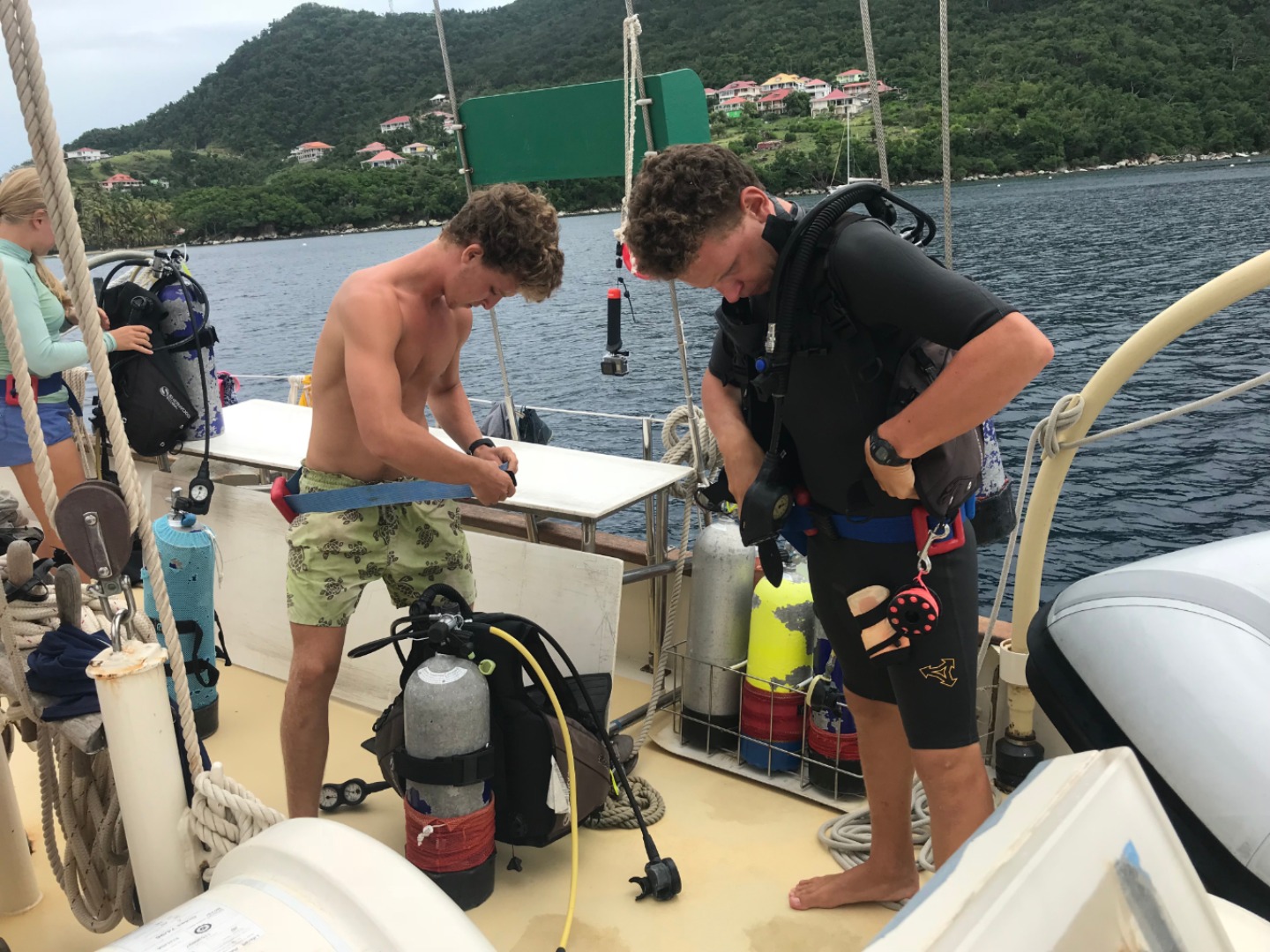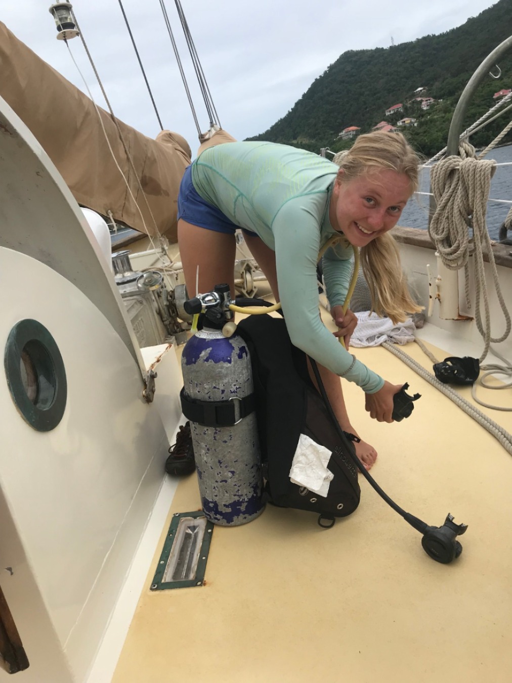 This morning we were met with a downpour of rain. I woke everyone up a few minutes later than usual since breakfast was being served below deck (don’t tell Captain Ian we weren’t up at exactly 7!). The wonderful chef team of Ian and Dasha made us chocolate chip pancakes and fried plantains (yes – we also got the plantains from our fruit tour in Dominica). After breakfast, Allie, Dasha, Sinclair, Ian, Sam, and Will began their PADI Rescue SCUBA course by watching the instructional videos below, waiting out the rain. During this, Emma and I had a very relaxing movie day, starting with The Devil Wears Prada and The Proposal. We were all on deck as we saw our beautiful dinghy being rowed back to the boat by Ian and Carolyn after a slight engine mishap (which they fixed after what looked to be a very long and difficult day of engine work). Ian and Dasha made quesadillas and tomato soup for lunch, a perfect meal for a rainy day. After lunch, the rain stopped just in time for the rescue divers in training to get in the water to do their first set of training exercises. This began with Steve pretending to drown in the water and giving the students time to get all their gear on and get in the water (they all said sorry for almost letting Steve “drown”). They took turns pulling each other around the boat, which looked more like fun than training, but Steve insisted it was part of the course (Emma and I continued our movie day with Bring It On). For dinner, Ian and Dasha made Sum Gully (shoutout to Ian’s family for the recipe!). Following dinner, we had a Seamanship class with Carolyn and reviewed some of our skills for our Nav Master exam. We’re all heading to bed early to get ready for our day ashore tomorrow! (after Emma and I finish our movie night with Coco, of course.)