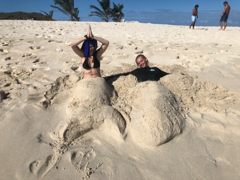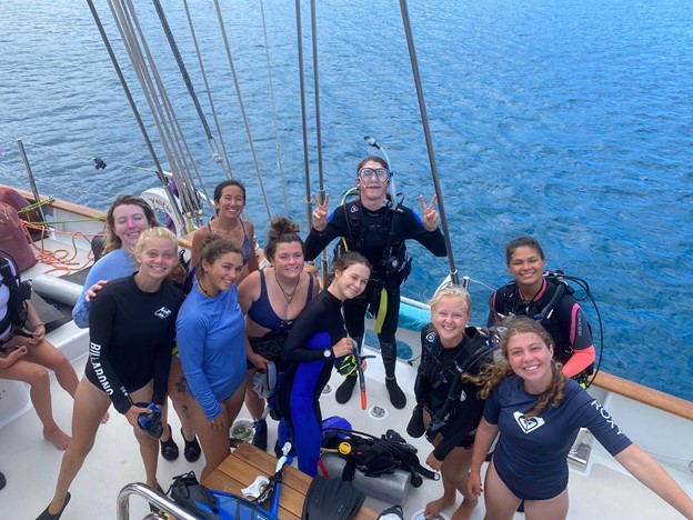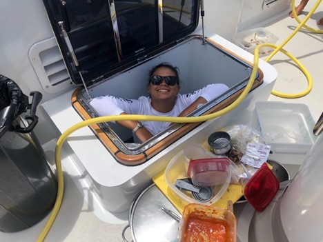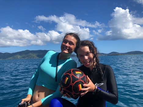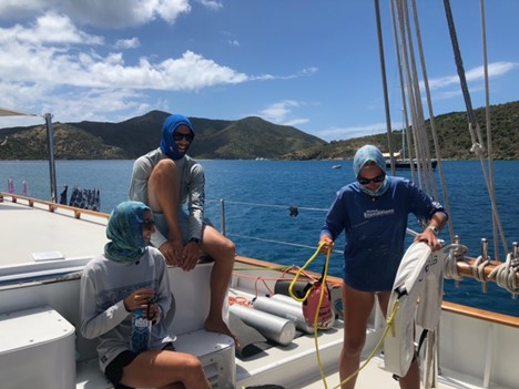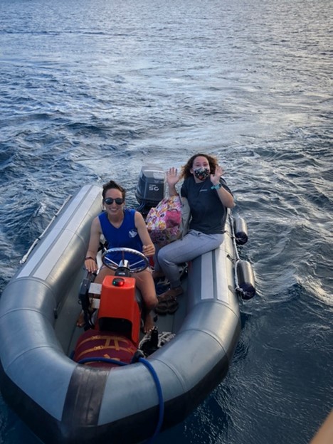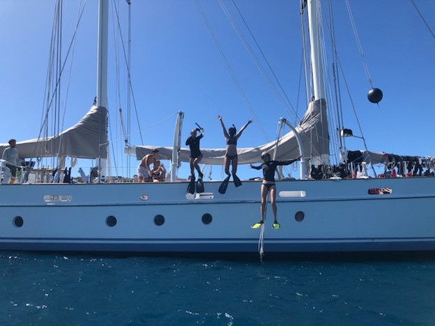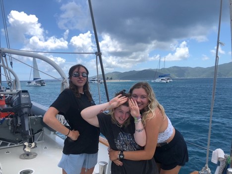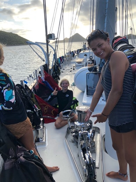 The group that went to the beach had tons of fun, and the best thing happened on our way back to the boat. A group of us were in the dinghy with Smash driving, and Smash asked us if any of us had ever done a backflip off of a dinghy before. She then stops the dinghy, and we immediately all jump/flip off the dinghy without hesitation. Smash then begins to drive away and laughs though she did come back for us, it was very funny. Once everyone was back on Vela, we moved back to West End to pick up Lizzie. On the way over, some of us took our rescue exam, and all of us passed! Lizzie was picked up at the dock and made it back to the boat with lots of smiles, hugs, and stories. We are all very glad to have her back with us! Carolyn then came back to the boat after a long day of provisioning for the next two weeks, and everyone worked together to get all of the food and supplies put away before dinner. We are always so grateful when Carolyn brings us back fresh food! Dinner was a delicious chicken Cesar salad, and for squeeze, we said our appreciations of the day and the silliest fact or thing that we believed when we were younger; all of the stories were very funny. The last couple of people doing the rescue course took their exams after dinner. Overall the day was awesome, and so many fun memories were made!