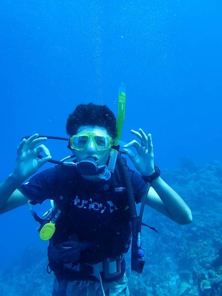 The crew was awakened this morning to the sound of the anchor dropping and confused that their surroundings had changed since their night dive last night. The staff got an early start, around 5 am, shared cups of coffee, and moved the boat around Pain de Sucre. After breakfast, students learned about the different layers within the earth and how they affect the bathymetry (underwater topography for all you landlubber non-scientists?) of the ocean floor. Research teams then donned their scuba gear and completed their project dives. One group, consisting of Mollie, Brandon, Megan, and Boots, dives to see what effect the boats that utilize moorings have on the corals beneath them. Specifically, they are researching the different diseases that are associated with humans, comparing them with other islands and the amount of annual use they receive. The other group, Shea, Jon, Sam, and Noah, are interested in which reef fish prefer specific species of corals. They are hoping to gain a better understanding of the behavior and specific habitat requirements of these fish. The crew then headed into town for a French lunch and stroll around the quiet European beach. Some homework and windsurfing ensued upon arrival back on Ocean Star. Dinner was particularly well cooked, and everyone was in a great mood as we all gathered around the cockpit for a movie night on the projector that Sam had organized for everyone. If you will excuse me now, I need to begin my stretching in preparation for my mile race versus Boots (she runs marathons) tomorrow. Time will tell if I am still in the same shape I think I am. I haven’t really run since college!