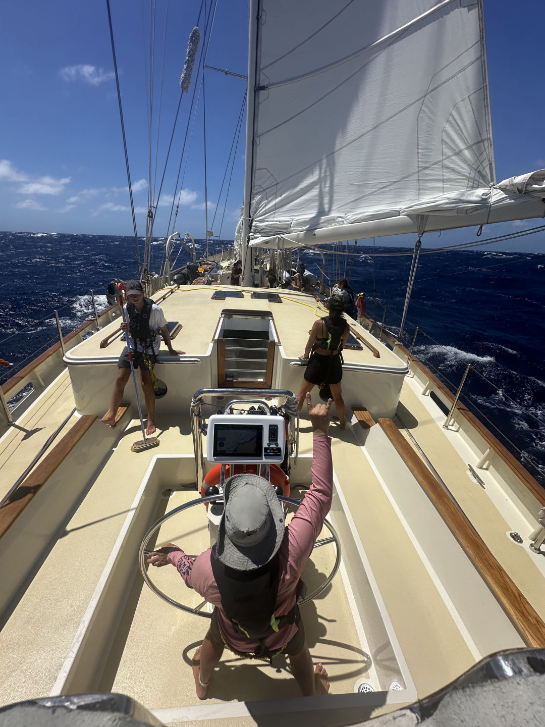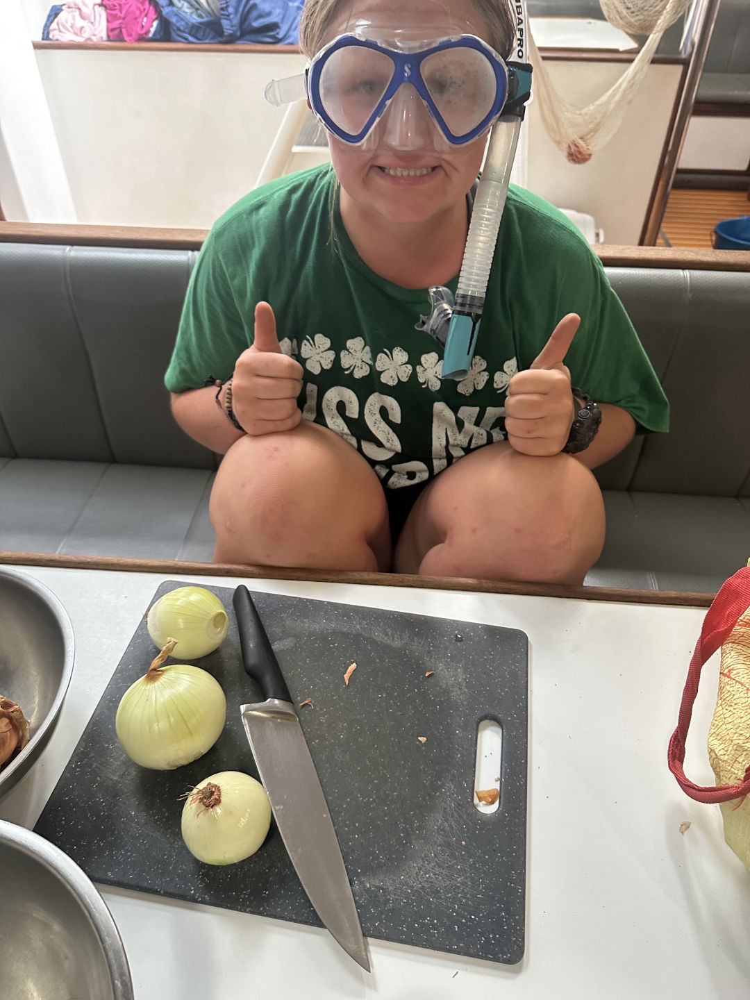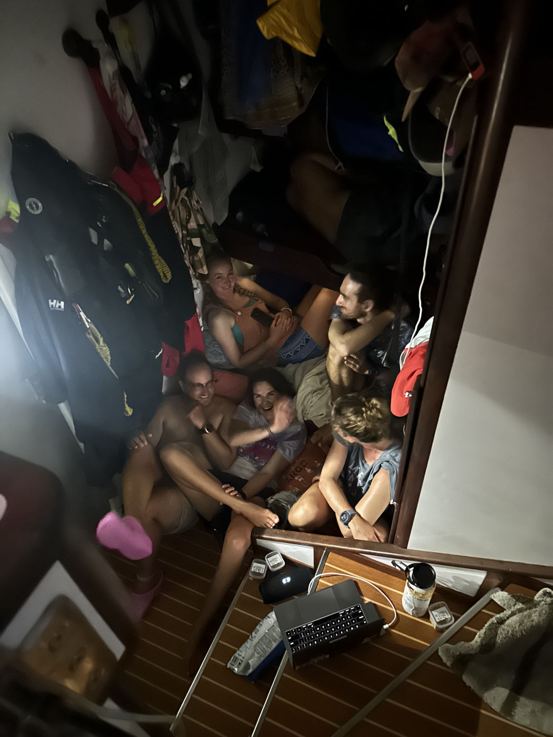 I quickly split the crew into groups to be shuttled to an island that consisted of a small runway, a volleyball court, two hammocks, immigration services, and a military base, of course. Afterward, we came back to the boat to start getting Argo ready for her next date with the ocean. While we were preparing to wash the deck, Mac bought ten coconuts to share from a local man who pulled along our starboard side in his dugout canoe. For lunch, we had some amazing baguette sandwiches prepared by Alexandra, which reminded me of the time we spent in Les Saintes. I spent a good amount of time cleaning and wiping down different bilges below the deck while others either cleaned the saloon, prepared food, or washed the deck. BA is an all-hands-on-deck activity, to say the least. We finished up the day by having some jump in showers and a quick oceanography class before getting into dinner. It is an odd feeling thinking about how every student on this boat decided to embark on this journey for a multitude of different reasons, and less than a month ago, we had no idea what to expect getting onto a boat full of people we’d never met before. Yet now we are a family of sorts, dysfunctional like most, yet determined to achieve a common goal. Can’t forget that some of the locals will put a mast, boom, and small sail on their canoe and sail around the bay, which I think is sick!