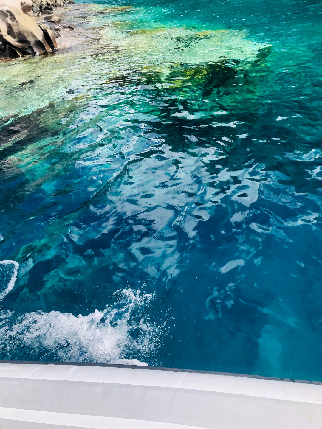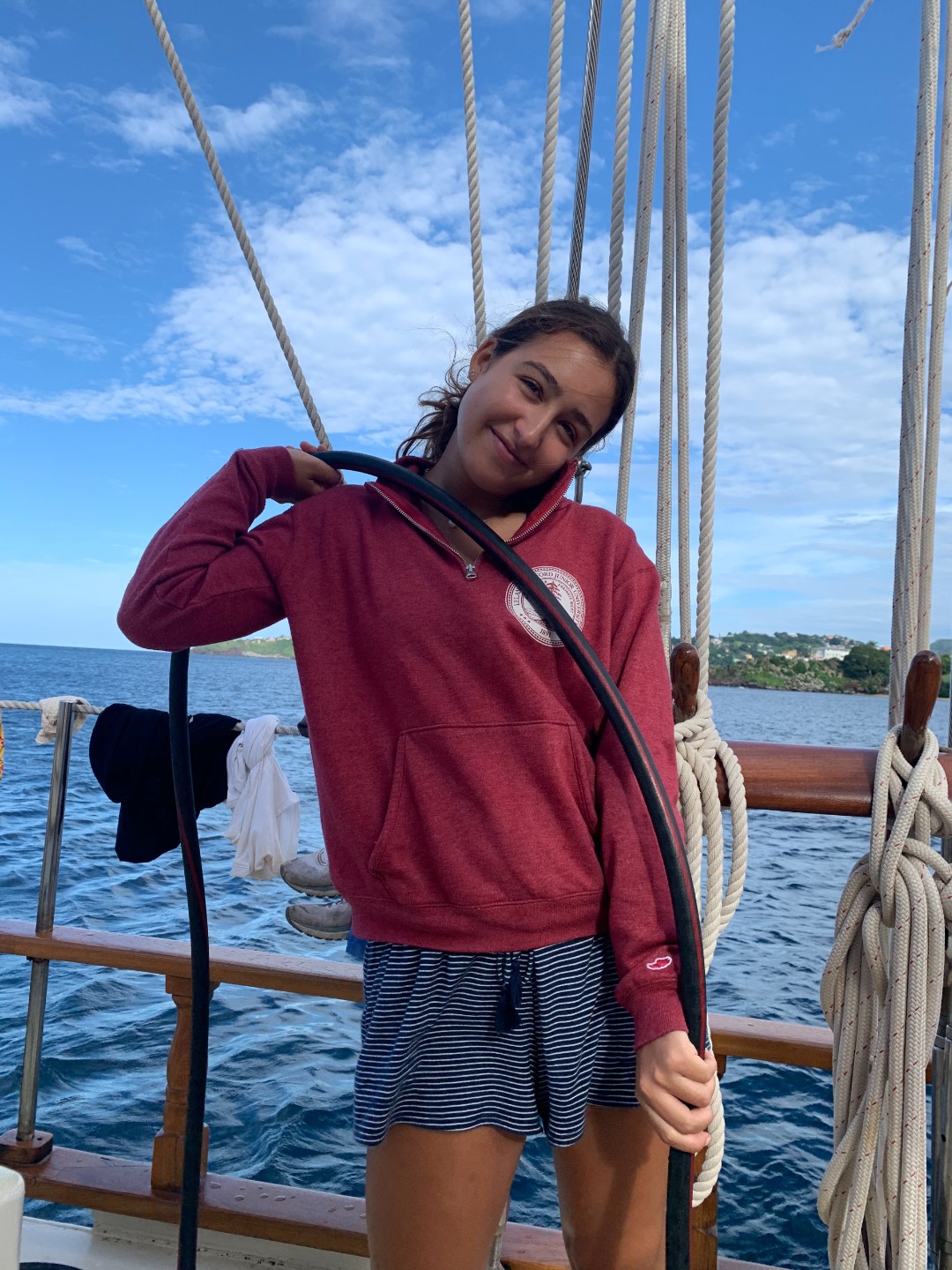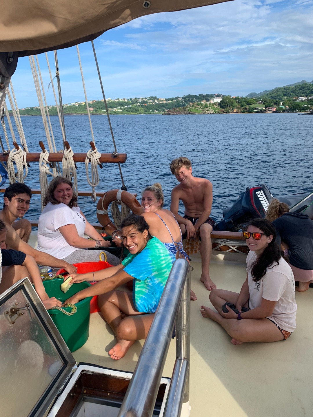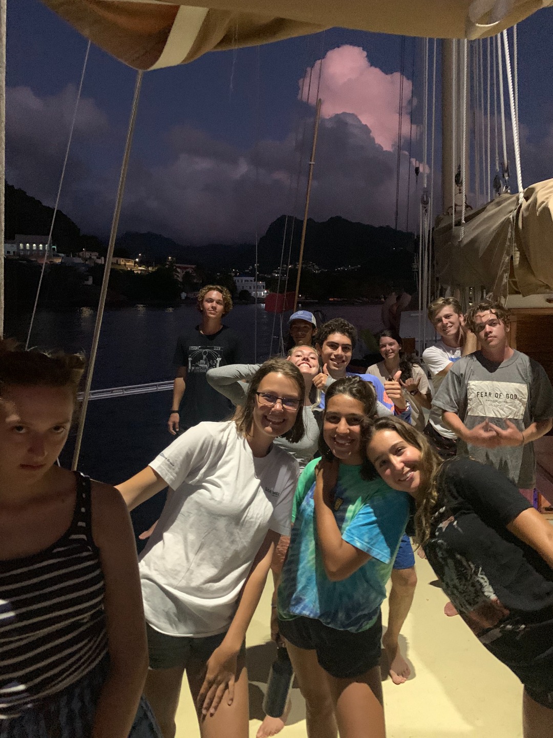Only 5:30, and already half of us are up, stumbling to grab some coffee to summon the energy we need to finish our Literature Review papers that are due tomorrow. At 6:30, only one sleeping person remains Chief, of course. Breakfast was a satisfying meal of granola and “fresh” (canned) fruit, although many people already dove into their cereal that they bought onshore yesterday. After the meal, we had a Seamanship class filled with mixed emotions upon getting our IYT (international yacht training) exams back. We then crammed in another class, marine biology, in which we learned about sharks and other fishes bleh. When we emerged out of the salon, we had motored around the corner to Petite Byhaut, a gorgeous more secluded bay with large rock formations.