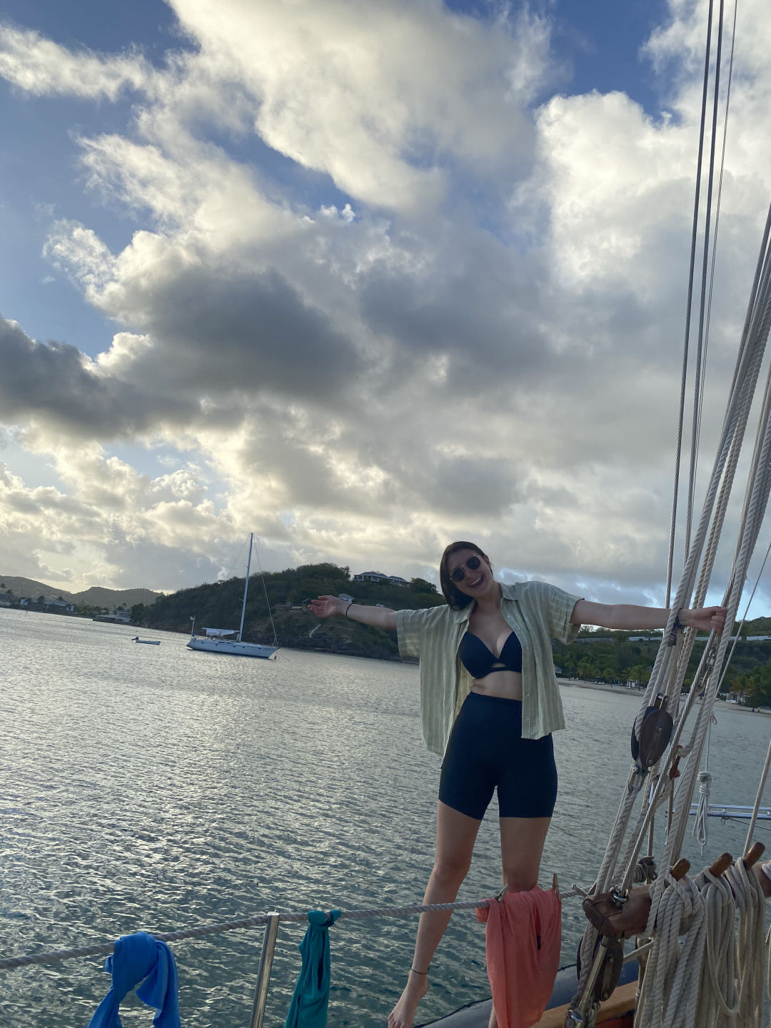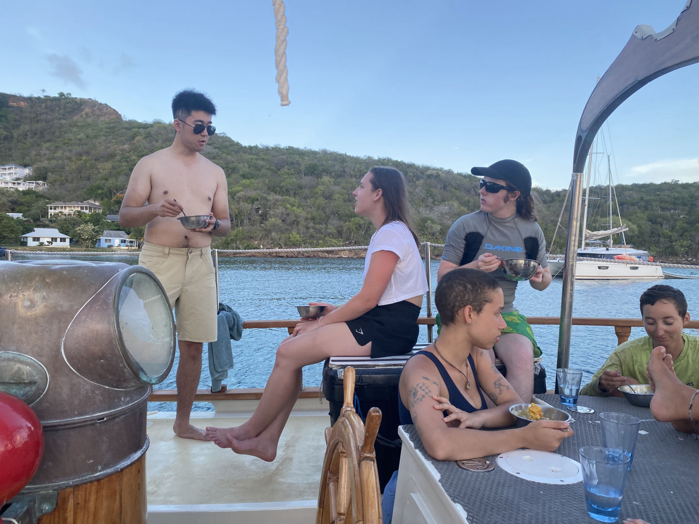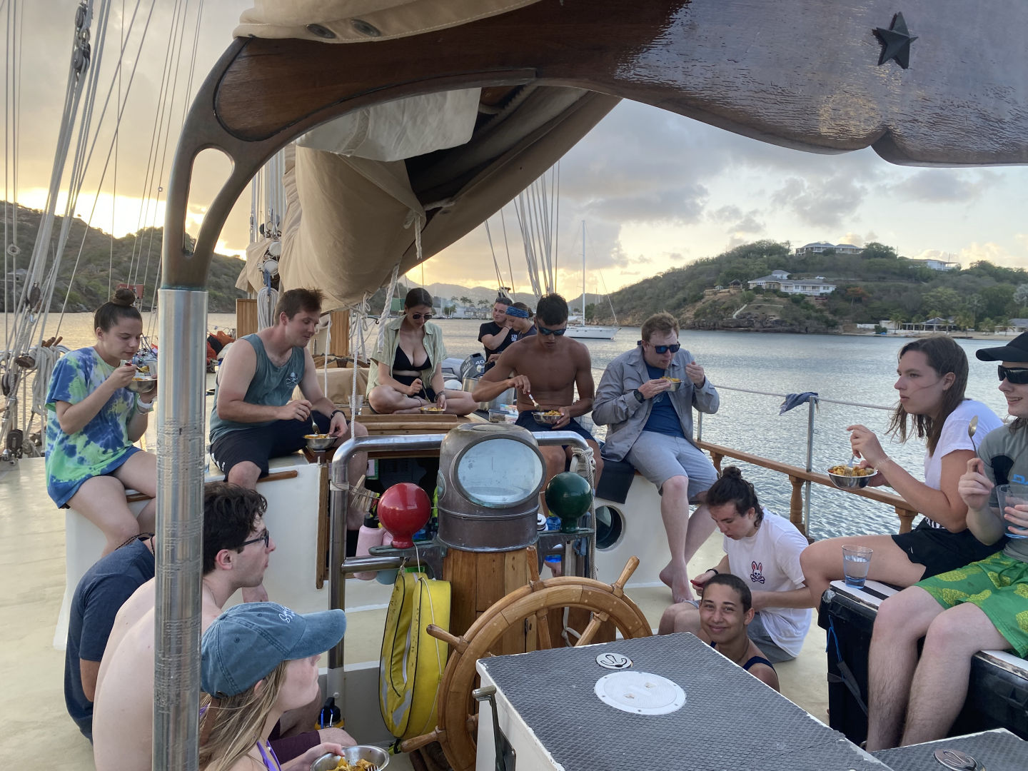 A black bean burger was served with a side of homemade fries, and then it was back to work. As the new two members of our crew joined, we celebrated the thought of finally leaving port and getting a chance to jump in these blue Caribbean waters. We raised the anchor and set sail, settling on a white sand beach with the ocean and mountains in the background. Everyone waited attentively on deck for the signal that we could finally jump into the pristine waters for our swim test. We were to swim 400 yards (8 laps around the boat) and then tread water for ten minutes. I started strong on lap one, but by lap 8, I think I swallowed enough seawater to start my own fish tank. After we all successfully passed, we were able to enjoy the water on our own terms. We donned the masks and snorkels and were lucky enough to see two stingrays right below us buried in the sand. While wet, we soaped up and jumped back into the water repeatedly, often via cannonball. A splash competition was held, and a victor was crowned, laughs were had, and tears were shed. After all of the excitement of the day, we settled down over curry and rice and shared what we were grateful for during our first day at sea as we watched the sun set on another fantastic day in Antigua. With some free time before bed, we eagerly wait in anticipation of the next adventure when we wake up on another day of Seamester.