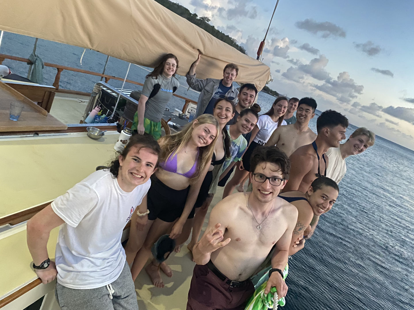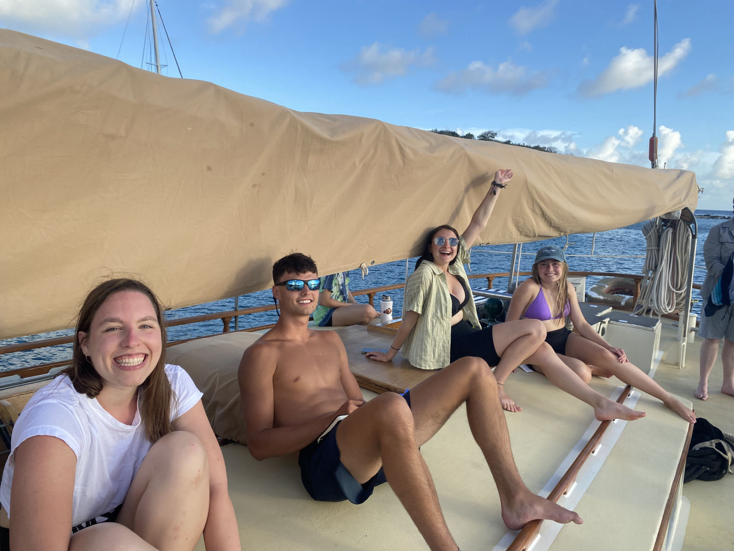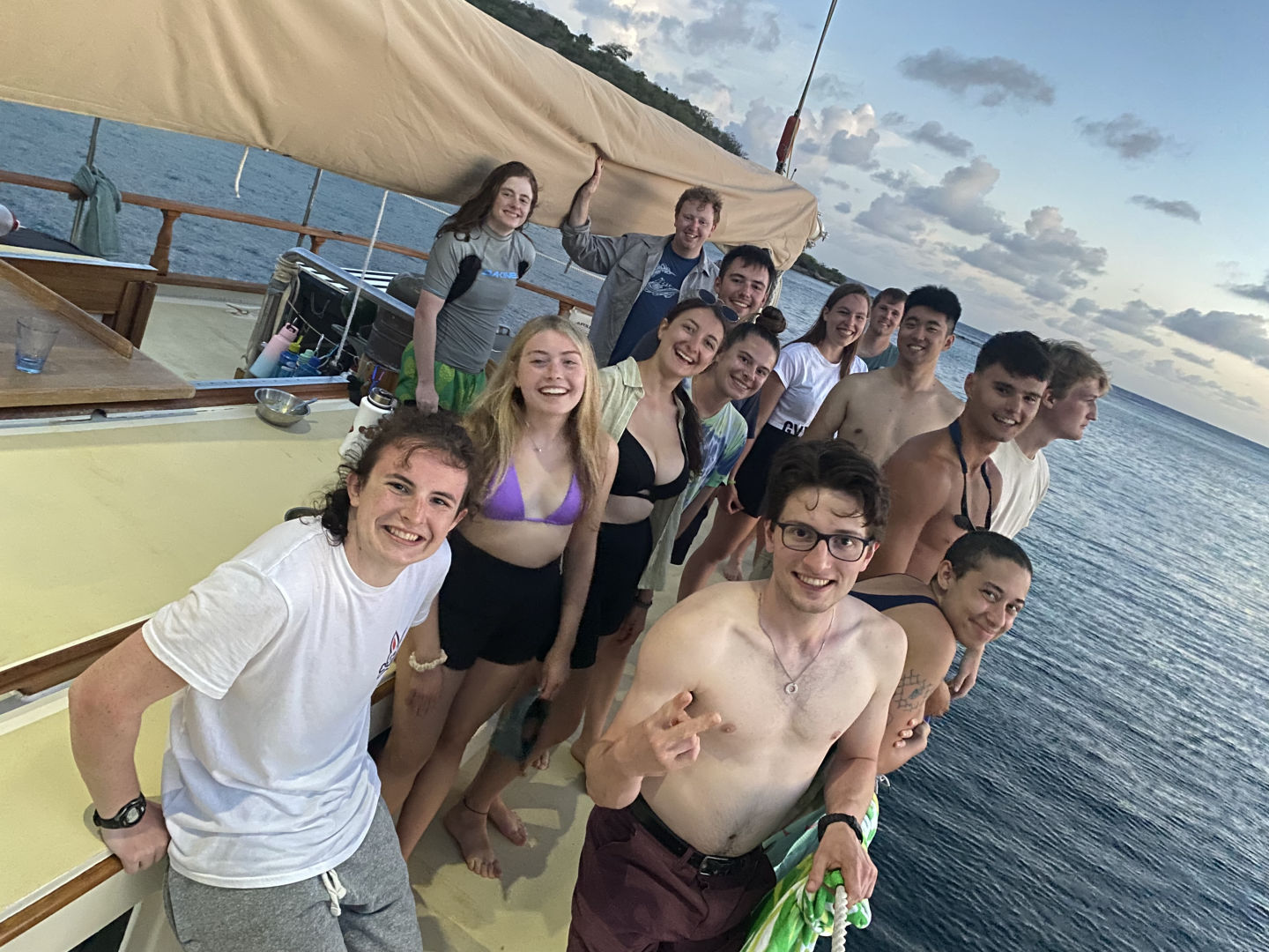 A black bean burger was served with a side of homemade fries, and then it was back to work. As the new two members of our crew joined, we celebrated the thought of finally leaving port and getting a chance to jump in these blue Caribbean waters. We raised the anchor and set sail, settling on a white sand beach with the ocean and mountains in the background. Everyone waited attentively on deck for the signal that we could finally jump into the pristine waters for our swim test. We were to swim 400 yards (8 laps around the boat) and then tread water for ten minutes. I started strong on lap one, but by lap 8, I think I swallowed enough seawater to start my own fish tank. After we all successfully passed, we were able to enjoy the water on our own terms. We donned the masks and snorkels and were lucky enough to see two stingrays right below us buried in the sand. While wet, we soaped up and jumped back into the water repeatedly, often via cannonball. A splash competition was held, and a victor was crowned, laughs were had, and tears were shed. After all of the excitement of the day, we settled down over curry and rice and shared what we were grateful for during our first day at sea as we watched the sun set on another fantastic day in Antigua. With some free time before bed, we eagerly wait in anticipation of the next adventure when we wake up on another day of Seamester.