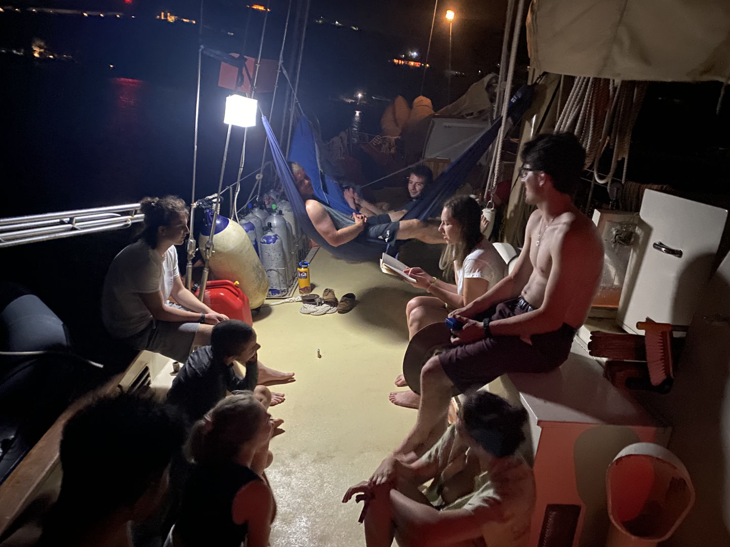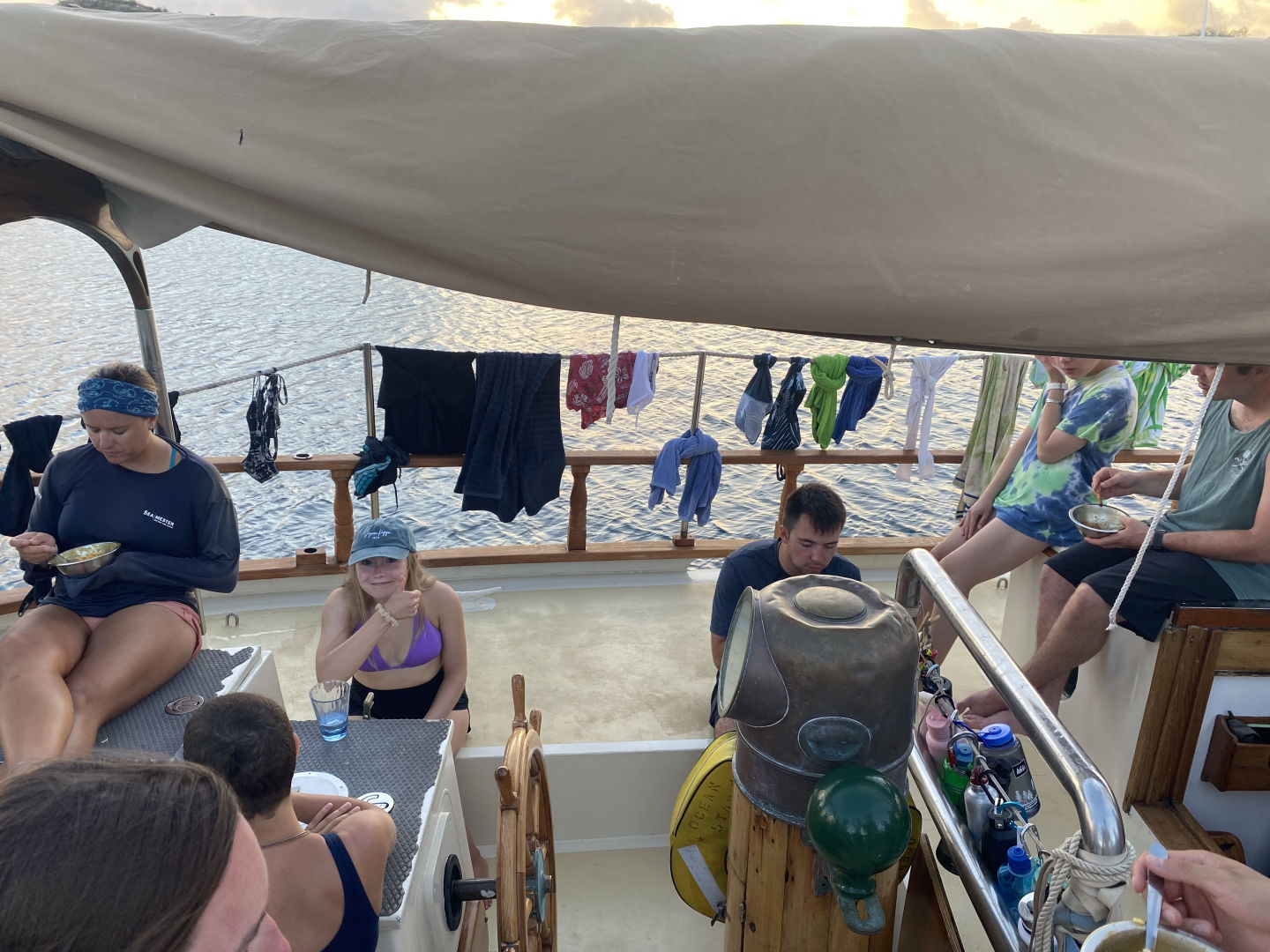 The sun rose on another beautiful day in Antigua, leaving the worries of airport travel and covid tests in the past. As skipper, I was tasked with waking up first to announce the start of our brand new adventure, which comes with each day. As we mustered on deck, we were treated to chia pudding, something I was completely unfamiliar with but would come to enjoy. After we filled our stomachs, we would come to learn our tasks on the boat and get a lay of the land. We put on the newly repaired sail and eagerly lent a hand in flaking it. Spirits are high, and participation on board is higher. When the instructors ask for help, it seems every student is ready to spring into action. I get the sense that if they asked us to jump, we would say how high? We individually stocked up on essentials like Gatorade and starbursts for the journey ahead of us. Then we had our first oceanography class in the saloon, and I can definitely say this was the first class where I did more sweating than note taking.
