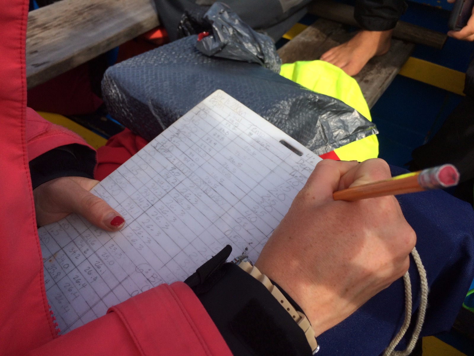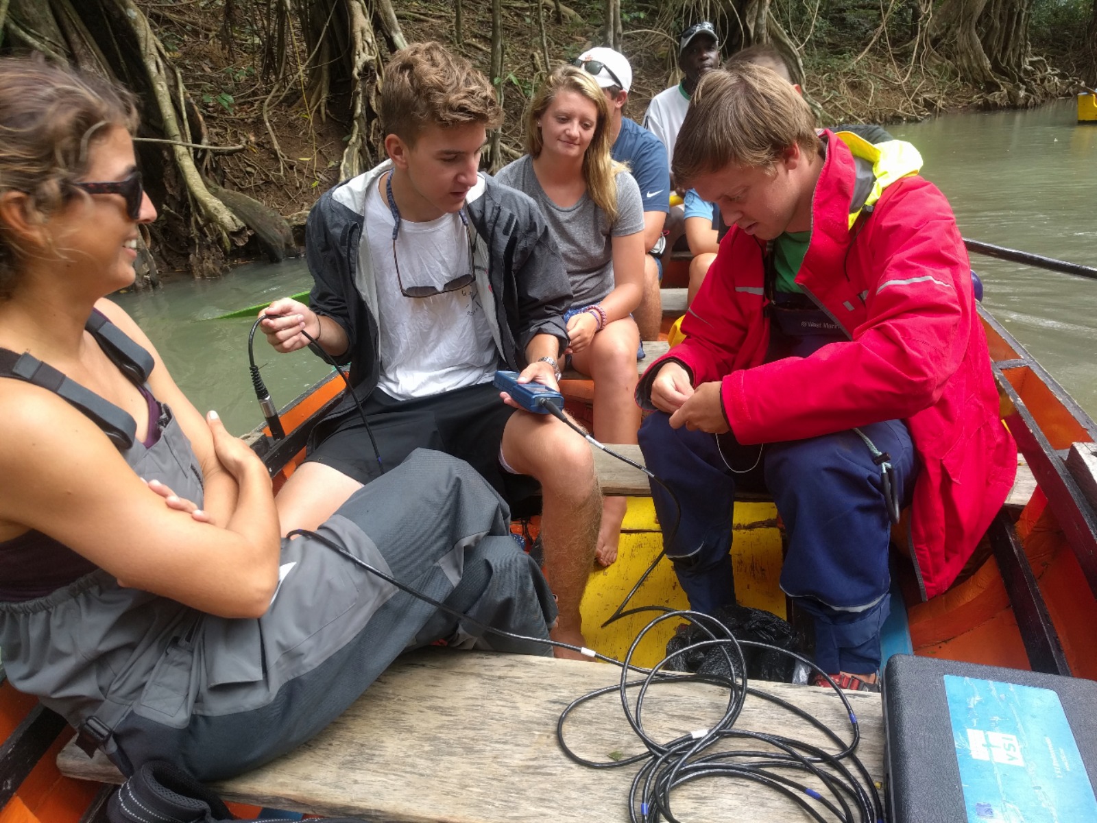 As per our usual routine, we began our day at 07:00 hours. After everyone struggled out of their bunks to the tune of some 80s music, by Asher’s request, we made sandwiches for our lunch out and enjoyed a delicious breakfast of apple walnut muffins as the rain started to sprinkle down on our heads once again. We quickly broke into breakfast cleanup and, with fears of being drenched by the oncoming rain, finished up in no time at all. We then gathered and packed our things needed for the day and headed up on deck in full foul-weather gear to discover the sun warmly shining down upon us. We then split into two groups, hopped aboard two wooden tour boats, and started for the Indian River. As we made our way up the river, the second boat took salinity and temperature readings at half-meter increments, starting from the surface, going down to four meters in eight separate locations. It is really awesome to see all the information we’ve been learning about in class now being used in the field.