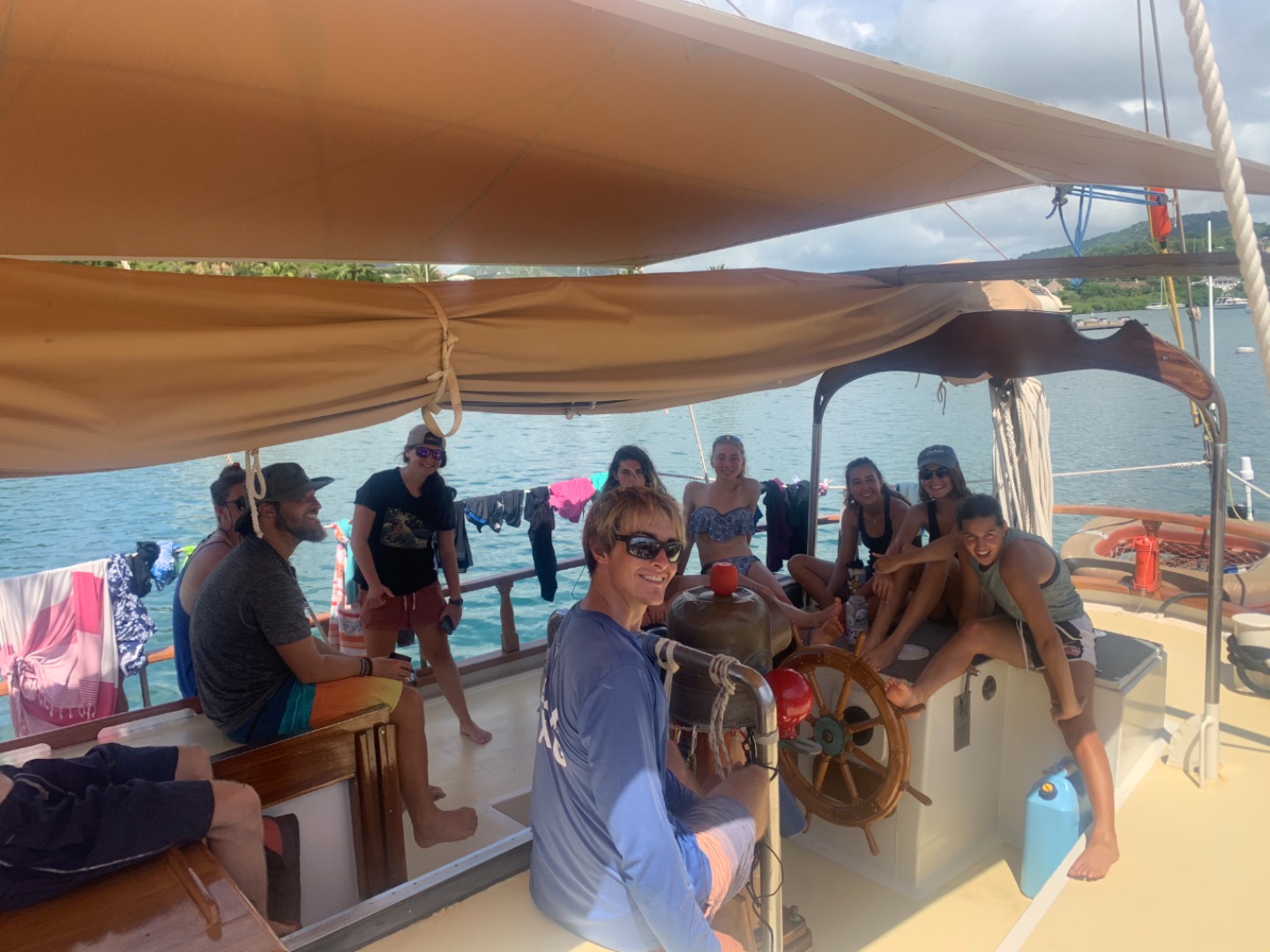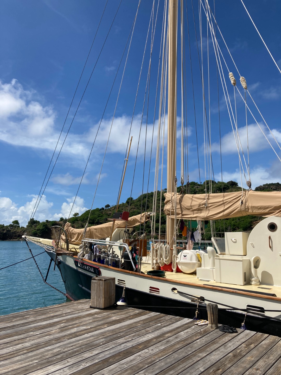 Quarantine on the Ocean Star has finally ended on this beautiful sunny day, raising high spirits among our crew members. This time, students were woken up to the loud but peaceful sound of me playing the steel drum. Many of us were more than delighted to hear some very good news; at last, we would have shore time after lunch. The ship made its way back to the English Harbor Shipyard as we anxiously sat through class. Our sea legs were surprised to step on land for the first time since we left dock on day four. We all took advantage of the privileges of being back onshore, whether it was going to a bathroom and showering with actual plumbing or going on a distant run to the peak of the nearest hilltop to enjoy a breathtaking view of the entire coastline. Once lunch was over, it was finally time to walk around the shore, explore local shops, enjoy iced lattes at the yacht club cafe, and visit grocery stores to load up on snacks for our imminent three-day sail to Grenada. The ship’s crew is also relieved to refuel on sleep, as the is no need to keep a watch on the anchor while the ship rests in the fuel dock tonight.