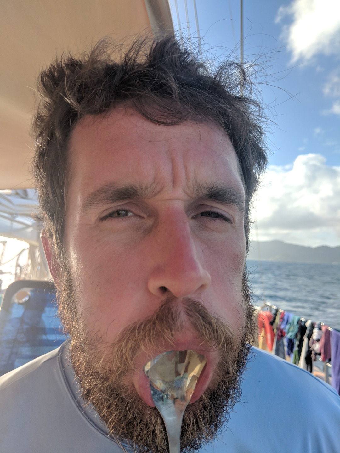 Pictured: the rust-busting Laz crew, Dan eating a spoon? And our last sunset from a mooring.