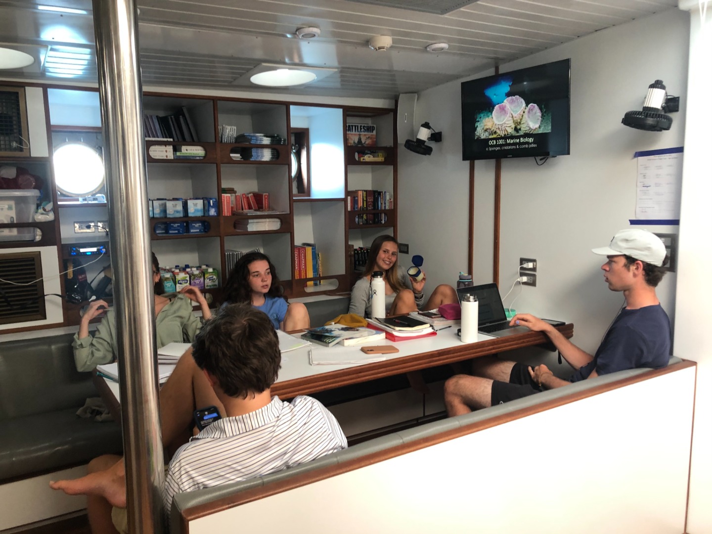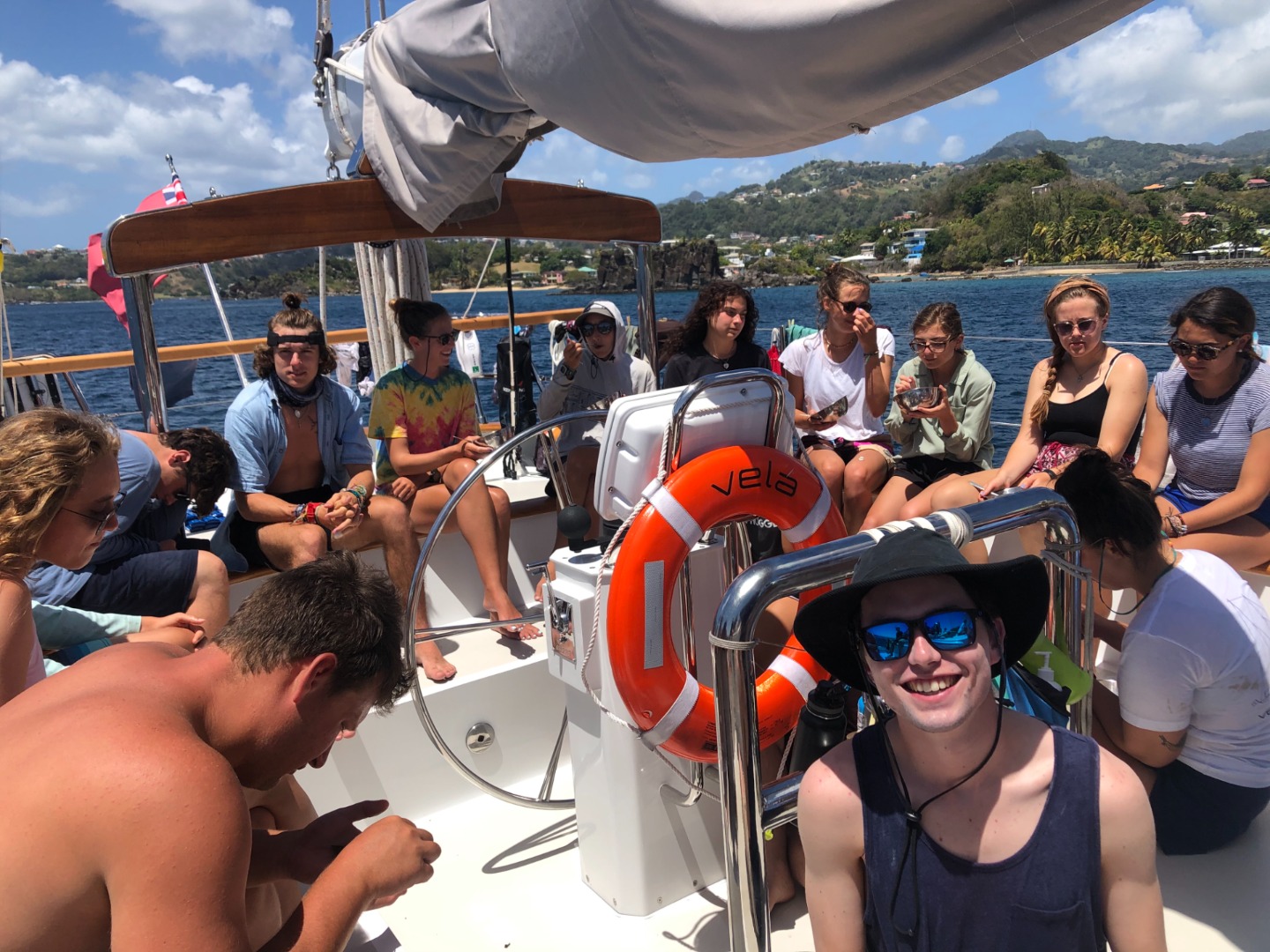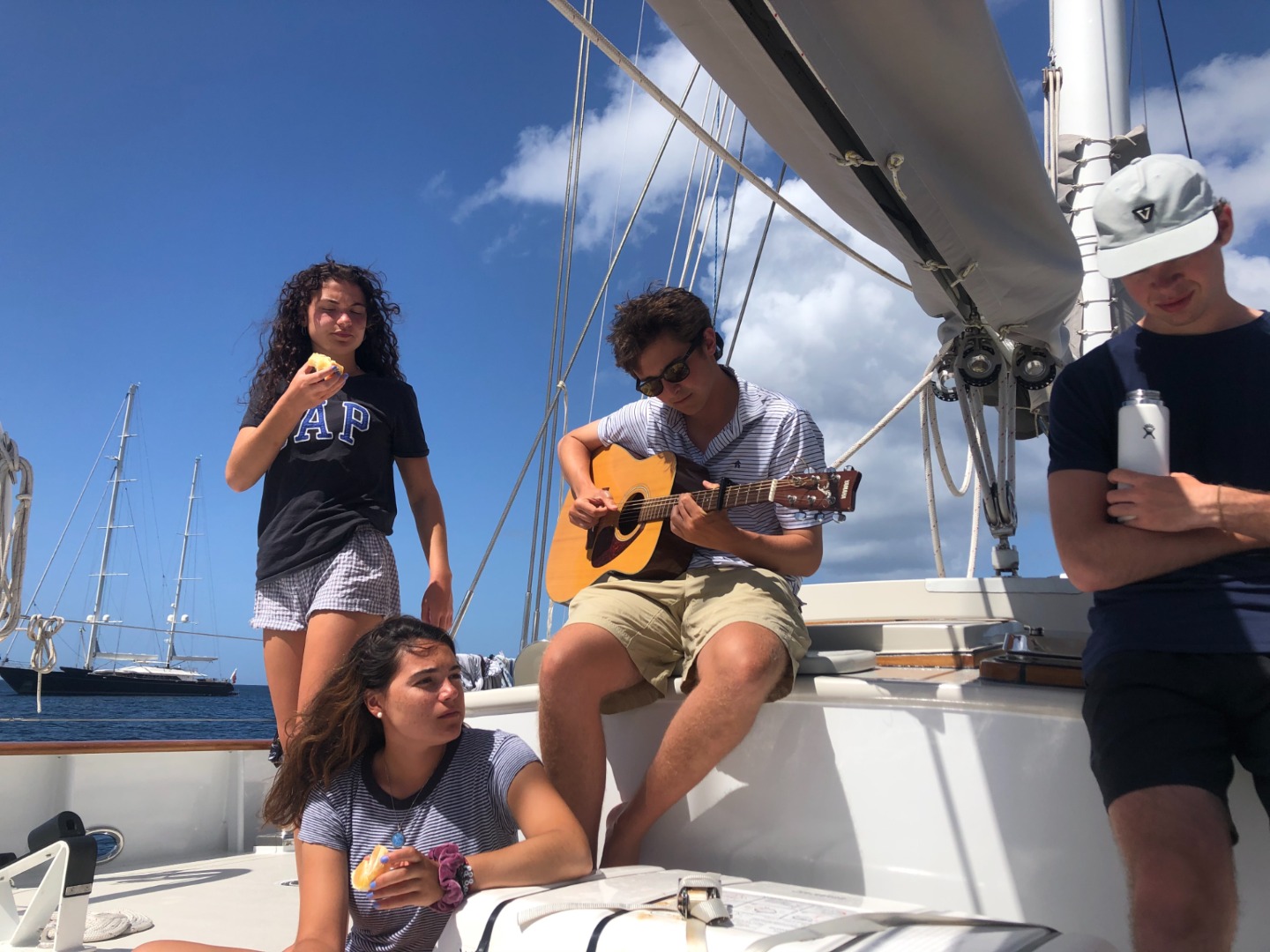 After our snorkel, we had a delicious breakfast made by Mackenzie, our amazing head chef today, of bagels, homemade hummus, and cucumbers. After breakfast, we got ready for classes this morning. Our first-class of the day was marine biology with Adelaide, where we learned about jellyfish…turns out the ones we were terrified of a few hours earlier were innocent comb jellies that weren’t going to sting us. In seamanship, we learned more about VHF radios and how to send and respond to mayday calls. We also reviewed proper radio etiquette and continued to practice the phonetic alphabet.
