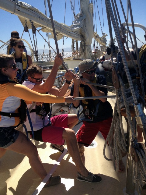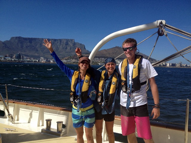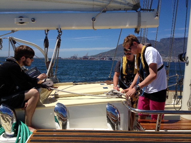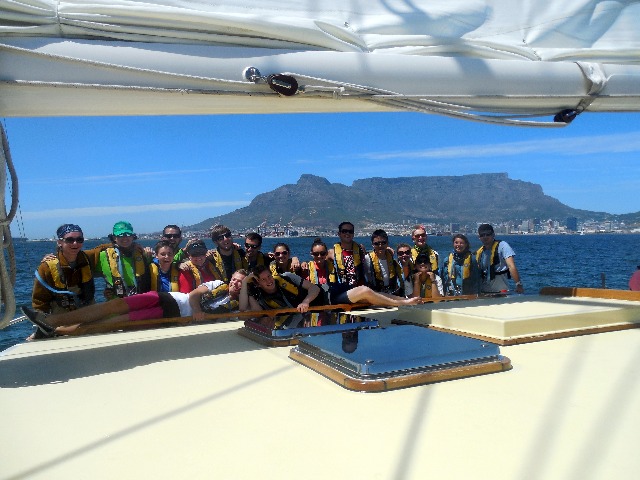This morning began with a bit of excitement as the crew of Argo was woken by a fire drill in order to test the skills that they had learned the day before. A speedy arrival on deck was rewarded with delicious pancakes made by our chefs Ben, Zach, and Benji. Once cleanup was finished, the final preparations for departure were made, and soon the crew was officially off the dock, headed out into the lee of Table Mountain. As if anticipating our intentions, the winds picked up just as we were leaving the dock to give us some appreciated wind. Students had a chance to practice their MTE (basic sail training) vocab as the sails were raised for the first time this semester. The morning and afternoon were filled with sail circles, tacking and jibing, sheeting in and easing out, close hauls, and broad reaches. Our students quickly picked up on all the foreign words and set to work learning to sail Argo as the beautiful vessel she is. Tired, excited, and with slightly sore hands, Argo’s crew finally dropped her sails and headed back into the V & A Waterfront for a quick shower before dinner. It was great to finally get off the dock for a day and feel the boat moving through the water once again. Our students are now more confident and comfortable on Argo and even more excited to put Table Mountain to our stern and chase down another horizon. It is exciting to see our students pick up on everything so quickly and see them enjoy sailing as much as we do!