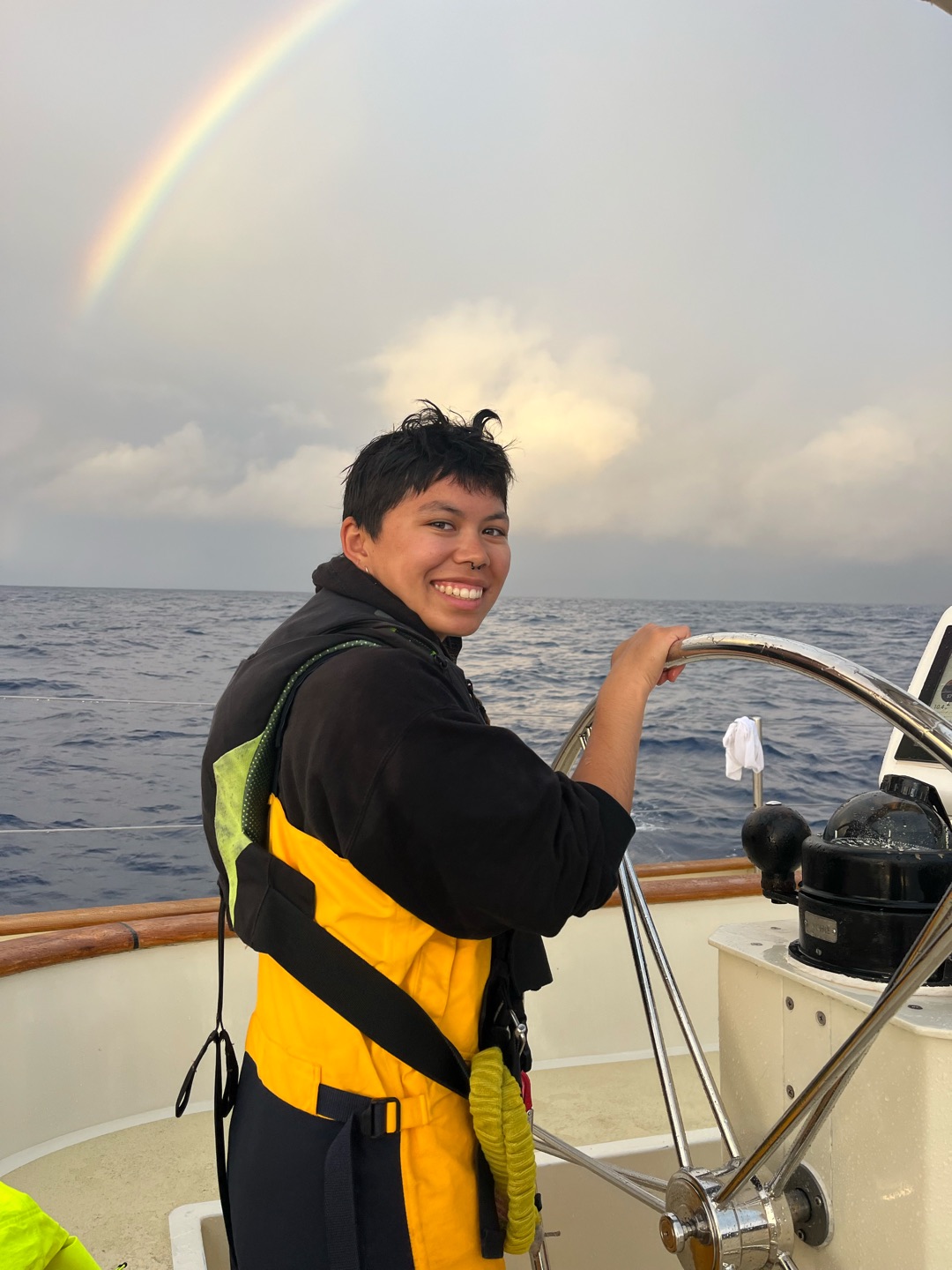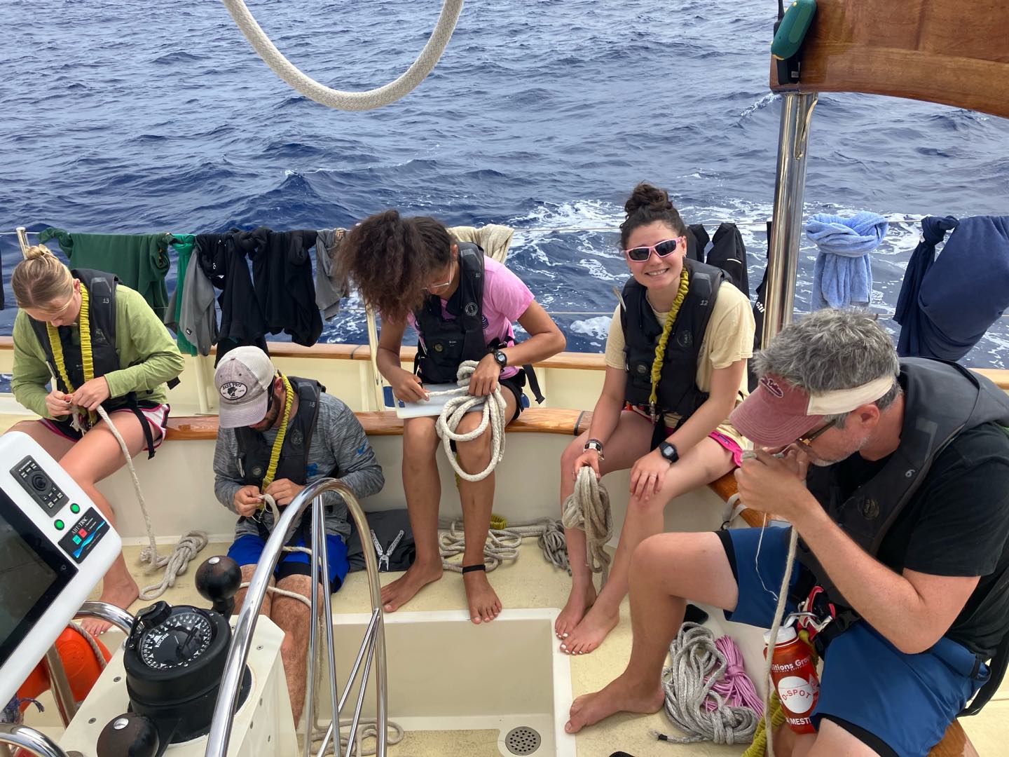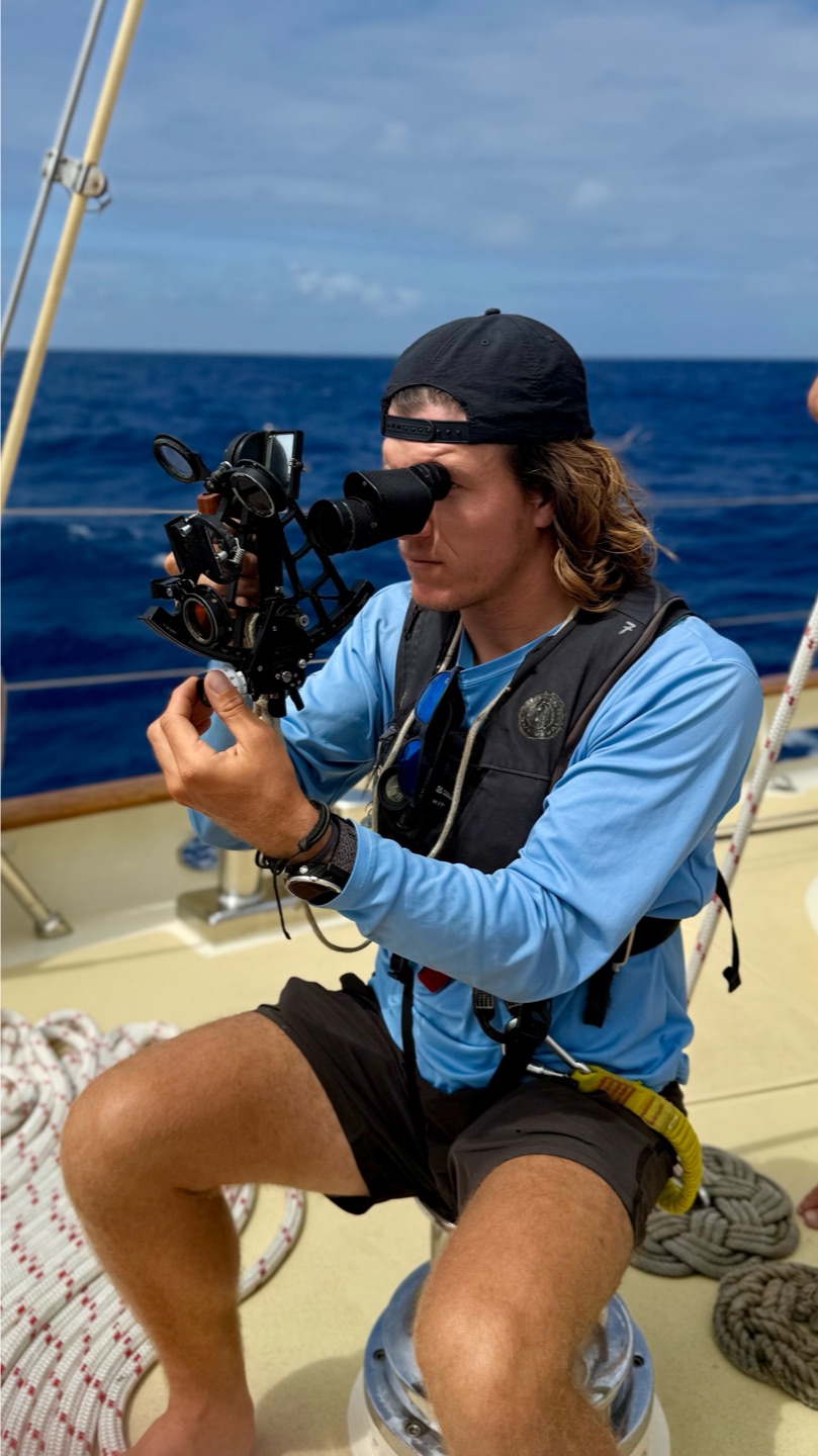 Our time on the morning watch today was filled with small boat projects, including some rope whipping and thump mat weaving, flushing the dinghy engines with fresh water, and repairing some plumbing issues in the forward heads. One exciting development today was the crews first attempt at learning celestial navigation! Calum came up with sextant in hand and led some staff and students through taking a sun-run-sun fix by measuring the angle of the sun above the horizon, finding a line of position, waiting 6 hours, repeating the process, and performing a running fix with the two lines to arrive at the ships coordinates using nothing but a sextant, some tables, and Calums massive brain.