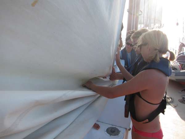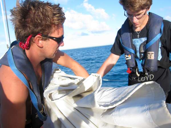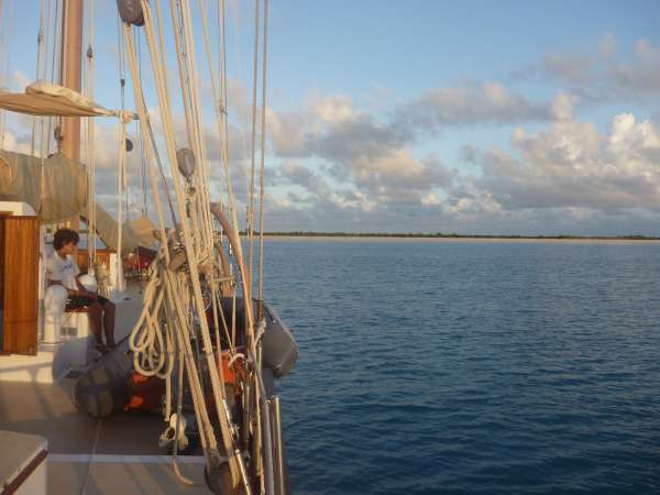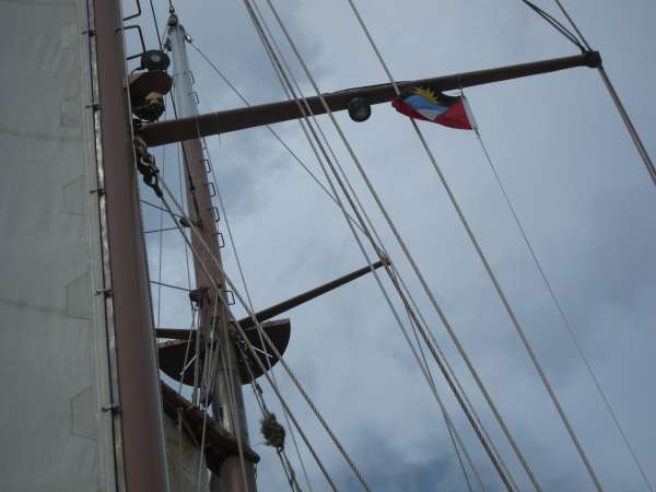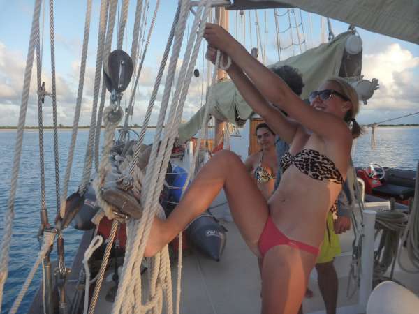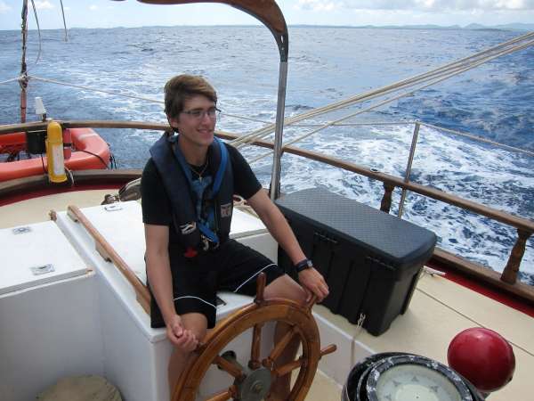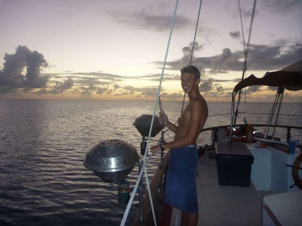The day started at 0715, the usual waking hour. The first activity of the day for the crew was an oceanography class with scientist Laurie. After class was over, it was all hands on deck to get the boat prepped for the 40-mile passage from Green Island To Barbuda. We rolled up the sail covers and lashed down all the loose objects on deck, and by the time we had the main engine fired up, the boat and crew were ready to move it along. We motored out through the tricky reefs surrounding Green Island. Once Ocean Star had a little breathing room, we put her into the wind and raised the mainsail, focsle, stays, and jib. Pointing the ship’s head just off the wind, we tacked out into the Atlantic to clear the tricky shoals and currents that run along the East coast of Antigua. Watch team two, led by your author, started it out, handing the boat over to watch team three just before lunch with a squall bearing down from the east. Those among us who weren’t busy in the galley strapped into our foul weather gear and prepared to face the fury. Anyone in the crew hoping for a good story to tell the landlubbers back home was disappointed when the anticipated squall blew itself apart, leaving the crew of Ocean Star fully suited up to battle light winds and a gentle 15-minute sprinkle. The off-watch crew stood down, which meant a midday snooze for watch team two (again, that’s me). Rocked to sleep by the Atlantic swell, I was woken up just in time for our arrival in Barbuda. Once again, we went all hands on deck for a student-led sail drop (Is it a good or a bad thing that they don’t need the staff anymore?) We (actually the students) led the anchor drop in 15 ft. of blue water just off one of Barbuda’s miles-long, completely uninhabited, white-sand beaches. The cherry on top? Double dose of learning after dinner; navigation with Capt. Kevin, and another oceanography with Laurie.