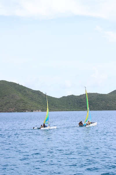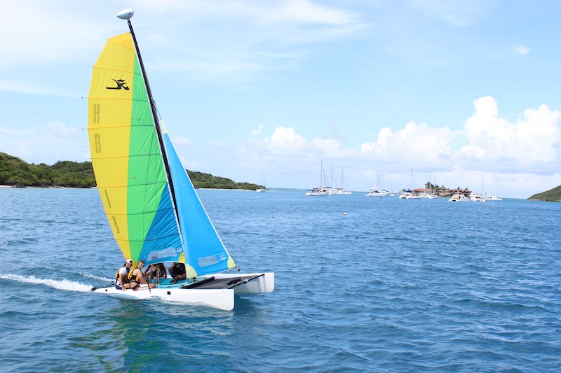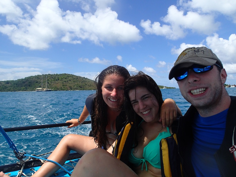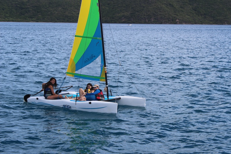 We’re still anchored in Gorda Sound. This morning, we practiced sailing on small sloops rented for us by the staff. I still can’t figure out what half the commands mean, but we’re all improving. Everyone got a turn driving. As long as we remember that steering right makes the boat turn left, we’re fine. Six crew members practiced, while six others stayed on board and took their Open Water Diver exams. After each group finished, we switched off. During lunch, Tor told us that everyone passed his or her exam, so we are all officially certified as scuba divers! After lunch, our poor Sydney took a hit. We eat and wash dishes above and pass dishes through a hole in the deck, also called the hatch. Today, she was below deck when someone tried to toss down a bottle of bleach. She’s fine, but she had to rinse off. Tor tells us that today’s lesson is: Don’t toss things down the hatch. After that, we kept practicing sailing on Hobie Cats’ awesome boats with two sails and two hulls connected by a mesh tarp. Once, we saw another group capsize. It was funny, not scary. Hobie Cats are easily righted again and designed not to sink. That group had time to scramble to the top of one hull as it rose into the air. They were physically fine but embarrassed. We are proud to say that none of our Cats capsized, though. It’s awesome that way. Beyond that, we had free time to study, work on tans, or whatever. Tonight, we’re going to a Beach Barbeque with other ActionQuest crews and having our first night out at Saba Rock. Pretty good day!