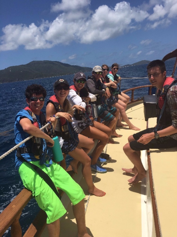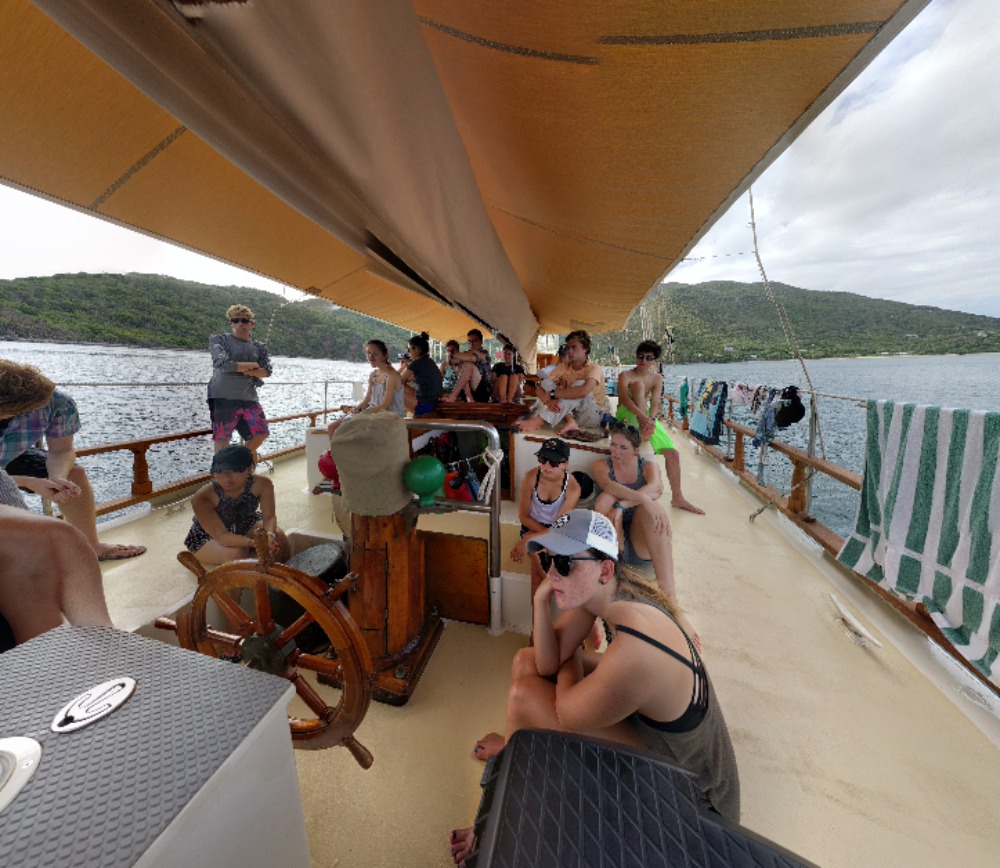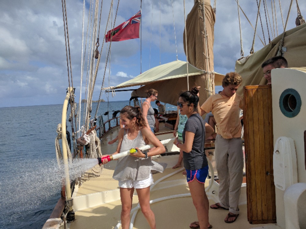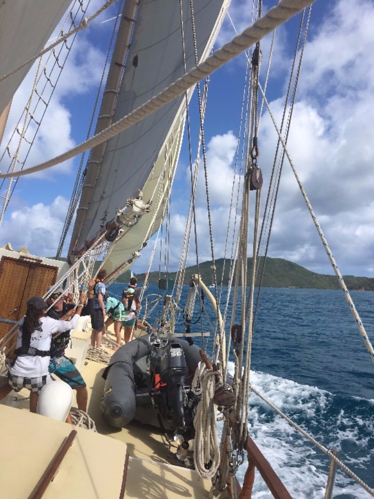 Today was our first intensive day allotted to sail training! After a spectacular breakfast of French toast and, let’s be honest, mostly Nutella, we went over some safety procedures and eventually got underway. We drilled and practiced with the fire hose, had the opportunity to attempt a man overboard procedure as Shelby lost her hat, and Anya sighted it in the water five minutes later. We managed to get all six sails flying during the passage from Mountain Point to North Sound and entered our anchorage sailing with five, a feat which earned us a lot of compliments because Ocean Star is a gorgeous ship. Now, everyone onboard can name the majority of the lines, can tack with a flying jib and jib run-up, can rig up a fisherman sail, and can comfortably speak using complex nautical vocabulary terms. We did a lot of tacks for practice, and almost everyone got a chance to be a helmsman. During this evening’s squeeze question, I learned that, given the opportunity to have any animal, real or extinct, or imaginary, as a pet, about half the crew would choose dogs. Luckily, we had a Velociraptor, a dragon, and a phoenix, so I guess that somewhat redeems my crewmate’s lack of originality. But seriously, only dogs?!?! As for other fun stories, Shelby decided that the best spot to sit on the boat is the windward aft cap rail with your arms hung over lifelines, and got everyone to join her there and share about their best day of college. A bystander said Ocean Star was the “most beautiful ship I’ve seen all week,” when she’s clearly the most beautiful he’s seen in his life. Ian claims that we are currently anchored by the yacht club where Taylor Swift and Harry Styles broke up, so I think I know what music we’ll be waking up to tomorrow. It was fantastic to finally spend a day sailing, and I can’t wait for the longer passages coming up soon!