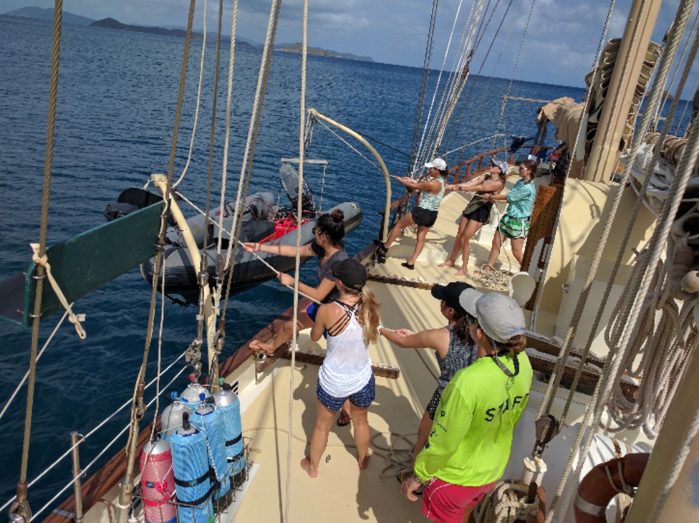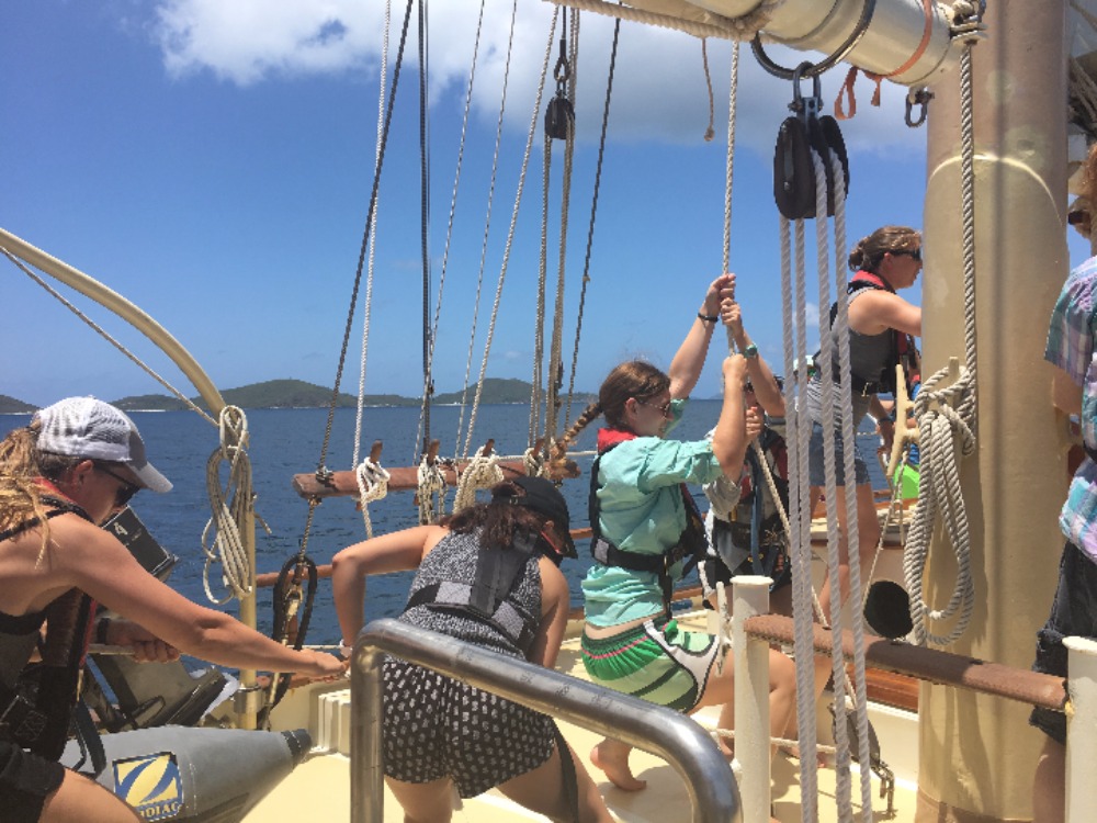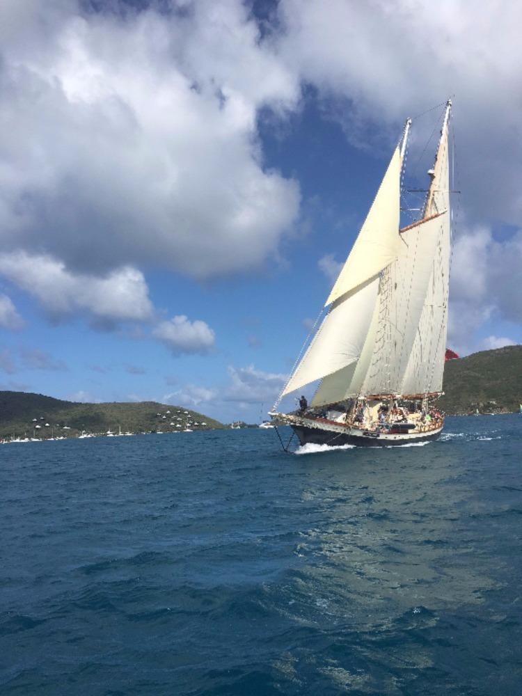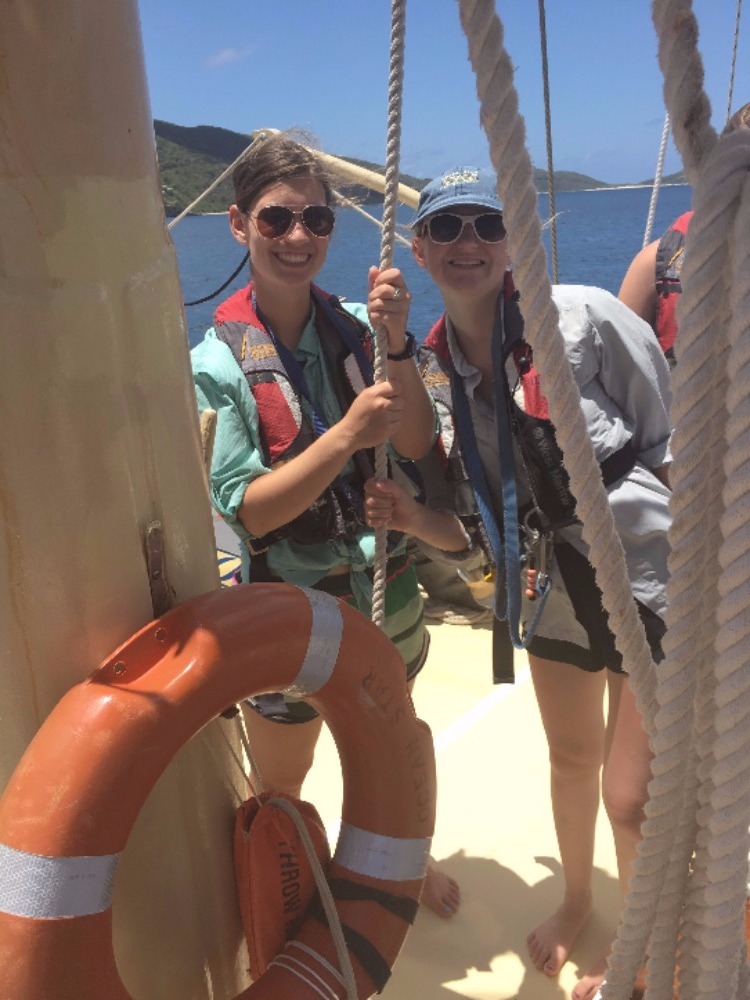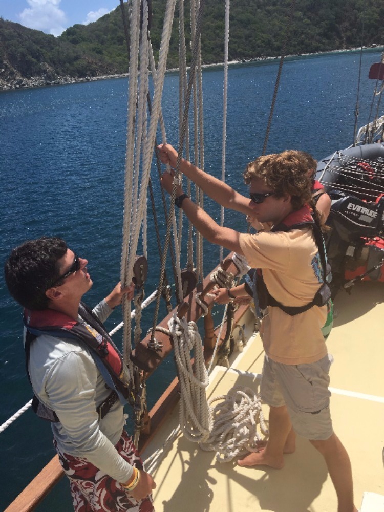 Today was our first intensive day allotted to sail training! After a spectacular breakfast of French toast and, let’s be honest, mostly Nutella, we went over some safety procedures and eventually got underway. We drilled and practiced with the fire hose, had the opportunity to attempt a man overboard procedure as Shelby lost her hat, and Anya sighted it in the water five minutes later. We managed to get all six sails flying during the passage from Mountain Point to North Sound and entered our anchorage sailing with five, a feat which earned us a lot of compliments because Ocean Star is a gorgeous ship. Now, everyone onboard can name the majority of the lines, can tack with a flying jib and jib run-up, can rig up a fisherman sail, and can comfortably speak using complex nautical vocabulary terms. We did a lot of tacks for practice, and almost everyone got a chance to be a helmsman. During this evening’s squeeze question, I learned that, given the opportunity to have any animal, real or extinct, or imaginary, as a pet, about half the crew would choose dogs. Luckily, we had a Velociraptor, a dragon, and a phoenix, so I guess that somewhat redeems my crewmate’s lack of originality. But seriously, only dogs?!?! As for other fun stories, Shelby decided that the best spot to sit on the boat is the windward aft cap rail with your arms hung over lifelines, and got everyone to join her there and share about their best day of college. A bystander said Ocean Star was the “most beautiful ship I’ve seen all week,” when she’s clearly the most beautiful he’s seen in his life. Ian claims that we are currently anchored by the yacht club where Taylor Swift and Harry Styles broke up, so I think I know what music we’ll be waking up to tomorrow. It was fantastic to finally spend a day sailing, and I can’t wait for the longer passages coming up soon!