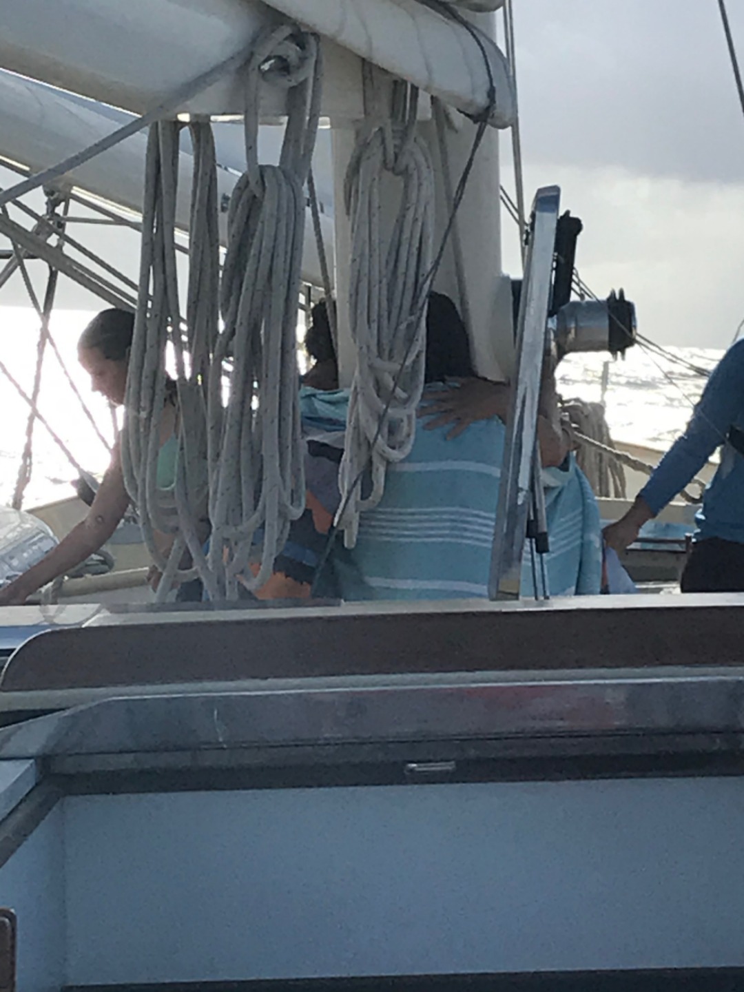 Our “mast hug” that we sometimes do during deck showers