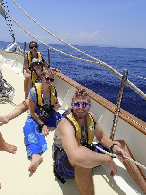 Early mornings are pretty much an everyday thing aboard Argo because who wants to waste away a day on a sailboat? After a delicious meal of eggs, which, by the way, don’t necessarily have to be refrigerated to stay good, we did a brief cleanup and started class. Today’s class was a little different than usual. Our marine biology class just happened to be on the deck, where we divided into two groups. Half of the group dissected squids, while the other half got to clean the filters on Argo until we switched. In the filters, we found barnacles, crabs, algae, and some weird water spiders that nobody had ever really seen before. During the squid dissection, we used the pen (an internalized shell) and ink in the squid to write our names. The class was exciting for both students as well as locals walking down the dock, yearning to learn. They could have been just drooling over our 112-foot Marconi schooner, but who knows? By ten in the morning, we had left the dock and started our day of sailing around Benoa while practicing our drills. Soon after departing, we had all five sails up and were both mentally and physically prepared for our MOB (man overboard), fire, and abandon ship drills. Although they were new and unfamiliar to several of us, we did a really awesome job at working together quickly and efficiently as a team. The act of actually docking Argo back on the fuel dock made squid dissections look pathetic and boring to the dock watchers. A much larger boat that may or may not have been a cruise ship had not only been watching from the deck while the rest took to surrounding Argo while filming and taking pictures of us doing our everyday duties. Like honestly, we had an audience. With just over an hour of free time before dinner, we were able to help out with stuff on deck, tidy up our bunks, and finish some homework. A long and hard day calls for a solid meal, and I believe that everyone would agree that broiled chicken, mashed potatoes, and cream spinach were the perfect endings to a perfect day. The energy from our food babies aided us in conquering oceanography, where we learned about the properties of water and seawater and also began thinking about the major project that we would complete over the course of our 90-day voyage. A few competitions regarding surface tension later, we completed our day. Tired and salty, we are all ready for a much-needed night’s sleep. Until tomorrow, Argo.