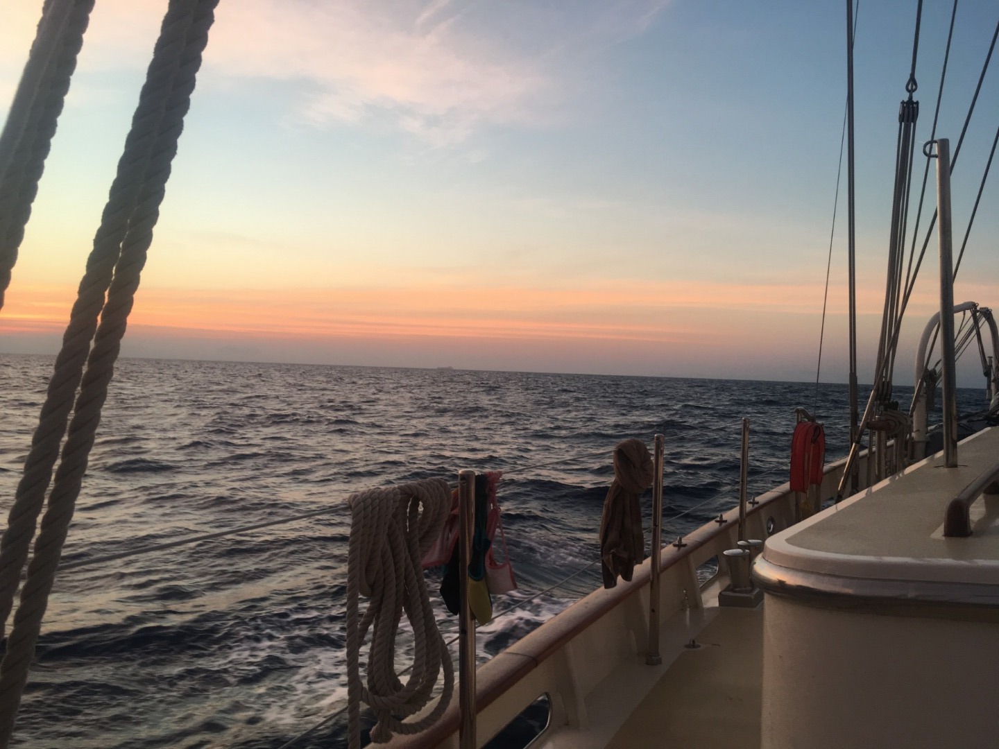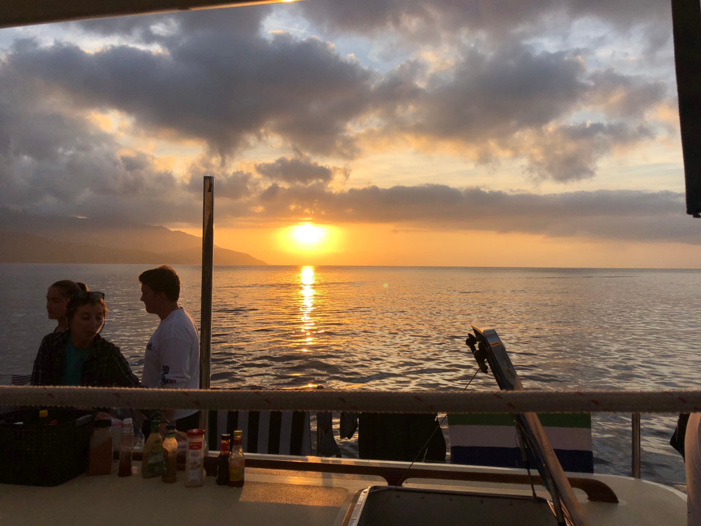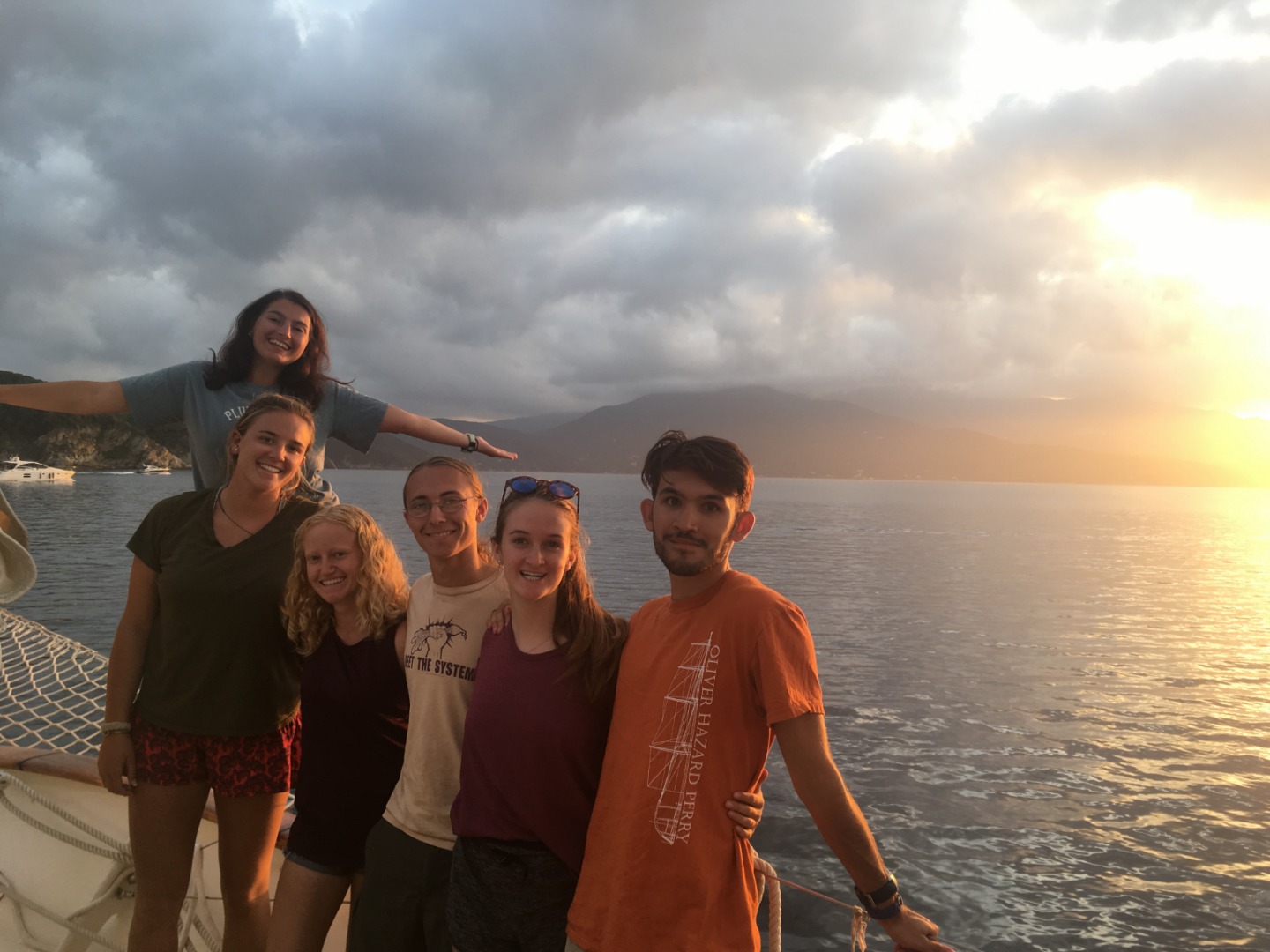 After a peaceful night sail that included a fantastic view of the stars and a beautiful sunrise, we arrived in Elba around 11:00 am. Once anchored, the crew prepared for lunch and a day full of scuba lessons. Some students spent time pulling out scuba gear onto the deck and setting it up, while others caught up on homework. Afterward, students who will be receiving their Open Water diving certifications hit the books and watched videos during their first lesson to prepare for their first scuba dive training tomorrow. Students earning their advanced, rescue, and divemaster certifications snorkeled along the coast of Elba in an attempt to find cool marine animals and the perfect spot for tomorrow’s dive location. Settling into the evening, the crew enjoyed mashed potatoes, pork chops, and veggies for dinner. Yum! And as I am writing this blog, the crew is cleaning up Argo and preparing for their scuba diving quizzes tonight. We are all looking forward to getting out of the classroom and going on our first scuba dive tomorrow. Depicted in these images are the early morning sunrise we saw while sailing into Elba, the crew eating dinner together in the cockpit, our sunset views for tonight, and Natalie, Jackie, Sydney, Cylas, Lexy, and Oleg posing for a picture at the bow.