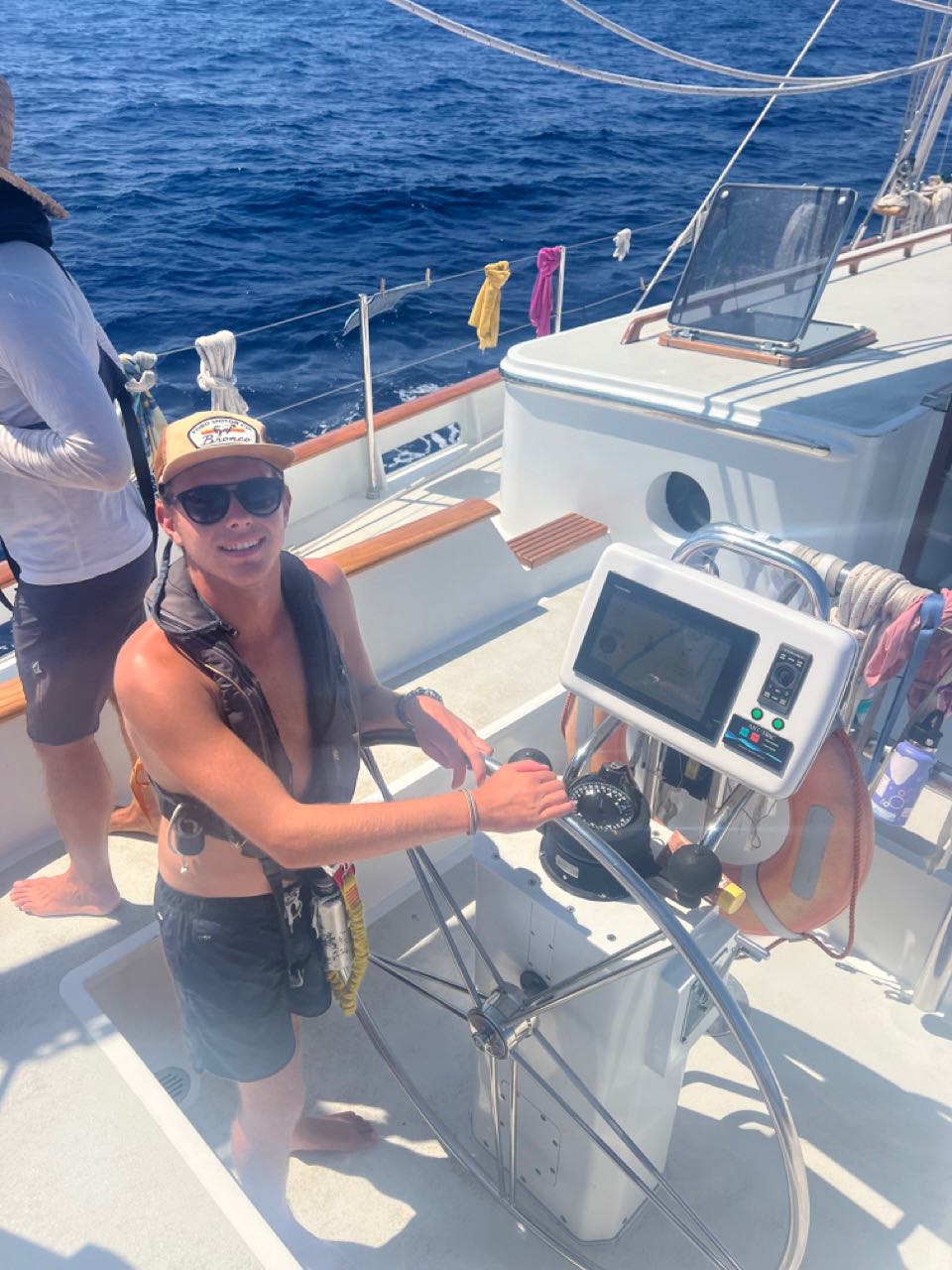We learned about the fishing industry and the consequences of overfishing, oceanic pollution, and the organizations that enforce regulations on marine pollution (MARPOL). Nearing the end of our second lecture, we were told the wind had died, and we were going to have to drop the sails. This was met with a little bit of sadness because sailing is awesome. However, we were surprised with a fun swim in the middle of the Med after this sail handing, it all worth it. Will did a couple of sick tricks, Zoe got her first backflip (It was amazing), and Emma started practicing gainers. Most shockingly of all, Tom got in the water. Most of the students haven’t seen Tom swim throughout the whole trip. After our amazing swim session, we all went our own ways until dinner. The chefs went to the galley, Watch team two and I went to the cockpit, and everyone else went into free time. For dinner, we enjoyed some (I don’t remember). After a nice meal, we all got together for a squeeze. The squeeze question was pretty typical, but we finished off with a game of Duck-Duck-Goose around the squeeze circle.