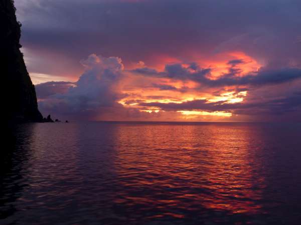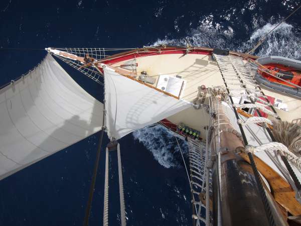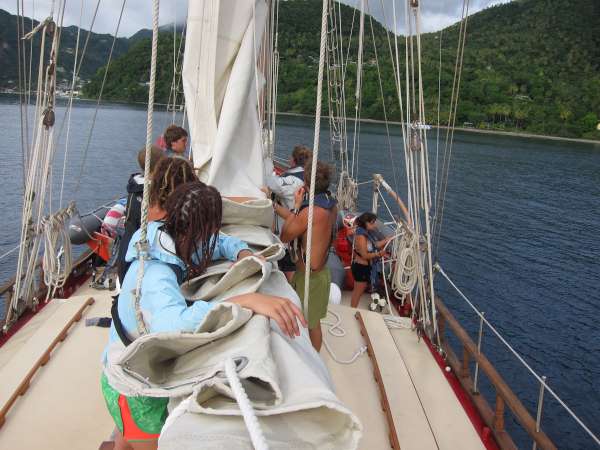 It was an early morning for the crew of Ocean Star today. The wake-up music started at 0700, leading immediately to getting underway before breakfast. We pulled the sail covers off but were disappointed to discover that the wind was effectively nil, so we held off on raising the sails. As we made our way up the rugged coast of St. Vincent, we kept an eye out for fresh winds, which we finally found at the north end of the island. The steep green fins of land leading to the volcanic summit of La Soufriere were the background for a student-led sail raise. With the sails full and Ocean Star holding steady at 6 knots., we pointed the bowsprit at the jagged tooth-like profile of the Pitons rising from St. Lucia. Making excellent time, we started easing the halyards to drop sail around 1530 and had picked up a mooring from the Marine Park rangers by 1600. The crew set to work putting sail covers on and giving the deck a thorough wash to the beat of local music wafting over from a Sunday beach barbecue. The last light of the sun lit up the clouds to the west in brilliant orange. We watched as lightning bugs on the looming hillside of Petit Piton flashed brightly in the jungle foliage.