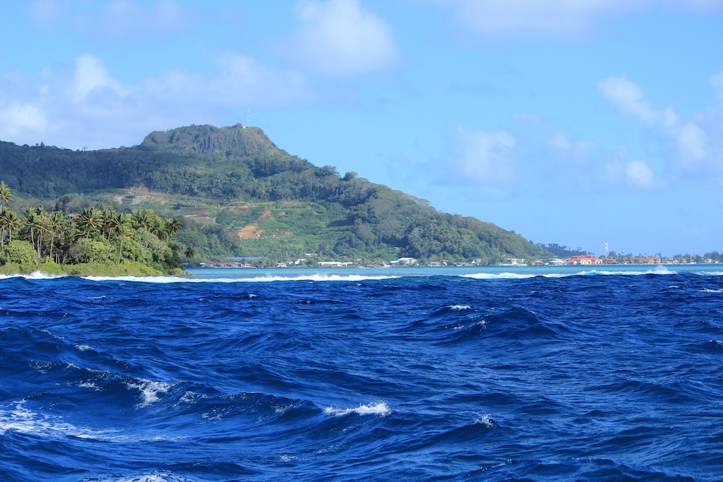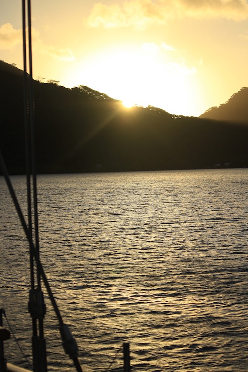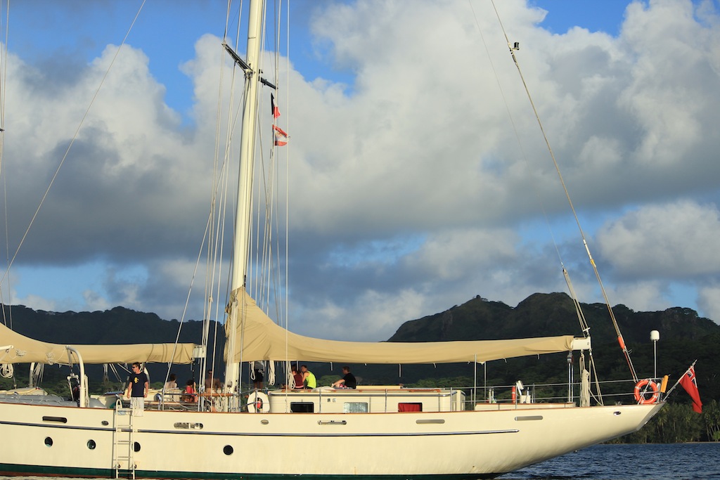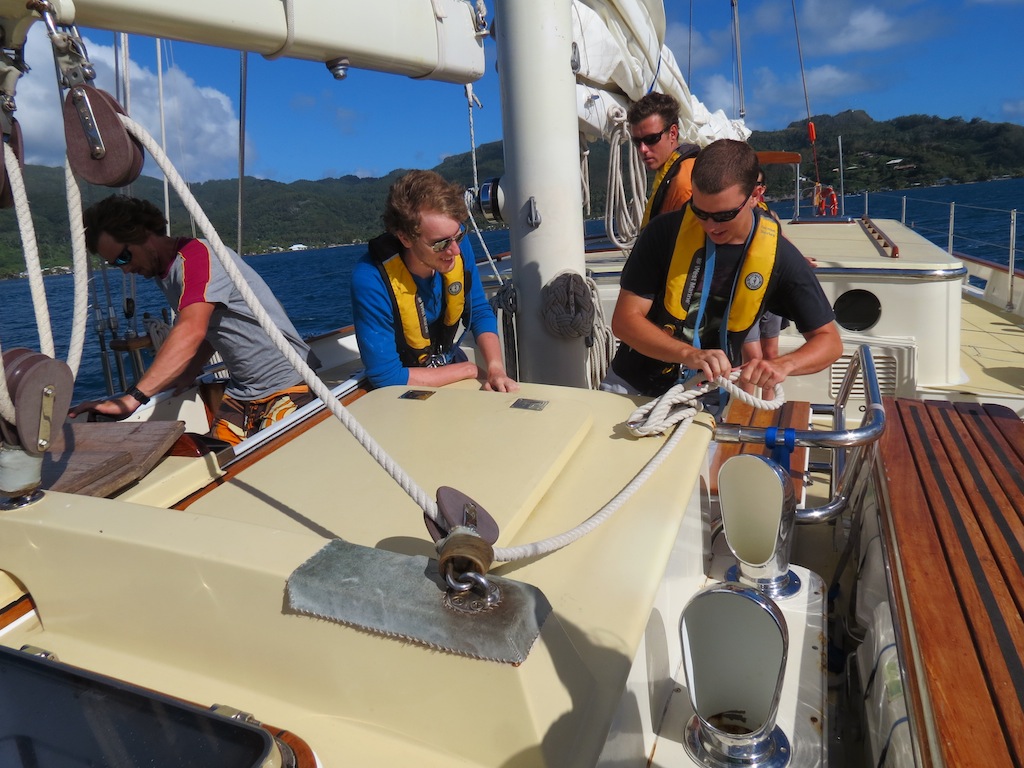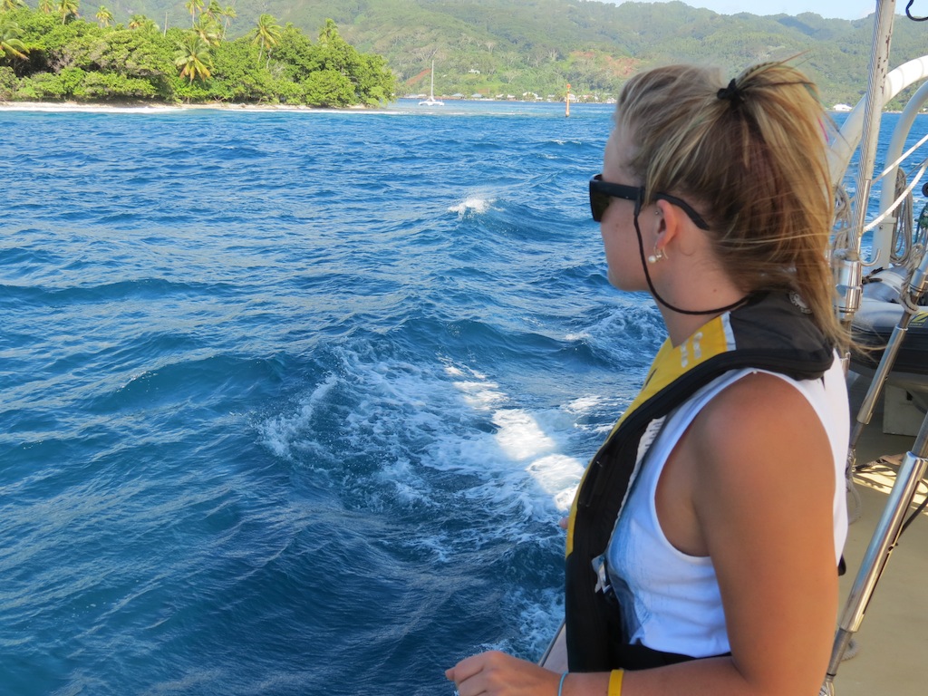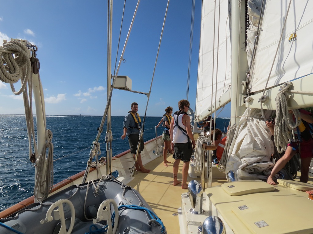 Today, we left the lovely island of Raiatea and made our short voyage to our next destination, Huahine. With the spirit of adventure in our hearts and banana bread in our stomachs, we set sail early this morning and crossed an exceedingly turbulent stretch of sea. Much fun was had, and clothes drenched when several of us decided to sit on the bow of Argo as it rose and fell. During this passage, we had our first class occur while underway. While shouting over the winds and excellent usage of the expo-board, in the absence of power points, the class was successfully conducted on deck by sponge enthusiast Matty. After the excursion between islands, we entered a gorgeous Port Bourayne, where we discovered a breathtaking view, superb waters, and an impressive set of tan lines.